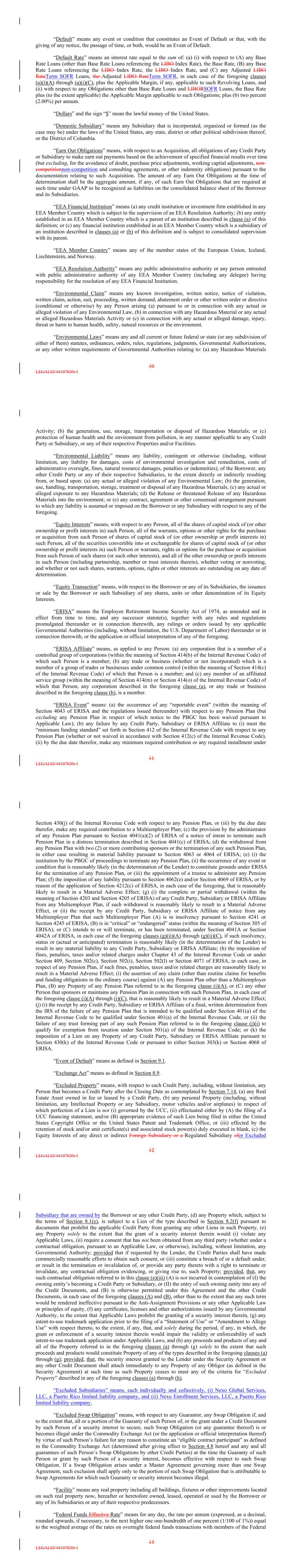 “Default” means any event or condition that constitutes an Event of Default or that, with the giving of any notice, the passage of time, or both, would be an Event of Default. “Default Rate” means an interest rate equal to the sum of: (a) (i) with respect to (A) any Base Rate Loans (other than Base Rate Loans referencing the LIBO Index Rate), the Base Rate, (B) any Base Rate Loans referencing the LIBO Index Rate, the LIBO Index Rate, and (C) any Adjusted LIBO RateTerm SOFR Loans, the Adjusted LIBO RateTerm SOFR, in each case of the foregoing clauses (a)(i)(A) through (a)(i)(C), plus the Applicable Margin, if any, applicable to such Revolving Loans, and (ii) with respect to any Obligations other than Base Rate Loans and LIBORSOFR Loans, the Base Rate plus (to the extent applicable) the Applicable Margin applicable to such Obligations; plus (b) two percent (2.00%) per annum. “Dollars” and the sign “$” mean the lawful money of the United States. “Domestic Subsidiary” means any Subsidiary that is incorporated, organized or formed (as the case may be) under the laws of the United States, any state, district or other political subdivision thereof, or the District of Columbia. “Earn Out Obligations” means, with respect to an Acquisition, all obligations of any Credit Party or Subsidiary to make earn out payments based on the achievement of specified financial results over time (but excluding, for the avoidance of doubt, purchase price adjustments, working capital adjustments, non- competitionnon-competition and consulting agreements, or other indemnity obligations) pursuant to the documentation relating to such Acquisition. The amount of any Earn Out Obligations at the time of determination shall be the aggregate amount, if any, of such Earn Out Obligations that are required at such time under GAAP to be recognized as liabilities on the consolidated balance sheet of the Borrower and its Subsidiaries. “EEA Financial Institution” means (a) any credit institution or investment firm established in any EEA Member Country which is subject to the supervision of an EEA Resolution Authority; (b) any entity established in an EEA Member Country which is a parent of an institution described in clause (a) of this definition; or (c) any financial institution established in an EEA Member Country which is a subsidiary of an institution described in clauses (a) or (b) of this definition and is subject to consolidated supervision with its parent. “EEA Member Country” means any of the member states of the European Union, Iceland, Liechtenstein, and Norway. “EEA Resolution Authority” means any public administrative authority or any person entrusted with public administrative authority of any EEA Member Country (including any delegee) having responsibility for the resolution of any EEA Financial Institution. “Environmental Claim” means any known investigation, written notice, notice of violation, written claim, action, suit, proceeding, written demand, abatement order or other written order or directive (conditional or otherwise) by any Person arising (a) pursuant to or in connection with any actual or alleged violation of any Environmental Law, (b) in connection with any Hazardous Material or any actual or alleged Hazardous Materials Activity or (c) in connection with any actual or alleged damage, injury, threat or harm to human health, safety, natural resources or the environment. “Environmental Laws” means any and all current or future federal or state (or any subdivision of either of them) statutes, ordinances, orders, rules, regulations, judgments, Governmental Authorizations, or any other written requirements of Governmental Authorities relating to: (a) any Hazardous Materials 10 LEGAL02/44107030v1 Activity; (b) the generation, use, storage, transportation or disposal of Hazardous Materials; or (c) protection of human health and the environment from pollution, in any manner applicable to any Credit Party or Subsidiary, or any of their respective Properties and/or Facilities. “Environmental Liability” means any liability, contingent or otherwise (including, without limitation, any liability for damages, costs of environmental investigation and remediation, costs of administrative oversight, fines, natural resource damages, penalties or indemnities), of the Borrower, any other Credit Party or any of their respective Subsidiaries, to the extent directly or indirectly resulting from, or based upon: (a) any actual or alleged violation of any Environmental Law; (b) the generation, use, handling, transportation, storage, treatment or disposal of any Hazardous Materials; (c) any actual or alleged exposure to any Hazardous Materials; (d) the Release or threatened Release of any Hazardous Materials into the environment; or (e) any contract, agreement or other consensual arrangement pursuant to which any liability is assumed or imposed on the Borrower or any Subsidiary with respect to any of the foregoing. “Equity Interests” means, with respect to any Person, all of the shares of capital stock of (or other ownership or profit interests in) such Person, all of the warrants, options or other rights for the purchase or acquisition from such Person of shares of capital stock of (or other ownership or profit interests in) such Person, all of the securities convertible into or exchangeable for shares of capital stock of (or other ownership or profit interests in) such Person or warrants, rights or options for the purchase or acquisition from such Person of such shares (or such other interests), and all of the other ownership or profit interests in such Person (including partnership, member or trust interests therein), whether voting or nonvoting, and whether or not such shares, warrants, options, rights or other interests are outstanding on any date of determination. “Equity Transaction” means, with respect to the Borrower or any of its Subsidiaries, the issuance or sale