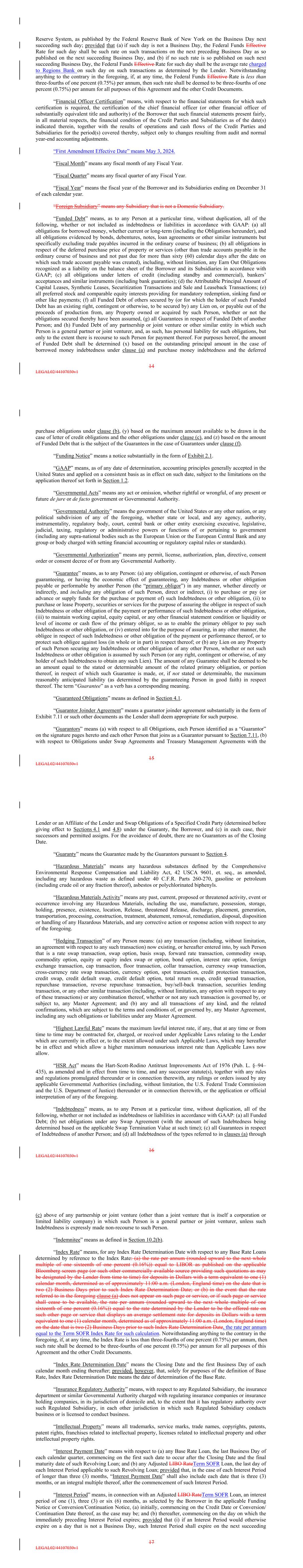 Reserve System, as published by the Federal Reserve Bank of New York on the Business Day next succeeding such day; provided that (a) if such day is not a Business Day, the Federal Funds Effective Rate for such day shall be such rate on such transactions on the next preceding Business Day as so published on the next succeeding Business Day, and (b) if no such rate is so published on such next succeeding Business Day, the Federal Funds Effective Rate for such day shall be the average rate charged to Regions Bank on such day on such transactions as determined by the Lender. Notwithstanding anything to the contrary in the foregoing, if, at any time, the Federal Funds Effective Rate is less than three-fourths of one percent (0.75%) per annum, then such rate shall be deemed to be three-fourths of one percent (0.75%) per annum for all purposes of this Agreement and the other Credit Documents. “Financial Officer Certification” means, with respect to the financial statements for which such certification is required, the certification of the chief financial officer (or other financial officer of substantially equivalent title and authority) of the Borrower that such financial statements present fairly, in all material respects, the financial condition of the Credit Parties and Subsidiaries as of the date(s) indicated therein, together with the results of operations and cash flows of the Credit Parties and Subsidiaries for the period(s) covered thereby, subject only to changes resulting from audit and normal year-end accounting adjustments. “First Amendment Effective Date” means May 3, 2024. “Fiscal Month” means any fiscal month of any Fiscal Year. “Fiscal Quarter” means any fiscal quarter of any Fiscal Year. “Fiscal Year” means the fiscal year of the Borrower and its Subsidiaries ending on December 31 of each calendar year. “Foreign Subsidiary” means any Subsidiary that is not a Domestic Subsidiary. “Funded Debt” means, as to any Person at a particular time, without duplication, all of the following, whether or not included as indebtedness or liabilities in accordance with GAAP: (a) all obligations for borrowed money, whether current or long-term (including the Obligations hereunder), and all obligations evidenced by bonds, debentures, notes, loan agreements or other similar instruments but specifically excluding trade payables incurred in the ordinary course of business; (b) all obligations in respect of the deferred purchase price of property or services (other than trade accounts payable in the ordinary course of business and not past due for more than sixty (60) calendar days after the date on which such trade account payable was created), including, without limitation, any Earn Out Obligations recognized as a liability on the balance sheet of the Borrower and its Subsidiaries in accordance with GAAP; (c) all obligations under letters of credit (including standby and commercial), bankers’ acceptances and similar instruments (including bank guaranties); (d) the Attributable Principal Amount of Capital Leases, Synthetic Leases, Securitization Transactions and Sale and Leaseback Transactions; (e) all preferred stock and comparable equity interests providing for mandatory redemption, sinking fund or other like payments; (f) all Funded Debt of others secured by (or for which the holder of such Funded Debt has an existing right, contingent or otherwise, to be secured by) any Lien on, or payable out of the proceeds of production from, any Property owned or acquired by such Person, whether or not the obligations secured thereby have been assumed, (g) all Guarantees in respect of Funded Debt of another Person; and (h) Funded Debt of any partnership or joint venture or other similar entity in which such Person is a general partner or joint venturer, and, as such, has personal liability for such obligations, but only to the extent there is recourse to such Person for payment thereof. For purposes hereof, the amount of Funded Debt shall be determined (x) based on the outstanding principal amount in the case of borrowed money indebtedness under clause (a) and purchase money indebtedness and the deferred 14 LEGAL02/44107030v1 purchase obligations under clause (b), (y) based on the maximum amount available to be drawn in the case of letter of credit obligations and the other obligations under clause (c), and (z) based on the amount of Funded Debt that is the subject of the Guarantees in the case of Guarantees under clause (f). “Funding Notice” means a notice substantially in the form of Exhibit 2.1. “GAAP” means, as of any date of determination, accounting principles generally accepted in the United States and applied on a consistent basis as in effect on such date, subject to the limitations on the application thereof set forth in Section 1.2. “Governmental Acts” means any act or omission, whether rightful or wrongful, of any present or future de jure or de facto government or Governmental Authority. “Governmental Authority” means the government of the United States or any other nation, or any political subdivision of any of the foregoing, whether state or local, and any agency, authority, instrumentality, regulatory body, court, central bank or other entity exercising executive, legislative, judicial, taxing, regulatory or administrative powers or functions of or pertaining to government (including any supra-national bodies such as the European Union or the European Central Bank and any group or body charged with setting financial accounting or regulatory capital rules or standards). “Governmental Authorization” means any permit, license, authorization, plan, directive, consent order or consent decree of or from any Governmental Authority. “Guarantee” means, as to any Person: (a) any obligation, contingent or otherwise, of such Person guaranteeing, or having the economic effect of guaranteeing, any Indebtedness or other obligation payable or performable
