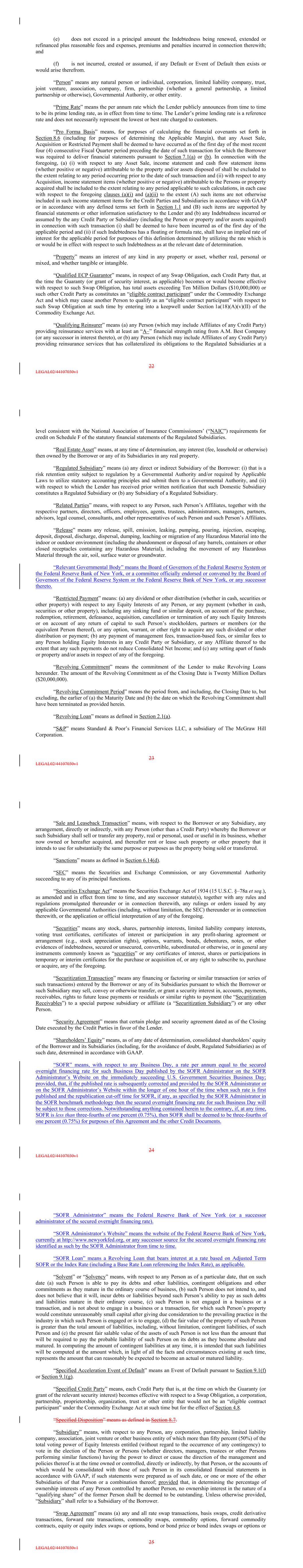 (e) does not exceed in a principal amount the Indebtedness being renewed, extended or refinanced plus reasonable fees and expenses, premiums and penalties incurred in connection therewith; and (f) is not incurred, created or assumed, if any Default or Event of Default then exists or would arise therefrom. “Person” means any natural person or individual, corporation, limited liability company, trust, joint venture, association, company, firm, partnership (whether a general partnership, a limited partnership or otherwise), Governmental Authority, or other entity. “Prime Rate” means the per annum rate which the Lender publicly announces from time to time to be its prime lending rate, as in effect from time to time. The Lender’s prime lending rate is a reference rate and does not necessarily represent the lowest or best rate charged to customers. “Pro Forma Basis” means, for purposes of calculating the financial covenants set forth in Section 8.6 (including for purposes of determining the Applicable Margin), that any Asset Sale, Acquisition or Restricted Payment shall be deemed to have occurred as of the first day of the most recent four (4) consecutive Fiscal Quarter period preceding the date of such transaction for which the Borrower was required to deliver financial statements pursuant to Section 7.1(a) or (b). In connection with the foregoing, (a) (i) with respect to any Asset Sale, income statement and cash flow statement items (whether positive or negative) attributable to the property and/or assets disposed of shall be excluded to the extent relating to any period occurring prior to the date of such transaction and (ii) with respect to any Acquisition, income statement items (whether positive or negative) attributable to the Persons or property acquired shall be included to the extent relating to any period applicable to such calculations, in each case with respect to the foregoing clauses (a)(i) and (a)(ii) to the extent (A) such items are not otherwise included in such income statement items for the Credit Parties and Subsidiaries in accordance with GAAP or in accordance with any defined terms set forth in Section 1.1 and (B) such items are supported by financial statements or other information satisfactory to the Lender and (b) any Indebtedness incurred or assumed by the any Credit Party or Subsidiary (including the Person or property and/or assets acquired) in connection with such transaction (i) shall be deemed to have been incurred as of the first day of the applicable period and (ii) if such Indebtedness has a floating or formula rate, shall have an implied rate of interest for the applicable period for purposes of this definition determined by utilizing the rate which is or would be in effect with respect to such Indebtedness as at the relevant date of determination. “Property” means an interest of any kind in any property or asset, whether real, personal or mixed, and whether tangible or intangible. “Qualified ECP Guarantor” means, in respect of any Swap Obligation, each Credit Party that, at the time the Guaranty (or grant of security interest, as applicable) becomes or would become effective with respect to such Swap Obligation, has total assets exceeding Ten Million Dollars ($10,000,000) or such other Credit Party as constitutes an “eligible contract participant” under the Commodity Exchange Act and which may cause another Person to qualify as an “eligible contract participant” with respect to such Swap Obligation at such time by entering into a keepwell under Section 1a(18)(A)(v)(II) of the Commodity Exchange Act. “Qualifying Reinsurer” means (a) any Person (which may include Affiliates of any Credit Party) providing reinsurance services with at least an “A–” financial strength rating from A.M. Best Company (or any successor in interest thereto), or (b) any Person (which may include Affiliates of any Credit Party) providing reinsurance services that has collateralized its obligations to the Regulated Subsidiaries at a 22 LEGAL02/44107030v1 level consistent with the National Association of Insurance Commissioners’ (“NAIC”) requirements for credit on Schedule F of the statutory financial statements of the Regulated Subsidiaries. “Real Estate Asset” means, at any time of determination, any interest (fee, leasehold or otherwise) then owned by the Borrower or any of its Subsidiaries in any real property. “Regulated Subsidiary” means (a) any direct or indirect Subsidiary of the Borrower: (i) that is a risk retention entity subject to regulation by a Governmental Authority and/or required by Applicable Laws to utilize statutory accounting principles and submit them to a Governmental Authority, and (ii) with respect to which the Lender has received prior written notification that such Domestic Subsidiary constitutes a Regulated Subsidiary or (b) any Subsidiary of a Regulated Subsidiary. “Related Parties” means, with respect to any Person, such Person’s Affiliates, together with the respective partners, directors, officers, employees, agents, trustees, administrators, managers, partners, advisors, legal counsel, consultants, and other representatives of such Person and such Person’s Affiliates. “Release” means any release, spill, emission, leaking, pumping, pouring, injection, escaping, deposit, disposal, discharge, dispersal, dumping, leaching or migration of any Hazardous Material into the indoor or outdoor environment (including the abandonment or disposal of any barrels, containers or other closed receptacles containing any Hazardous Material), including the movement of any Hazardous Material through the air, soil, surface water or groundwater. “Relevant Governmental Body” means the Board of Governors of the Federal Reserve System or the Federal Reserve Bank of New York, or a committee officially endorsed or convened by the Board of Governors of the Federal Reserve System or the Federal Reserve Bank of New Y