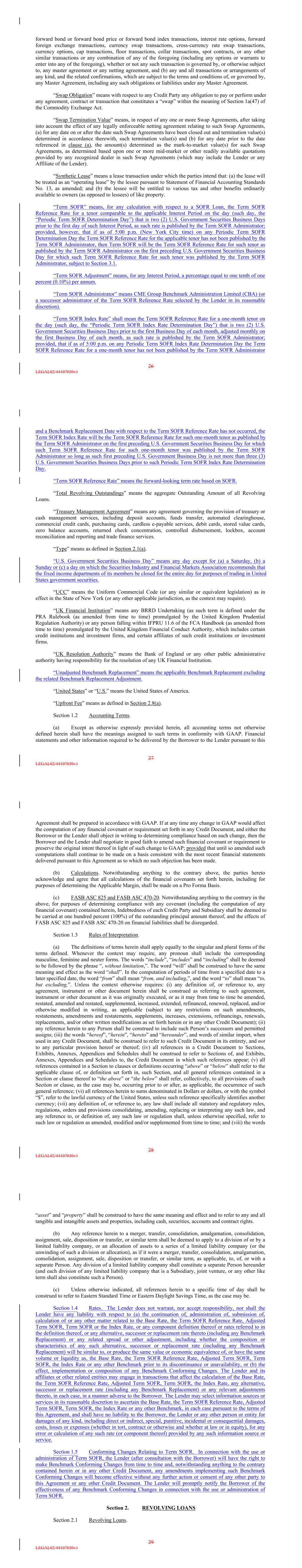 forward bond or forward bond price or forward bond index transactions, interest rate options, forward foreign exchange transactions, currency swap transactions, cross-currency rate swap transactions, currency options, cap transactions, floor transactions, collar transactions, spot contracts, or any other similar transactions or any combination of any of the foregoing (including any options or warrants to enter into any of the foregoing), whether or not any such transaction is governed by, or otherwise subject to, any master agreement or any netting agreement, and (b) any and all transactions or arrangements of any kind, and the related confirmations, which are subject to the terms and conditions of, or governed by, any Master Agreement, including any such obligations or liabilities under any Master Agreement. “Swap Obligation” means with respect to any Credit Party any obligation to pay or perform under any agreement, contract or transaction that constitutes a “swap” within the meaning of Section 1a(47) of the Commodity Exchange Act. “Swap Termination Value” means, in respect of any one or more Swap Agreements, after taking into account the effect of any legally enforceable netting agreement relating to such Swap Agreements, (a) for any date on or after the date such Swap Agreements have been closed out and termination value(s) determined in accordance therewith, such termination value(s) and (b) for any date prior to the date referenced in clause (a), the amount(s) determined as the mark-to-market value(s) for such Swap Agreements, as determined based upon one or more mid-market or other readily available quotations provided by any recognized dealer in such Swap Agreements (which may include the Lender or any Affiliate of the Lender). “Synthetic Lease” means a lease transaction under which the parties intend that: (a) the lease will be treated as an “operating lease” by the lessee pursuant to Statement of Financial Accounting Standards No. 13, as amended; and (b) the lessee will be entitled to various tax and other benefits ordinarily available to owners (as opposed to lessees) of like property. “Term SOFR” means, for any calculation with respect to a SOFR Loan, the Term SOFR Reference Rate for a tenor comparable to the applicable Interest Period on the day (such day, the “Periodic Term SOFR Determination Day”) that is two (2) U.S. Government Securities Business Days prior to the first day of such Interest Period, as such rate is published by the Term SOFR Administrator; provided, however, that if as of 5:00 p.m. (New York City time) on any Periodic Term SOFR Determination Day the Term SOFR Reference Rate for the applicable tenor has not been published by the Term SOFR Administrator, then Term SOFR will be the Term SOFR Reference Rate for such tenor as published by the Term SOFR Administrator on the first preceding U.S. Government Securities Business Day for which such Term SOFR Reference Rate for such tenor was published by the Term SOFR Administrator, subject to Section 3.1. “Term SOFR Adjustment” means, for any Interest Period, a percentage equal to one tenth of one percent (0.10%) per annum. “Term SOFR Administrator” means CME Group Benchmark Administration Limited (CBA) (or a successor administrator of the Term SOFR Reference Rate selected by the Lender in its reasonable discretion). “Term SOFR Index Rate” shall mean the Term SOFR Reference Rate for a one-month tenor on the day (such day, the “Periodic Term SOFR Index Rate Determination Day”) that is two (2) U.S. Government Securities Business Days prior to the first Business Day of each month, adjusted monthly on the first Business Day of each month, as such rate is published by the Term SOFR Administrator; provided, that if as of 5:00 p.m. on any Periodic Term SOFR Index Rate Determination Day the Term SOFR Reference Rate for a one-month tenor has not been published by the Term SOFR Administrator 26 LEGAL02/44107030v1 and a Benchmark Replacement Date with respect to the Term SOFR Reference Rate has not occurred, the Term SOFR Index Rate will be the Term SOFR Reference Rate for such one-month tenor as published by the Term SOFR Administrator on the first preceding U.S. Government Securities Business Day for which such Term SOFR Reference Rate for such one-month tenor was published by the Term SOFR Administrator so long as such first preceding U.S. Government Business Day is not more than three (3) U.S. Government Securities Business Days prior to such Periodic Term SOFR Index Rate Determination Day. “Term SOFR Reference Rate” means the forward-looking term rate based on SOFR. “Total Revolving Outstandings” means the aggregate Outstanding Amount of all Revolving Loans. “Treasury Management Agreement” means any agreement governing the provision of treasury or cash management services, including deposit accounts, funds transfer, automated clearinghouse, commercial credit cards, purchasing cards, cardless e-payable services, debit cards, stored value cards, zero balance accounts, returned check concentration, controlled disbursement, lockbox, account reconciliation and reporting and trade finance services. “Type” means as defined in Section 2.1(a). “U.S. Government Securities Business Day” means any day except for (a) a Saturday, (b) a Sunday or (c) a day on which the Securities Industry and Financial Markets Association recommends that the fixed income departments of its members be closed for the entire day for purposes of trading in United States government securities. “UCC” means the Uniform Commercial Code (or any similar or equivalent legislation) as in effect in the State of New York (or any other applicable jurisdiction, as the context may require). “UK Financial Institution” means any BRRD Undertaking (as such term is defined under the PRA Rulebook (as amended from time to time) promulgated by the United Kingdom Prudential Regulation Authority) or any pers
