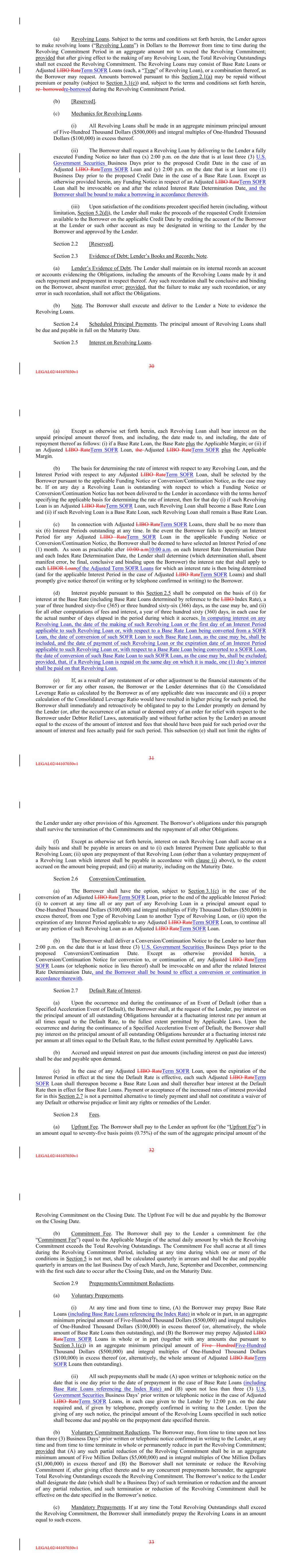 (a) Revolving Loans. Subject to the terms and conditions set forth herein, the Lender agrees to make revolving loans (“Revolving Loans”) in Dollars to the Borrower from time to time during the Revolving Commitment Period in an aggregate amount not to exceed the Revolving Commitment; provided that after giving effect to the making of any Revolving Loan, the Total Revolving Outstandings shall not exceed the Revolving Commitment. The Revolving Loans may consist of Base Rate Loans or Adjusted LIBO RateTerm SOFR Loans (each, a “Type” of Revolving Loan), or a combination thereof, as the Borrower may request. Amounts borrowed pursuant to this Section 2.1(a) may be repaid without premium or penalty (subject to Section 3.1(c)) and, subject to the terms and conditions set forth herein, re- borrowedre-borrowed during the Revolving Commitment Period. (b) [Reserved]. (c) Mechanics for Revolving Loans. (i) All Revolving Loans shall be made in an aggregate minimum principal amount of Five-Hundred Thousand Dollars ($500,000) and integral multiples of One-Hundred Thousand Dollars ($100,000) in excess thereof. (ii) The Borrower shall request a Revolving Loan by delivering to the Lender a fully executed Funding Notice no later than (x) 2:00 p.m. on the date that is at least three (3) U.S. Government Securities Business Days prior to the proposed Credit Date in the case of an Adjusted LIBO RateTerm SOFR Loan and (y) 2:00 p.m. on the date that is at least one (1) Business Day prior to the proposed Credit Date in the case of a Base Rate Loan. Except as otherwise provided herein, any Funding Notice in respect of an Adjusted LIBO RateTerm SOFR Loan shall be irrevocable on and after the related Interest Rate Determination Date, and the Borrower shall be bound to make a borrowing in accordance therewith. (iii) Upon satisfaction of the conditions precedent specified herein (including, without limitation, Section 5.2(d)), the Lender shall make the proceeds of the requested Credit Extension available to the Borrower on the applicable Credit Date by crediting the account of the Borrower at the Lender or such other account as may be designated in writing to the Lender by the Borrower and approved by the Lender. Section 2.2 [Reserved]. Section 2.3 Evidence of Debt; Lender’s Books and Records; Note. (a) Lender’s Evidence of Debt. The Lender shall maintain on its internal records an account or accounts evidencing the Obligations, including the amounts of the Revolving Loans made by it and each repayment and prepayment in respect thereof. Any such recordation shall be conclusive and binding on the Borrower, absent manifest error; provided, that the failure to make any such recordation, or any error in such recordation, shall not affect the Obligations. (b) Note. The Borrower shall execute and deliver to the Lender a Note to evidence the Revolving Loans. Section 2.4 Scheduled Principal Payments. The principal amount of Revolving Loans shall be due and payable in full on the Maturity Date. Section 2.5 Interest on Revolving Loans. 30 LEGAL02/44107030v1 (a) Except as otherwise set forth herein, each Revolving Loan shall bear interest on the unpaid principal amount thereof from, and including, the date made to, and including, the date of repayment thereof as follows: (i) if a Base Rate Loan, the Base Rate plus the Applicable Margin; or (ii) if an Adjusted LIBO RateTerm SOFR Loan, the Adjusted LIBO RateTerm SOFR plus the Applicable Margin. (b) The basis for determining the rate of interest with respect to any Revolving Loan, and the Interest Period with respect to any Adjusted LIBO RateTerm SOFR Loan, shall be selected by the Borrower pursuant to the applicable Funding Notice or Conversion/Continuation Notice, as the case may be. If on any day a Revolving Loan is outstanding with respect to which a Funding Notice or Conversion/Continuation Notice has not been delivered to the Lender in accordance with the terms hereof specifying the applicable basis for determining the rate of interest, then for that day (i) if such Revolving Loan is an Adjusted LIBO RateTerm SOFR Loan, such Revolving Loan shall become a Base Rate Loan and (ii) if such Revolving Loan is a Base Rate Loan, such Revolving Loan shall remain a Base Rate Loan. (c) In connection with Adjusted LIBO RateTerm SOFR Loans, there shall be no more than six (6) Interest Periods outstanding at any time. In the event the Borrower fails to specify an Interest Period for any Adjusted LIBO RateTerm SOFR Loan in the applicable Funding Notice or Conversion/Continuation Notice, the Borrower shall be deemed to have selected an Interest Period of one (1) month. As soon as practicable after 10:00 a.m10:00 a.m. on each Interest Rate Determination Date and each Index Rate Determination Date, the Lender shall determine (which determination shall, absent manifest error, be final, conclusive and binding upon the Borrower) the interest rate that shall apply to each LIBOR Loanof the Adjusted Term SOFR Loans for which an interest rate is then being determined (and for the applicable Interest Period in the case of Adjusted LIBO RateTerm SOFR Loans) and shall promptly give notice thereof (in writing or by telephone confirmed in writing) to the Borrower. (d) Interest payable pursuant to this Section 2.5 shall be computed on the basis of (i) for interest at the Base Rate (including Base Rate Loans determined by reference to the LIBO Index Rate), a year of three hundred sixty-five (365) or three hundred sixty-six (366) days, as the case may be, and (ii) for all other computations of fees and interest, a year of three hundred sixty (360) days, in each case for the actual number of days elapsed in the period during which it accrues. In computing interest on any Revolving Loan, the date of the making of such Revolving Loan or the first day of an Interest Period applicable to such Revolving Loan or, with respect to a Base Rate Loan being converted from a SOFR Loan, the date of conversion of 