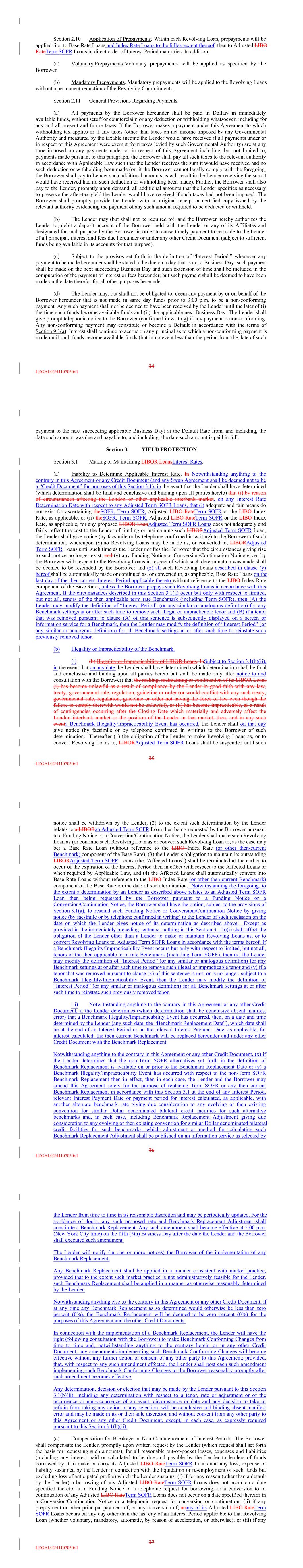 Section 2.10 Application of Prepayments. Within each Revolving Loan, prepayments will be applied first to Base Rate Loans and Index Rate Loans to the fullest extent thereof, then to Adjusted LIBO RateTerm SOFR Loans in direct order of Interest Period maturities. In addition: (a) Voluntary Prepayments.Voluntary prepayments will be applied as specified by the Borrower. (b) Mandatory Prepayments. Mandatory prepayments will be applied to the Revolving Loans without a permanent reduction of the Revolving Commitments. Section 2.11 General Provisions Regarding Payments. (a) All payments by the Borrower hereunder shall be paid in Dollars in immediately available funds, without setoff or counterclaim or any deduction or withholding whatsoever, including for any and all present and future taxes. If the Borrower makes a payment under this Agreement to which withholding tax applies or if any taxes (other than taxes on net income imposed by any Governmental Authority and measured by the taxable income the Lender would have received if all payments under or in respect of this Agreement were exempt from taxes levied by such Governmental Authority) are at any time imposed on any payments under or in respect of this Agreement including, but not limited to, payments made pursuant to this paragraph, the Borrower shall pay all such taxes to the relevant authority in accordance with Applicable Law such that the Lender receives the sum it would have received had no such deduction or withholding been made (or, if the Borrower cannot legally comply with the foregoing, the Borrower shall pay to Lender such additional amounts as will result in the Lender receiving the sum it would have received had no such deduction or withholding been made). Further, the Borrower shall also pay to the Lender, promptly upon demand, all additional amounts that the Lender specifies as necessary to preserve the after-tax yield the Lender would have received if such taxes had not been imposed. The Borrower shall promptly provide the Lender with an original receipt or certified copy issued by the relevant authority evidencing the payment of any such amount required to be deducted or withheld. (b) The Lender may (but shall not be required to), and the Borrower hereby authorizes the Lender to, debit a deposit account of the Borrower held with the Lender or any of its Affiliates and designated for such purpose by the Borrower in order to cause timely payment to be made to the Lender of all principal, interest and fees due hereunder or under any other Credit Document (subject to sufficient funds being available in its accounts for that purpose). (c) Subject to the provisos set forth in the definition of “Interest Period,” whenever any payment to be made hereunder shall be stated to be due on a day that is not a Business Day, such payment shall be made on the next succeeding Business Day and such extension of time shall be included in the computation of the payment of interest or fees hereunder, but such payment shall be deemed to have been made on the date therefor for all other purposes hereunder. (d) The Lender may, but shall not be obligated to, deem any payment by or on behalf of the Borrower hereunder that is not made in same day funds prior to 3:00 p.m. to be a non-conforming payment. Any such payment shall not be deemed to have been received by the Lender until the later of (i) the time such funds become available funds and (ii) the applicable next Business Day. The Lender shall give prompt telephonic notice to the Borrower (confirmed in writing) if any payment is non-conforming. Any non-conforming payment may constitute or become a Default in accordance with the terms of Section 9.1(a). Interest shall continue to accrue on any principal as to which a non-conforming payment is made until such funds become available funds (but in no event less than the period from the date of such 34 LEGAL02/44107030v1 payment to the next succeeding applicable Business Day) at the Default Rate from, and including, the date such amount was due and payable to, and including, the date such amount is paid in full. Section 3. YIELD PROTECTION Section 3.1 Making or Maintaining LIBOR LoansInterest Rates. (a) Inability to Determine Applicable Interest Rate. In Notwithstanding anything to the contrary in this Agreement or any Credit Document (and any Swap Agreement shall be deemed not to be a “Credit Document” for purposes of this Section 3.1), in the event that the Lender shall have determined (which determination shall be final and conclusive and binding upon all parties hereto) that (i) by reason of circumstances affecting the London or other applicable interbank market, on any Interest Rate Determination Date with respect to any Adjusted Term SOFR Loans, that (i) adequate and fair means do not exist for ascertaining theSOFR, Term SOFR, Adjusted LIBO RateTerm SOFR or the LIBO Index Rate, as applicable, or (ii) theSOFR, Term SOFR, Adjusted LIBO RateTerm SOFR or the LIBO Index Rate, as applicable, for any proposed LIBOR LoanAdjusted Term SOFR Loans does not adequately and fairly reflect the cost to the Lender of funding or maintaining such LIBORAdjusted Term SOFR Loan, the Lender shall give notice (by facsimile or by telephone confirmed in writing) to the Borrower of such determination, whereupon (x) no Revolving Loans may be made as, or converted to, LIBORAdjusted Term SOFR Loans until such time as the Lender notifies the Borrower that the circumstances giving rise to such notice no longer exist, and (y) any Funding Notice or Conversion/Continuation Notice given by the Borrower with respect to the Revolving Loans in respect of which such determination was made shall be deemed to be rescinded by the Borrower and (z) all such Revolving Loans described in clause (y) hereof shall be automatically made or continued as, or converted to, as applicable, Base Rate Loans on the last day of the then current Interest Period applicable thereto without reference
