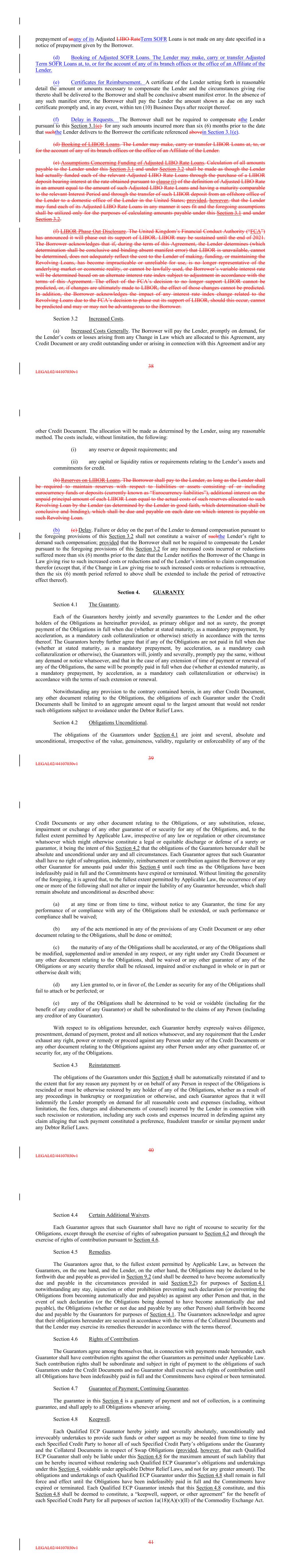 prepayment of anany of its Adjusted LIBO RateTerm SOFR Loans is not made on any date specified in a notice of prepayment given by the Borrower. (d) Booking of Adjusted SOFR Loans. The Lender may make, carry or transfer Adjusted Term SOFR Loans at, to, or for the account of any of its branch offices or the office of an Affiliate of the Lender. (e) Certificates for Reimbursement. A certificate of the Lender setting forth in reasonable detail the amount or amounts necessary to compensate the Lender and the circumstances giving rise thereto shall be delivered to the Borrower and shall be conclusive absent manifest error. In the absence of any such manifest error, the Borrower shall pay the Lender the amount shown as due on any such certificate promptly and, in any event, within ten (10) Business Days after receipt thereof. (f) Delay in Requests. The Borrower shall not be required to compensate athe Lender pursuant to this Section 3.1(c) for any such amounts incurred more than six (6) months prior to the date that suchthe Lender delivers to the Borrower the certificate referenced abovein Section 3.1(e). (d) Booking of LIBOR Loans. The Lender may make, carry or transfer LIBOR Loans at, to, or for the account of any of its branch offices or the office of an Affiliate of the Lender. (e) Assumptions Concerning Funding of Adjusted LIBO Rate Loans. Calculation of all amounts payable to the Lender under this Section 3.1 and under Section 3.2 shall be made as though the Lender had actually funded each of the relevant Adjusted LIBO Rate Loans through the purchase of a LIBOR deposit bearing interest at the rate obtained pursuant to clause (i) of the definition of Adjusted LIBO Rate in an amount equal to the amount of such Adjusted LIBO Rate Loans and having a maturity comparable to the relevant Interest Period and through the transfer of such LIBOR deposit from an offshore office of the Lender to a domestic office of the Lender in the United States; provided, however, that the Lender may fund each of its Adjusted LIBO Rate Loans in any manner it sees fit and the foregoing assumptions shall be utilized only for the purposes of calculating amounts payable under this Section 3.1 and under Section 3.2. (f) LIBOR Phase Out Disclosure. The United Kingdom’s Financial Conduct Authority (“FCA”) has announced it will phase out its support of LIBOR. LIBOR may be sustained until the end of 2021. The Borrower acknowledges that if, during the term of this Agreement, the Lender determines (which determination shall be conclusive and binding absent manifest error) that LIBOR is unavailable, cannot be determined, does not adequately reflect the cost to the Lender of making, funding, or maintaining the Revolving Loans, has become impracticable or unreliable for use, is no longer representative of the underlying market or economic reality, or cannot be lawfully used, the Borrower’s variable interest rate will be determined based on an alternate interest rate index subject to adjustment in accordance with the terms of this Agreement. The effect of the FCA’s decision to no longer support LIBOR cannot be predicted, or, if changes are ultimately made to LIBOR, the effect of those changes cannot be predicted. In addition, the Borrower acknowledges the impact of any interest rate index change related to the Revolving Loans due to the FCA’s decision to phase out its support of LIBOR, should this occur, cannot be predicted and may or may not be advantageous to the Borrower. Section 3.2 Increased Costs. (a) Increased Costs Generally. The Borrower will pay the Lender, promptly on demand, for the Lender’s costs or losses arising from any Change in Law which are allocated to this Agreement, any Credit Document or any credit outstanding under or arising in connection with this Agreement and/or any 38 LEGAL02/44107030v1 other Credit Document. The allocation will be made as determined by the Lender, using any reasonable method. The costs include, without limitation, the following: (i) any reserve or deposit requirements; and (ii) any capital or liquidity ratios or requirements relating to the Lender’s assets and commitments for credit. (b) Reserves on LIBOR Loans. The Borrower shall pay to the Lender, as long as the Lender shall be required to maintain reserves with respect to liabilities or assets consisting of or including eurocurrency funds or deposits (currently known as “Eurocurrency liabilities”), additional interest on the unpaid principal amount of each LIBOR Loan equal to the actual costs of such reserves allocated to such Revolving Loan by the Lender (as determined by the Lender in good faith, which determination shall be conclusive and binding), which shall be due and payable on each date on which interest is payable on such Revolving Loan. (b) (c) Delay. Failure or delay on the part of the Lender to demand compensation pursuant to the foregoing provisions of this Section 3.2 shall not constitute a waiver of suchthe Lender’s right to demand such compensation; provided that the Borrower shall not be required to compensate the Lender pursuant to the foregoing provisions of this Section 3.2 for any increased costs incurred or reductions suffered more than six (6) months prior to the date that the Lender notifies the Borrower of the Change in Law giving rise to such increased costs or reductions and of the Lender’s intention to claim compensation therefor (except that, if the Change in Law giving rise to such increased costs or reductions is retroactive, then the six (6) month period referred to above shall be extended to include the period of retroactive effect thereof). Section 4. GUARANTY Section 4.1 The Guaranty. Each of the Guarantors hereby jointly and severally guarantees to the Lender and the other holders of the Obligations as hereinafter provided, as primary obligor and not as surety, the prompt payment of the Obligations in full when due (whether at stated maturity, as a mandatory prepayment, b