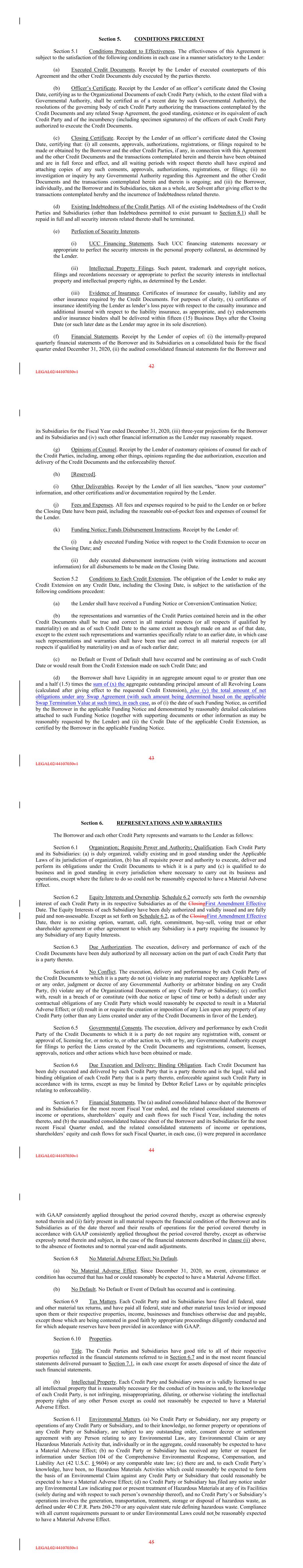 Section 5. CONDITIONS PRECEDENT Section 5.1 Conditions Precedent to Effectiveness. The effectiveness of this Agreement is subject to the satisfaction of the following conditions in each case in a manner satisfactory to the Lender: (a) Executed Credit Documents. Receipt by the Lender of executed counterparts of this Agreement and the other Credit Documents duly executed by the parties thereto. (b) Officer’s Certificate. Receipt by the Lender of an officer’s certificate dated the Closing Date, certifying as to the Organizational Documents of each Credit Party (which, to the extent filed with a Governmental Authority, shall be certified as of a recent date by such Governmental Authority), the resolutions of the governing body of each Credit Party authorizing the transactions contemplated by the Credit Documents and any related Swap Agreement, the good standing, existence or its equivalent of each Credit Party and of the incumbency (including specimen signatures) of the officers of each Credit Party authorized to execute the Credit Documents. (c) Closing Certificate. Receipt by the Lender of an officer’s certificate dated the Closing Date, certifying that: (i) all consents, approvals, authorizations, registrations, or filings required to be made or obtained by the Borrower and the other Credit Parties, if any, in connection with this Agreement and the other Credit Documents and the transactions contemplated herein and therein have been obtained and are in full force and effect, and all waiting periods with respect thereto shall have expired and attaching copies of any such consents, approvals, authorizations, registrations, or filings; (ii) no investigation or inquiry by any Governmental Authority regarding this Agreement and the other Credit Documents and the transactions contemplated herein and therein is ongoing; and (iii) the Borrower, individually, and the Borrower and its Subsidiaries, taken as a whole, are Solvent after giving effect to the transactions contemplated hereby and the incurrence of Indebtedness related thereto. (d) Existing Indebtedness of the Credit Parties. All of the existing Indebtedness of the Credit Parties and Subsidiaries (other than Indebtedness permitted to exist pursuant to Section 8.1) shall be repaid in full and all security interests related thereto shall be terminated. (e) Perfection of Security Interests. (i) UCC Financing Statements. Such UCC financing statements necessary or appropriate to perfect the security interests in the personal property collateral, as determined by the Lender. (ii) Intellectual Property Filings. Such patent, trademark and copyright notices, filings and recordations necessary or appropriate to perfect the security interests in intellectual property and intellectual property rights, as determined by the Lender. (iii) Evidence of Insurance. Certificates of insurance for casualty, liability and any other insurance required by the Credit Documents. For purposes of clarity, (x) certificates of insurance identifying the Lender as lender’s loss payee with respect to the casualty insurance and additional insured with respect to the liability insurance, as appropriate, and (y) endorsements and/or insurance binders shall be delivered within fifteen (15) Business Days after the Closing Date (or such later date as the Lender may agree in its sole discretion). (f) Financial Statements. Receipt by the Lender of copies of: (i) the internally-prepared quarterly financial statements of the Borrower and its Subsidiaries on a consolidated basis for the fiscal quarter ended December 31, 2020, (ii) the audited consolidated financial statements for the Borrower and 42 LEGAL02/44107030v1 its Subsidiaries for the Fiscal Year ended December 31, 2020, (iii) three-year projections for the Borrower and its Subsidiaries and (iv) such other financial information as the Lender may reasonably request. (g) Opinions of Counsel. Receipt by the Lender of customary opinions of counsel for each of the Credit Parties, including, among other things, opinions regarding the due authorization, execution and delivery of the Credit Documents and the enforceability thereof. (h) [Reserved]. (i) Other Deliverables. Receipt by the Lender of all lien searches, “know your customer” information, and other certifications and/or documentation required by the Lender. (j) Fees and Expenses. All fees and expenses required to be paid to the Lender on or before the Closing Date have been paid, including the reasonable out-of-pocket fees and expenses of counsel for the Lender. (k) Funding Notice; Funds Disbursement Instructions. Receipt by the Lender of: (i) a duly executed Funding Notice with respect to the Credit Extension to occur on the Closing Date; and (ii) duly executed disbursement instructions (with wiring instructions and account information) for all disbursements to be made on the Closing Date. Section 5.2 Conditions to Each Credit Extension. The obligation of the Lender to make any Credit Extension on any Credit Date, including the Closing Date, is subject to the satisfaction of the following conditions precedent: (a) the Lender shall have received a Funding Notice or Conversion/Continuation Notice; (b) the representations and warranties of the Credit Parties contained herein and in the other Credit Documents shall be true and correct in all material respects (or all respects if qualified by materiality) on and as of such Credit Date to the same extent as though made on and as of that date, except to the extent such representations and warranties specifically relate to an earlier date, in which case such representations and warranties shall have been true and correct in all material respects (or all respects if qualified by materiality) on and as of such earlier date; (c) no Default or Event of Default shall have occurred and be continuing as of such Credit Date or would result from the Credit Extension made on such Credit Date; and (d) the Borrower shall have Liqui