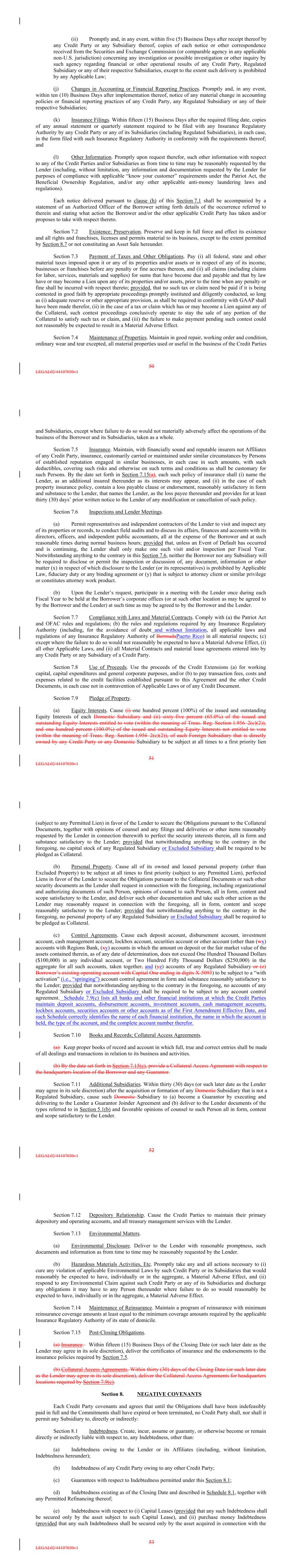 (ii) Promptly and, in any event, within five (5) Business Days after receipt thereof by any Credit Party or any Subsidiary thereof, copies of each notice or other correspondence received from the Securities and Exchange Commission (or comparable agency in any applicable non-U.S. jurisdiction) concerning any investigation or possible investigation or other inquiry by such agency regarding financial or other operational results of any Credit Party, Regulated Subsidiary or any of their respective Subsidiaries, except to the extent such delivery is prohibited by any Applicable Law; (j) Changes in Accounting or Financial Reporting Practices. Promptly and, in any event, within ten (10) Business Days after implementation thereof, notice of any material change in accounting policies or financial reporting practices of any Credit Party, any Regulated Subsidiary or any of their respective Subsidiaries; (k) Insurance Filings. Within fifteen (15) Business Days after the required filing date, copies of any annual statement or quarterly statement required to be filed with any Insurance Regulatory Authority by any Credit Party or any of its Subsidiaries (including Regulated Subsidiaries), in each case, in the form filed with such Insurance Regulatory Authority in conformity with the requirements thereof; and (l) Other Information. Promptly upon request therefor, such other information with respect to any of the Credit Parties and/or Subsidiaries as from time to time may be reasonably requested by the Lender (including, without limitation, any information and documentation requested by the Lender for purposes of compliance with applicable “know your customer” requirements under the Patriot Act, the Beneficial Ownership Regulation, and/or any other applicable anti-money laundering laws and regulations). Each notice delivered pursuant to clause (h) of this Section 7.1 shall be accompanied by a statement of an Authorized Officer of the Borrower setting forth details of the occurrence referred to therein and stating what action the Borrower and/or the other applicable Credit Party has taken and/or proposes to take with respect thereto. Section 7.2 Existence; Preservation. Preserve and keep in full force and effect its existence and all rights and franchises, licenses and permits material to its business, except to the extent permitted by Section 8.7 or not constituting an Asset Sale hereunder. Section 7.3 Payment of Taxes and Other Obligations. Pay (i) all federal, state and other material taxes imposed upon it or any of its properties and/or assets or in respect of any of its income, businesses or franchises before any penalty or fine accrues thereon, and (ii) all claims (including claims for labor, services, materials and supplies) for sums that have become due and payable and that by law have or may become a Lien upon any of its properties and/or assets, prior to the time when any penalty or fine shall be incurred with respect thereto; provided, that no such tax or claim need be paid if it is being contested in good faith by appropriate proceedings promptly instituted and diligently conducted, so long as (i) adequate reserve or other appropriate provision, as shall be required in conformity with GAAP shall have been made therefor, (ii) in the case of a tax or claim which has or may become a Lien against any of the Collateral, such contest proceedings conclusively operate to stay the sale of any portion of the Collateral to satisfy such tax or claim, and (iii) the failure to make payment pending such contest could not reasonably be expected to result in a Material Adverse Effect. Section 7.4 Maintenance of Properties. Maintain in good repair, working order and condition, ordinary wear and tear excepted, all material properties used or useful in the business of the Credit Parties 50 LEGAL02/44107030v1 and Subsidiaries, except where failure to do so would not materially adversely affect the operations of the business of the Borrower and its Subsidiaries, taken as a whole. Section 7.5 Insurance. Maintain, with financially sound and reputable insurers not Affiliates of any Credit Party, insurance, customarily carried or maintained under similar circumstances by Persons of established reputation engaged in similar businesses, in each case in such amounts, with such deductibles, covering such risks and otherwise on such terms and conditions as shall be customary for such Persons. By the date set forth in Section 7.15(a), each such policy of insurance shall (i) name the Lender, as an additional insured thereunder as its interests may appear, and (ii) in the case of each property insurance policy, contain a loss payable clause or endorsement, reasonably satisfactory in form and substance to the Lender, that names the Lender, as the loss payee thereunder and provides for at least thirty (30) days’ prior written notice to the Lender of any modification or cancellation of such policy. Section 7.6 Inspections and Lender Meetings. (a) Permit representatives and independent contractors of the Lender to visit and inspect any of its properties or records, to conduct field audits and to discuss its affairs, finances and accounts with its directors, officers, and independent public accountants, all at the expense of the Borrower and at such reasonable times during normal business hours; provided that, unless an Event of Default has occurred and is continuing, the Lender shall only make one such visit and/or inspection per Fiscal Year. Notwithstanding anything to the contrary in this Section 7.6, neither the Borrower nor any Subsidiary will be required to disclose or permit the inspection or discussion of, any document, information or other matter (x) in respect of which disclosure to the Lender (or its representatives) is prohibited by Applicable Law, fiduciary duty or any binding agreement or (y) that is subject to attorney client or similar privilege or constitutes attorney work product. (b) Upon the Lender’s req