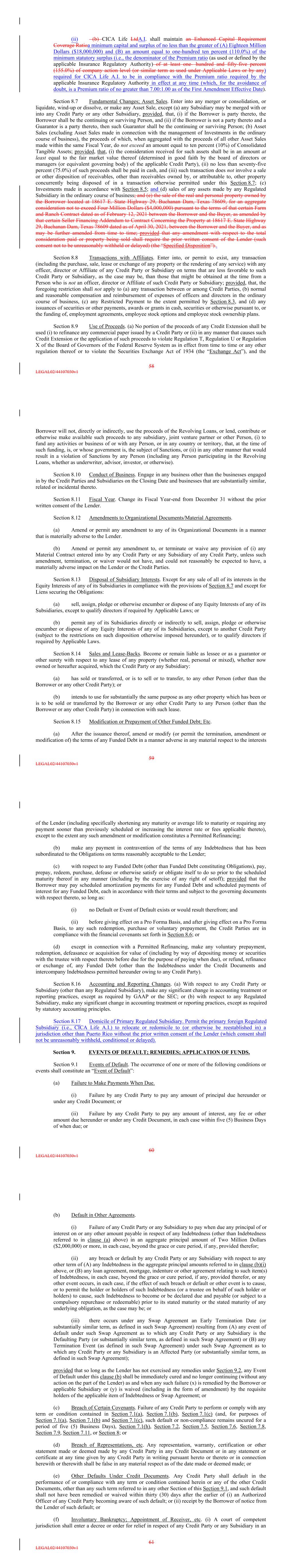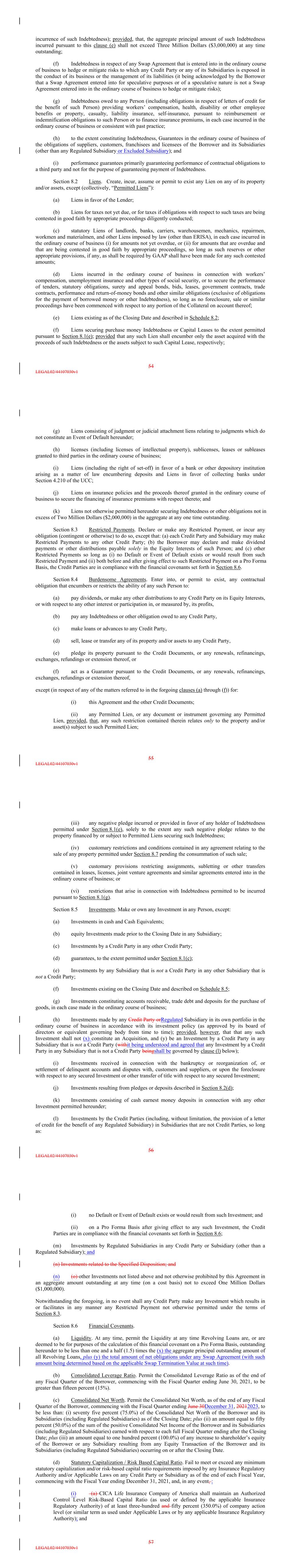 (ii) (b) CICA Life LtdA.I. shall maintain an Enhanced Capital Requirement Coverage Ratioa minimum capital and surplus of no less than the greater of (A) Eighteen Million Dollars ($18,000,000) and (B) an amount equal to one-hundred ten percent (110.0%) of the minimum statutory surplus (i.e., the denominator of the Premium ratio (as used or defined by the applicable Insurance Regulatory Authority) of at least one- hundred and fifty-five percent (155.0%) of company action level (or similar term as used under Applicable Laws or by any) required for CICA Life A.I. to be in compliance with the Premium ratio required by the applicable Insurance Regulatory Authority in effect at any time (which, for the avoidance of doubt, is a Premium ratio of no greater than 7.00:1.00 as of the First Amendment Effective Date). Section 8.7 Fundamental Changes; Asset Sales. Enter into any merger or consolidation, or liquidate, wind-up or dissolve, or make any Asset Sale, except (a) any Subsidiary may be merged with or into any Credit Party or any other Subsidiary, provided, that, (i) if the Borrower is party thereto, the Borrower shall be the continuing or surviving Person, and (ii) if the Borrower is not a party thereto and a Guarantor is a party thereto, then such Guarantor shall be the continuing or surviving Person; (b) Asset Sales (excluding Asset Sales made in connection with the management of Investments in the ordinary course of business), the proceeds of which, when aggregated with the proceeds of all other Asset Sales made within the same Fiscal Year, do not exceed an amount equal to ten percent (10%) of Consolidated Tangible Assets; provided, that, (i) the consideration received for such assets shall be in an amount at least equal to the fair market value thereof (determined in good faith by the board of directors or managers (or equivalent governing body) of the applicable Credit Party), (ii) no less than seventy-five percent (75.0%) of such proceeds shall be paid in cash, and (iii) such transaction does not involve a sale or other disposition of receivables, other than receivables owned by, or attributable to, other property concurrently being disposed of in a transaction otherwise permitted under this Section 8.7; (c) Investments made in accordance with Section 8.5; and (d) sales of any assets made by any Regulated Subsidiary in the ordinary course of business; and (e) the sale of the real and personal property owned by the Borrower located at 18617 E. State Highway 29, Buchanan Dam, Texas 78609, for an aggregate consideration not to exceed Four Million Dollars ($4,000,000) pursuant to the terms of that certain Farm and Ranch Contract dated as of February 12, 2021 between the Borrower and the Buyer, as amended by that certain Seller Financing Addendum to Contract Concerning the Property at 18617 E. State Highway 29, Buchanan Dam, Texas 78609 dated as of April 30, 2021, between the Borrower and the Buyer, and as may be further amended from time to time; provided that any amendment with respect to the total consideration paid or property being sold shall require the prior written consent of the Lender (such consent not to be unreasonably withheld or delayed) (the “Specified Disposition”).. Section 8.8 Transactions with Affiliates. Enter into, or permit to exist, any transaction (including the purchase, sale, lease or exchange of any property or the rendering of any service) with any officer, director or Affiliate of any Credit Party or Subsidiary on terms that are less favorable to such Credit Party or Subsidiary, as the case may be, than those that might be obtained at the time from a Person who is not an officer, director or Affiliate of such Credit Party or Subsidiary; provided, that, the foregoing restriction shall not apply to (a) any transaction between or among Credit Parties, (b) normal and reasonable compensation and reimbursement of expenses of officers and directors in the ordinary course of business, (c) any Restricted Payment to the extent permitted by Section 8.3, and (d) any issuances of securities or other payments, awards or grants in cash, securities or otherwise pursuant to, or the funding of, employment agreements, employee stock options and employee stock ownership plans. Section 8.9 Use of Proceeds. (a) No portion of the proceeds of any Credit Extension shall be used (i) to refinance any commercial paper issued by a Credit Party or (ii) in any manner that causes such Credit Extension or the application of such proceeds to violate Regulation T, Regulation U or Regulation X of the Board of Governors of the Federal Reserve System as in effect from time to time or any other regulation thereof or to violate the Securities Exchange Act of 1934 (the “Exchange Act”), and the 58 LEGAL02/44107030v1 Borrower will not, directly or indirectly, use the proceeds of the Revolving Loans, or lend, contribute or otherwise make available such proceeds to any subsidiary, joint venture partner or other Person, (i) to fund any activities or business of or with any Person, or in any country or territory, that, at the time of such funding, is, or whose government is, the subject of Sanctions, or (ii) in any other manner that would result in a violation of Sanctions by any Person (including any Person participating in the Revolving Loans, whether as underwriter, advisor, investor, or otherwise). Section 8.10 Conduct of Business. Engage in any business other than the businesses engaged in by the Credit Parties and Subsidiaries on the Closing Date and businesses that are substantially similar, related or incidental thereto. Section 8.11 Fiscal Year. Change its Fiscal Year-end from December 31 without the prior written consent of the Lender. Section 8.12 Amendments to Organizational Documents/Material Agreements. (a) Amend or permit any amendment to any of its Organizational Documents in a manner that is materially adverse to the Lender. (b) Amend or permit any amendment to, or terminate or waive an