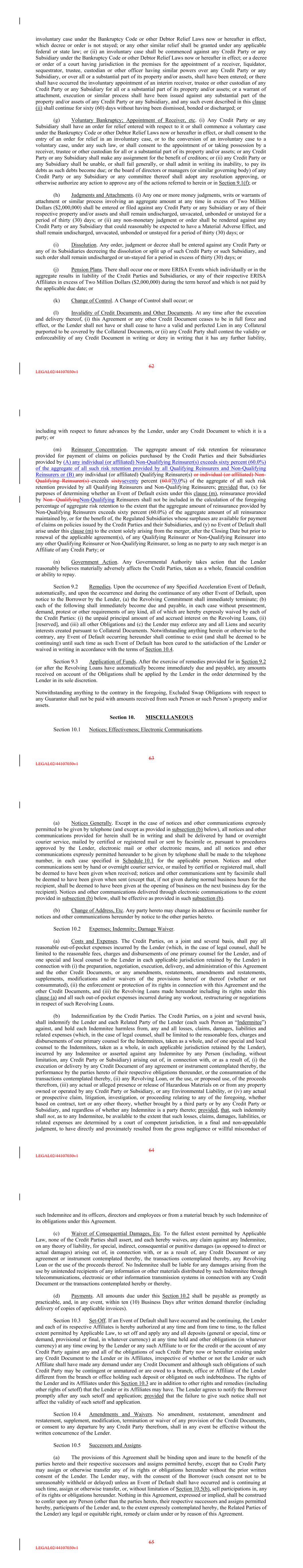 involuntary case under the Bankruptcy Code or other Debtor Relief Laws now or hereafter in effect, which decree or order is not stayed; or any other similar relief shall be granted under any applicable federal or state law; or (ii) an involuntary case shall be commenced against any Credit Party or any Subsidiary under the Bankruptcy Code or other Debtor Relief Laws now or hereafter in effect; or a decree or order of a court having jurisdiction in the premises for the appointment of a receiver, liquidator, sequestrator, trustee, custodian or other officer having similar powers over any Credit Party or any Subsidiary, or over all or a substantial part of its property and/or assets, shall have been entered; or there shall have occurred the involuntary appointment of an interim receiver, trustee or other custodian of any Credit Party or any Subsidiary for all or a substantial part of its property and/or assets; or a warrant of attachment, execution or similar process shall have been issued against any substantial part of the property and/or assets of any Credit Party or any Subsidiary, and any such event described in this clause (ii) shall continue for sixty (60) days without having been dismissed, bonded or discharged; or (g) Voluntary Bankruptcy; Appointment of Receiver, etc. (i) Any Credit Party or any Subsidiary shall have an order for relief entered with respect to it or shall commence a voluntary case under the Bankruptcy Code or other Debtor Relief Laws now or hereafter in effect, or shall consent to the entry of an order for relief in an involuntary case, or to the conversion of an involuntary case to a voluntary case, under any such law, or shall consent to the appointment of or taking possession by a receiver, trustee or other custodian for all or a substantial part of its property and/or assets; or any Credit Party or any Subsidiary shall make any assignment for the benefit of creditors; or (ii) any Credit Party or any Subsidiary shall be unable, or shall fail generally, or shall admit in writing its inability, to pay its debts as such debts become due; or the board of directors or managers (or similar governing body) of any Credit Party or any Subsidiary or any committee thereof shall adopt any resolution approving, or otherwise authorize any action to approve any of the actions referred to herein or in Section 9.1(f); or (h) Judgments and Attachments. (i) Any one or more money judgments, writs or warrants of attachment or similar process involving an aggregate amount at any time in excess of Two Million Dollars ($2,000,000) shall be entered or filed against any Credit Party or any Subsidiary or any of their respective property and/or assets and shall remain undischarged, unvacated, unbonded or unstayed for a period of thirty (30) days; or (ii) any non-monetary judgment or order shall be rendered against any Credit Party or any Subsidiary that could reasonably be expected to have a Material Adverse Effect, and shall remain undischarged, unvacated, unbonded or unstayed for a period of thirty (30) days; or (i) Dissolution. Any order, judgment or decree shall be entered against any Credit Party or any of its Subsidiaries decreeing the dissolution or split up of such Credit Party or such Subsidiary, and such order shall remain undischarged or un-stayed for a period in excess of thirty (30) days; or (j) Pension Plans. There shall occur one or more ERISA Events which individually or in the aggregate results in liability of the Credit Parties and Subsidiaries, or any of their respective ERISA Affiliates in excess of Two Million Dollars ($2,000,000) during the term hereof and which is not paid by the applicable due date; or (k) Change of Control. A Change of Control shall occur; or (l) Invalidity of Credit Documents and Other Documents. At any time after the execution and delivery thereof, (i) this Agreement or any other Credit Document ceases to be in full force and effect, or the Lender shall not have or shall cease to have a valid and perfected Lien in any Collateral purported to be covered by the Collateral Documents, or (ii) any Credit Party shall contest the validity or enforceability of any Credit Document in writing or deny in writing that it has any further liability, 62 LEGAL02/44107030v1 including with respect to future advances by the Lender, under any Credit Document to which it is a party; or (m) Reinsurer Concentration. The aggregate amount of risk retention for reinsurance provided for payment of claims on policies purchased by the Credit Parties and their Subsidiaries provided by (A) any individual (or affiliated) Non-Qualifying Reinsurer(s) exceeds sixty percent (60.0%) of the aggregate of all such risk retention provided by all Qualifying Reinsurers and Non-Qualifying Reinsurers or (B) any individual (or affiliated) Qualifying Reinsurer(s) or individual (or affiliated) Non- Qualifying Reinsurer(s) exceeds sixtyseventy percent (60.070.0%) of the aggregate of all such risk retention provided by all Qualifying Reinsurers and Non-Qualifying Reinsurers; provided that, (x) for purposes of determining whether an Event of Default exists under this clause (m), reinsurance provided by Non- QualifyingNon-Qualifying Reinsurers shall not be included in the calculation of the foregoing percentage of aggregate risk retention to the extent that the aggregate amount of reinsurance provided by Non-Qualifying Reinsurers exceeds sixty percent (60.0%) of the aggregate amount of all reinsurance maintained by, or for the benefit of, the Regulated Subsidiaries whose surpluses are available for payment of claims on policies issued by the Credit Parties and their Subsidiaries, and (y) no Event of Default shall arise under this clause (m) to the extent solely arising from the merger, after the Closing Date but prior to renewal of the applicable agreement(s), of any Qualifying Reinsurer or Non-Qualifying Reinsurer into any other Qualifying Reinsurer or Non-Qualifying Reinsurer, so long as no part
