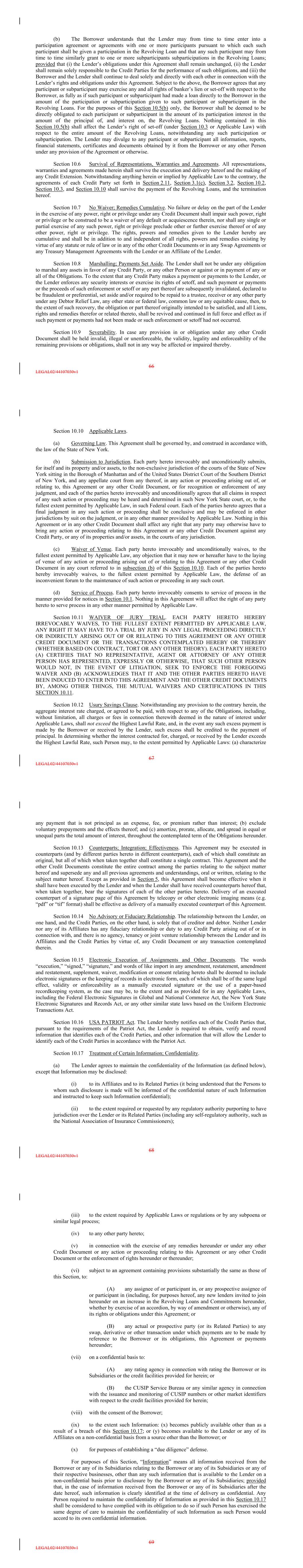 (b) The Borrower understands that the Lender may from time to time enter into a participation agreement or agreements with one or more participants pursuant to which each such participant shall be given a participation in the Revolving Loan and that any such participant may from time to time similarly grant to one or more subparticipants subparticipations in the Revolving Loans; provided that (i) the Lender’s obligations under this Agreement shall remain unchanged, (ii) the Lender shall remain solely responsible to the Credit Parties for the performance of such obligations, and (iii) the Borrower and the Lender shall continue to deal solely and directly with each other in connection with the Lender’s rights and obligations under this Agreement. Subject to the above, the Borrower agrees that any participant or subparticipant may exercise any and all rights of banker’s lien or set-off with respect to the Borrower, as fully as if such participant or subparticipant had made a loan directly to the Borrower in the amount of the participation or subparticipation given to such participant or subparticipant in the Revolving Loans. For the purposes of this Section 10.5(b) only, the Borrower shall be deemed to be directly obligated to each participant or subparticipant in the amount of its participation interest in the amount of the principal of, and interest on, the Revolving Loans. Nothing contained in this Section 10.5(b) shall affect the Lender’s right of set-off (under Section 10.3 or Applicable Law) with respect to the entire amount of the Revolving Loans, notwithstanding any such participation or subparticipation. The Lender may divulge to any participant or subparticipant all information, reports, financial statements, certificates and documents obtained by it from the Borrower or any other Person under any provision of the Agreement or otherwise. Section 10.6 Survival of Representations, Warranties and Agreements. All representations, warranties and agreements made herein shall survive the execution and delivery hereof and the making of any Credit Extension. Notwithstanding anything herein or implied by Applicable Law to the contrary, the agreements of each Credit Party set forth in Section 2.11, Section 3.1(c), Section 3.2, Section 10.2, Section 10.3, and Section 10.10 shall survive the payment of the Revolving Loans, and the termination hereof. Section 10.7 No Waiver; Remedies Cumulative. No failure or delay on the part of the Lender in the exercise of any power, right or privilege under any Credit Document shall impair such power, right or privilege or be construed to be a waiver of any default or acquiescence therein, nor shall any single or partial exercise of any such power, right or privilege preclude other or further exercise thereof or of any other power, right or privilege. The rights, powers and remedies given to the Lender hereby are cumulative and shall be in addition to and independent of all rights, powers and remedies existing by virtue of any statute or rule of law or in any of the other Credit Documents or in any Swap Agreements or any Treasury Management Agreements with the Lender or an Affiliate of the Lender. Section 10.8 Marshalling; Payments Set Aside. The Lender shall not be under any obligation to marshal any assets in favor of any Credit Party, or any other Person or against or in payment of any or all of the Obligations. To the extent that any Credit Party makes a payment or payments to the Lender, or the Lender enforces any security interests or exercise its rights of setoff, and such payment or payments or the proceeds of such enforcement or setoff or any part thereof are subsequently invalidated, declared to be fraudulent or preferential, set aside and/or required to be repaid to a trustee, receiver or any other party under any Debtor Relief Law, any other state or federal law, common law or any equitable cause, then, to the extent of such recovery, the obligation or part thereof originally intended to be satisfied, and all Liens, rights and remedies therefor or related thereto, shall be revived and continued in full force and effect as if such payment or payments had not been made or such enforcement or setoff had not occurred. Section 10.9 Severability. In case any provision in or obligation under any other Credit Document shall be held invalid, illegal or unenforceable, the validity, legality and enforceability of the remaining provisions or obligations, shall not in any way be affected or impaired thereby. 66 LEGAL02/44107030v1 Section 10.10 Applicable Laws. (a) Governing Law. This Agreement shall be governed by, and construed in accordance with, the law of the State of New York. (b) Submission to Jurisdiction. Each party hereto irrevocably and unconditionally submits, for itself and its property and/or assets, to the non-exclusive jurisdiction of the courts of the State of New York sitting in the Borough of Manhattan and of the United States District Court of the Southern District of New York, and any appellate court from any thereof, in any action or proceeding arising out of, or relating to, this Agreement or any other Credit Document, or for recognition or enforcement of any judgment, and each of the parties hereto irrevocably and unconditionally agrees that all claims in respect of any such action or proceeding may be heard and determined in such New York State court, or, to the fullest extent permitted by Applicable Law, in such Federal court. Each of the parties hereto agrees that a final judgment in any such action or proceeding shall be conclusive and may be enforced in other jurisdictions by suit on the judgment, or in any other manner provided by Applicable Law. Nothing in this Agreement or in any other Credit Document shall affect any right that any party may otherwise have to bring any action or proceeding relating to this Agreement or any other Credit Document against any Credit Party, or any of its properties and/or assets, in the co