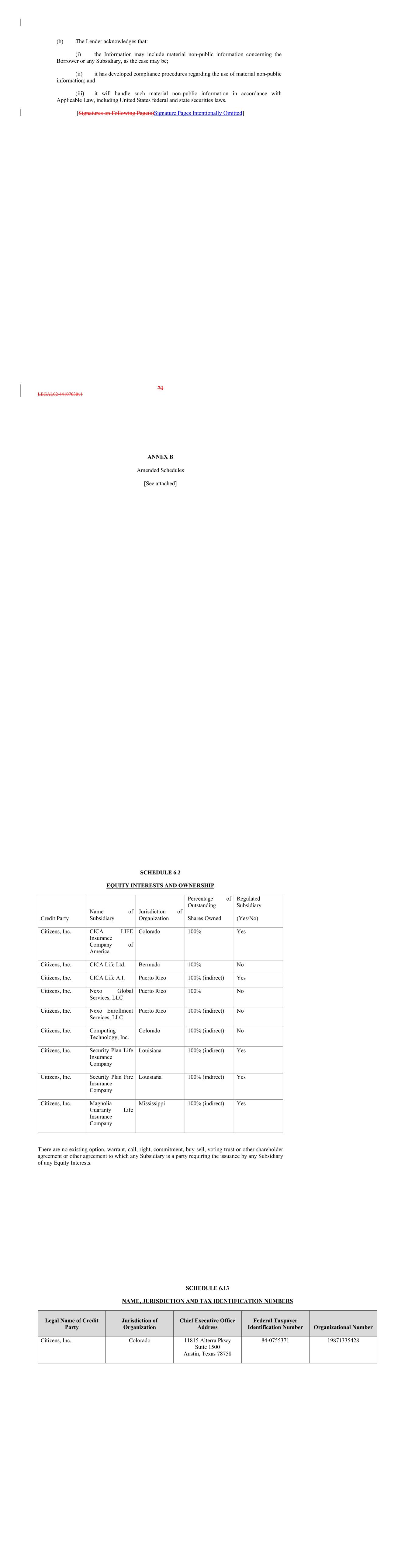 (b) The Lender acknowledges that: (i) the Information may include material non-public information concerning the Borrower or any Subsidiary, as the case may be; (ii) it has developed compliance procedures regarding the use of material non-public information; and (iii) it will handle such material non-public information in accordance with Applicable Law, including United States federal and state securities laws. [Signatures on Following Page(s)Signature Pages Intentionally Omitted] 70 LEGAL02/44107030v1 ANNEX B Amended Schedules [See attached] SCHEDULE 6.2 EQUITY INTERESTS AND OWNERSHIP Credit Party Name of Subsidiary Jurisdiction of Organization Percentage of Outstanding Shares Owned Regulated Subsidiary (Yes/No) Citizens, Inc. CICA LIFE Insurance Company of America Colorado 100% Yes Citizens, Inc. CICA Life Ltd. Bermuda 100% No Citizens, Inc. CICA Life A.I. Puerto Rico 100% (indirect) Yes Citizens, Inc. Nexo Global Services, LLC Puerto Rico 100% No Citizens, Inc. Nexo Enrollment Services, LLC Puerto Rico 100% (indirect) No Citizens, Inc. Computing Technology, Inc. Colorado 100% (indirect) No Citizens, Inc. Security Plan Life Insurance Company Louisiana 100% (indirect) Yes Citizens, Inc. Security Plan Fire Insurance Company Louisiana 100% (indirect) Yes Citizens, Inc. Magnolia Guaranty Life Insurance Company Mississippi 100% (indirect) Yes There are no existing option, warrant, call, right, commitment, buy-sell, voting trust or other shareholder agreement or other agreement to which any Subsidiary is a party requiring the issuance by any Subsidiary of any Equity Interests. SCHEDULE 6.13 NAME, JURISDICTION AND TAX IDENTIFICATION NUMBERS Legal Name of Credit Party Jurisdiction of Organization Chief Executive Office Address Federal Taxpayer Identification Number Organizational Number Citizens, Inc. Colorado 11815 Alterra Pkwy Suite 1500 Austin, Texas 78758 84-0755371 19871335428