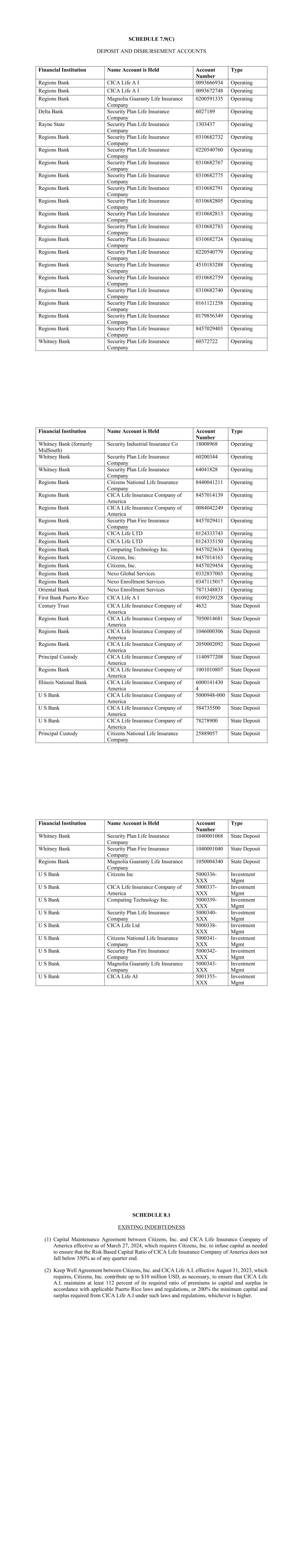 SCHEDULE 7.9(C) DEPOSIT AND DISBURSEMENT ACCOUNTS Financial Institution Name Account is Held Account Number Type Regions Bank CICA Life A I 0093666934 Operating Regions Bank CICA Life A I 0093672748 Operating Regions Bank Magnolia Guaranty Life Insurance Company 0200591335 Operating Delta Bank Security Plan Life Insurance Company 6027189 Operating Rayne State Security Plan Life Insurance Company 1303437 Operating Regions Bank Security Plan Life Insurance Company 0310682732 Operating Regions Bank Security Plan Life Insurance Company 0220540760 Operating Regions Bank Security Plan Life Insurance Company 0310682767 Operating Regions Bank Security Plan Life Insurance Company 0310682775 Operating Regions Bank Security Plan Life Insurance Company 0310682791 Operating Regions Bank Security Plan Life Insurance Company 0310682805 Operating Regions Bank Security Plan Life Insurance Company 0310682813 Operating Regions Bank Security Plan Life Insurance Company 0310682783 Operating Regions Bank Security Plan Life Insurance Company 0310682724 Operating Regions Bank Security Plan Life Insurance Company 0220540779 Operating Regions Bank Security Plan Life Insurance Company 4510183288 Operating Regions Bank Security Plan Life Insurance Company 0310682759 Operating Regions Bank Security Plan Life Insurance Company 0310682740 Operating Regions Bank Security Plan Life Insurance Company 0161121258 Operating Regions Bank Security Plan Life Insurance Company 0179856349 Operating Regions Bank Security Plan Life Insurance Company 8457029403 Operating Whitney Bank Security Plan Life Insurance Company 60372722 Operating Financial Institution Name Account is Held Account Number Type Whitney Bank (formerly MidSouth) Security Industrial Insurance Co 18008968 Operating Whitney Bank Security Plan Life Insurance Company 60200344 Operating Whitney Bank Security Plan Life Insurance Company 64041828 Operating Regions Bank Citizens National Life Insurance Company 8440041211 Operating Regions Bank CICA Life Insurance Company of America 8457014139 Operating Regions Bank CICA Life Insurance Company of America 0084042249 Operating Regions Bank Security Plan Fire Insurance Company 8457029411 Operating Regions Bank CICA Life LTD 0124333743 Operating Regions Bank CICA Life LTD 0124335150 Operating Regions Bank Computing Technology Inc. 8457023634 Operating Regions Bank Citizens, Inc. 8457014163 Operating Regions Bank Citizens, Inc. 8457029454 Operating Regions Bank Nexo Global Services 0332837003 Operating Regions Bank Nexo Enrollment Services 0347115017 Operating Oriental Bank Nexo Enrollment Services 7871348831 Operating First Bank Puerto Rico CICA Life A I 0109239328 Operating Century Trust CICA Life Insurance Company of America 4632 State Deposit Regions Bank CICA Life Insurance Company of America 7050014681 State Deposit Regions Bank CICA Life Insurance Company of America 1046000306 State Deposit Regions Bank CICA Life Insurance Company of America 2050002092 State Deposit Principal Custody CICA Life Insurance Company of America 1140977208 State Deposit Regions Bank CICA Life Insurance Company of America 1001010807 State Deposit Illinois National Bank CICA Life Insurance Company of America 6000141430 4 State Deposit U S Bank CICA Life Insurance Company of America 5000948-000 State Deposit U S Bank CICA Life Insurance Company of America 584735500 State Deposit U S Bank CICA Life Insurance Company of America 78278900 State Deposit Principal Custody Citizens National Life Insurance Company 25889057 State Deposit Financial Institution Name Account is Held Account Number Type Whitney Bank Security Plan Life Insurance Company 1040001068 State Deposit Whitney Bank Security Plan Fire Insurance Company 1040001040 State Deposit Regions Bank Magnolia Guaranty Life Insurance Company 1050004340 State Deposit U S Bank Citizens Inc 5000336- XXX Investment Mgmt U S Bank CICA Life Insurance Company of America 5000337- XXX Investment Mgmt U S Bank Computing Technology Inc. 5000339- XXX Investment Mgmt U S Bank Security Plan Life Insurance Company 5000340- XXX Investment Mgmt U S Bank CICA Life Ltd 5000338- XXX Investment Mgmt U S Bank Citizens National Life Insurance Company 5000341- XXX Investment Mgmt U S Bank Security Plan Fire Insurance Company 5000342- XXX Investment Mgmt U S Bank Magnolia Guaranty Life Insurance Company 5000343- XXX Investment Mgmt U S Bank CICA Life AI 5001355- XXX Investment Mgmt SCHEDULE 8.1 EXISTING INDEBTEDNESS (1) Capital Maintenance Agreement between Citizens, Inc. and CICA Life Insurance Company of America effective as of March 27, 2024, which requires Citizens, Inc. to infuse capital as needed to ensure that the Risk Based Capital Ratio of CICA Life Insurance Company of America does not fall below 350% as of any quarter end. (2) Keep Well Agreement between Citizens, Inc. and CICA Life A.I. effective August 31, 2023, which requires, Citizens, Inc. contribute up to $10 million USD, as necessary, to ensure that CICA Life A.I. maintains at least 112 percent of its required ratio of premiums to capital and surplus in accordance with applicable Puerto Rico laws and regulations, or 200% the minimum capital and surplus required from CICA Life A.I under such laws and regulations, whichever is higher.