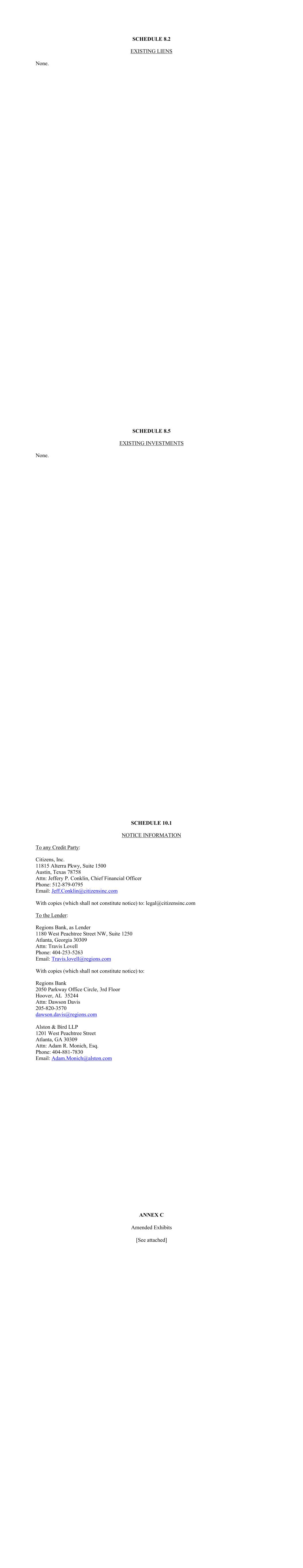 SCHEDULE 8.2 EXISTING LIENS None. SCHEDULE 8.5 EXISTING INVESTMENTS None. SCHEDULE 10.1 NOTICE INFORMATION To any Credit Party: Citizens, Inc. 11815 Alterra Pkwy, Suite 1500 Austin, Texas 78758 Attn: Jeffery P. Conklin, Chief Financial Officer Phone: 512-879-0795 Email: Jeff.Conklin@citizensinc.com With copies (which shall not constitute notice) to: legal@citizensinc.com To the Lender: Regions Bank, as Lender 1180 West Peachtree Street NW, Suite 1250 Atlanta, Georgia 30309 Attn: Travis Lovell Phone: 404-253-5263 Email: Travis.lovell@regions.com With copies (which shall not constitute notice) to: Regions Bank 2050 Parkway Office Circle, 3rd Floor Hoover, AL 35244 Attn: Dawson Davis 205-820-3570 dawson.davis@regions.com Alston & Bird LLP 1201 West Peachtree Street Atlanta, GA 30309 Attn: Adam R. Monich, Esq. Phone: 404-881-7830 Email: Adam.Monich@alston.com ANNEX C Amended Exhibits [See attached]