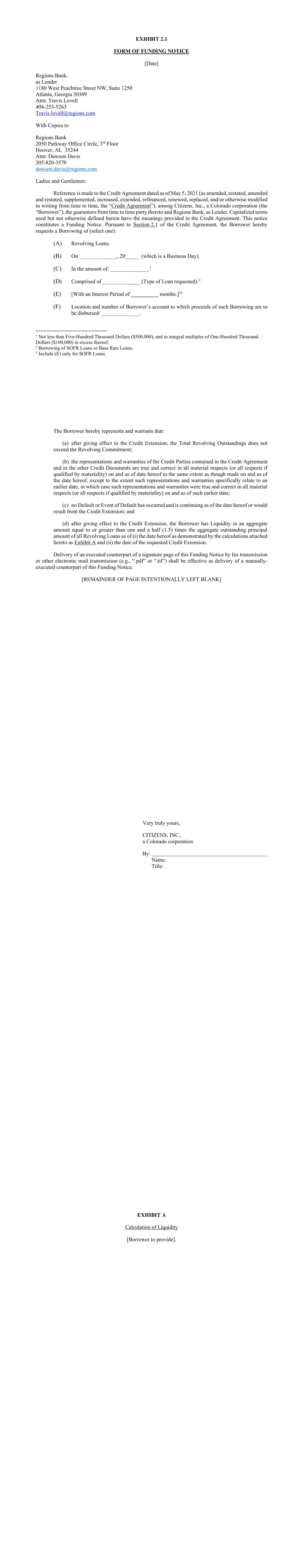 EXHIBIT 2.1 FORM OF FUNDING NOTICE [Date] Regions Bank, as Lender 1180 West Peachtree Street NW, Suite 1250 Atlanta, Georgia 30309 Attn: Travis Lovell 404-253-5263 Travis.lovell@regions.com With Copies to Regions Bank 2050 Parkway Office Circle, 3rd Floor Hoover, AL 35244 Attn: Dawson Davis 205-820-3570 dawson.davis@regions.com Ladies and Gentlemen: Reference is made to the Credit Agreement dated as of May 5, 2021 (as amended, restated, amended and restated, supplemented, increased, extended, refinanced, renewed, replaced, and/or otherwise modified in writing from time to time, the “Credit Agreement”), among Citizens, Inc., a Colorado corporation (the “Borrower”), the guarantors from time to time party thereto and Regions Bank, as Lender. Capitalized terms used but not otherwise defined herein have the meanings provided in the Credit Agreement. This notice constitutes a Funding Notice. Pursuant to Section 2.1 of the Credit Agreement, the Borrower hereby requests a Borrowing of (select one): (A) Revolving Loans. (B) On _______________, 20_____ (which is a Business Day). (C) In the amount of: _______________.1 (D) Comprised of _______________ (Type of Loan requested).2 (E) [With an Interest Period of __________ months.]33 (F) Location and number of Borrower’s account to which proceeds of such Borrowing are to be disbursed: _______________. 1 Not less than Five-Hundred Thousand Dollars ($500,000), and in integral multiples of One-Hundred Thousand Dollars ($100,000) in excess thereof. 2 Borrowing of SOFR Loans or Base Rate Loans. 3 Include (E) only for SOFR Loans. The Borrower hereby represents and warrants that: (a) after giving effect to the Credit Extension, the Total Revolving Outstandings does not exceed the Revolving Commitment; (b) the representations and warranties of the Credit Parties contained in the Credit Agreement and in the other Credit Documents are true and correct in all material respects (or all respects if qualified by materiality) on and as of date hereof to the same extent as though made on and as of the date hereof, except to the extent such representations and warranties specifically relate to an earlier date, in which case such representations and warranties were true and correct in all material respects (or all respects if qualified by materiality) on and as of such earlier date; (c) no Default or Event of Default has occurred and is continuing as of the date hereof or would result from the Credit Extension; and (d) after giving effect to the Credit Extension, the Borrower has Liquidity in an aggregate amount equal to or greater than one and a half (1.5) times the aggregate outstanding principal amount of all Revolving Loans as of (i) the date hereof as demonstrated by the calculations attached hereto as Exhibit A and (ii) the date of the requested Credit Extension. Delivery of an executed counterpart of a signature page of this Funding Notice by fax transmission or other electronic mail transmission (e.g., “.pdf” or “.tif”) shall be effective as delivery of a manually- executed counterpart of this Funding Notice. [REMAINDER OF PAGE INTENTIONALLY LEFT BLANK] Very truly yours, CITIZENS, INC., a Colorado corporation By: Name: Title: EXHIBIT A Calculation of Liquidity [Borrower to provide].