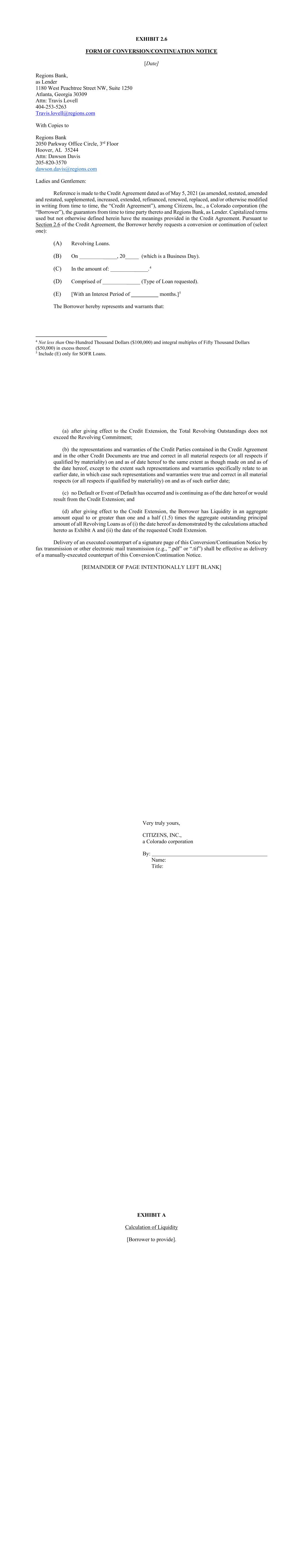 EXHIBIT 2.6 FORM OF CONVERSION/CONTINUATION NOTICE [Date] Regions Bank, as Lender 1180 West Peachtree Street NW, Suite 1250 Atlanta, Georgia 30309 Attn: Travis Lovell 404-253-5263 Travis.lovell@regions.com With Copies to Regions Bank 2050 Parkway Office Circle, 3rd Floor Hoover, AL 35244 Attn: Dawson Davis 205-820-3570 dawson.davis@regions.com Ladies and Gentlemen: Reference is made to the Credit Agreement dated as of May 5, 2021 (as amended, restated, amended and restated, supplemented, increased, extended, refinanced, renewed, replaced, and/or otherwise modified in writing from time to time, the “Credit Agreement”), among Citizens, Inc., a Colorado corporation (the “Borrower”), the guarantors from time to time party thereto and Regions Bank, as Lender. Capitalized terms used but not otherwise defined herein have the meanings provided in the Credit Agreement. Pursuant to Section 2.6 of the Credit Agreement, the Borrower hereby requests a conversion or continuation of (select one): (A) Revolving Loans. (B) On _______________, 20_____ (which is a Business Day). (C) In the amount of: _______________.4 (D) Comprised of _______________ (Type of Loan requested). (E) [With an Interest Period of __________ months.]5 The Borrower hereby represents and warrants that: 4 Not less than One-Hundred Thousand Dollars ($100,000) and integral multiples of Fifty Thousand Dollars ($50,000) in excess thereof. 5 Include (E) only for SOFR Loans. (a) after giving effect to the Credit Extension, the Total Revolving Outstandings does not exceed the Revolving Commitment; (b) the representations and warranties of the Credit Parties contained in the Credit Agreement and in the other Credit Documents are true and correct in all material respects (or all respects if qualified by materiality) on and as of date hereof to the same extent as though made on and as of the date hereof, except to the extent such representations and warranties specifically relate to an earlier date, in which case such representations and warranties were true and correct in all material respects (or all respects if qualified by materiality) on and as of such earlier date; (c) no Default or Event of Default has occurred and is continuing as of the date hereof or would result from the Credit Extension; and (d) after giving effect to the Credit Extension, the Borrower has Liquidity in an aggregate amount equal to or greater than one and a half (1.5) times the aggregate outstanding principal amount of all Revolving Loans as of (i) the date hereof as demonstrated by the calculations attached hereto as Exhibit A and (ii) the date of the requested Credit Extension. Delivery of an executed counterpart of a signature page of this Conversion/Continuation Notice by fax transmission or other electronic mail transmission (e.g., “.pdf” or “.tif”) shall be effective as delivery of a manually-executed counterpart of this Conversion/Continuation Notice. [REMAINDER OF PAGE INTENTIONALLY LEFT BLANK] Very truly yours, CITIZENS, INC., a Colorado corporation By: Name: Title: EXHIBIT A Calculation of Liquidity [Borrower to provide].