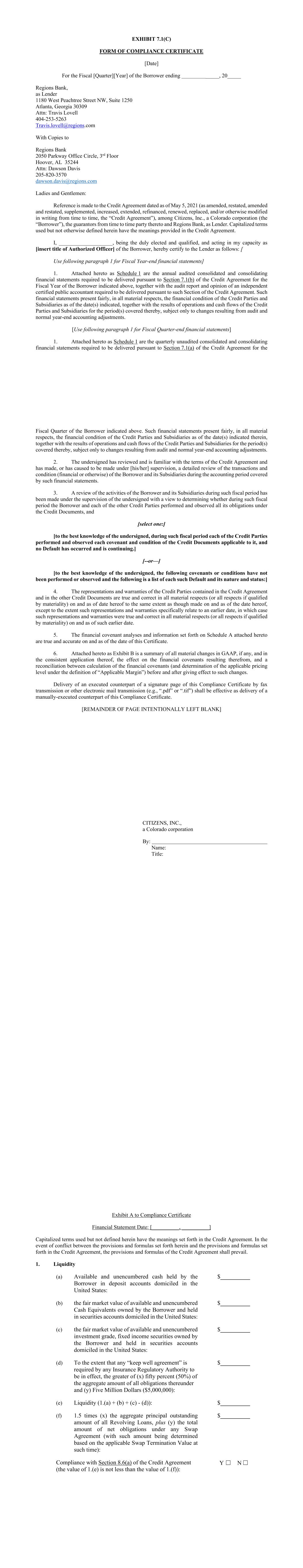 EXHIBIT 7.1(C) FORM OF COMPLIANCE CERTIFICATE [Date] For the Fiscal [Quarter][Year] of the Borrower ending _______________, 20_____ Regions Bank, as Lender 1180 West Peachtree Street NW, Suite 1250 Atlanta, Georgia 30309 Attn: Travis Lovell 404-253-5263 Travis.lovell@regions.com With Copies to Regions Bank 2050 Parkway Office Circle, 3rd Floor Hoover, AL 35244 Attn: Dawson Davis 205-820-3570 dawson.davis@regions.com Ladies and Gentlemen: Reference is made to the Credit Agreement dated as of May 5, 2021 (as amended, restated, amended and restated, supplemented, increased, extended, refinanced, renewed, replaced, and/or otherwise modified in writing from time to time, the “Credit Agreement”), among Citizens, Inc., a Colorado corporation (the “Borrower”), the guarantors from time to time party thereto and Regions Bank, as Lender. Capitalized terms used but not otherwise defined herein have the meanings provided in the Credit Agreement. I, ____________________, being the duly elected and qualified, and acting in my capacity as [insert title of Authorized Officer] of the Borrower, hereby certify to the Lender as follows: [ Use following paragraph 1 for Fiscal Year-end financial statements] 1. Attached hereto as Schedule 1 are the annual audited consolidated and consolidating financial statements required to be delivered pursuant to Section 7.1(b) of the Credit Agreement for the Fiscal Year of the Borrower indicated above, together with the audit report and opinion of an independent certified public accountant required to be delivered pursuant to such Section of the Credit Agreement. Such financial statements present fairly, in all material respects, the financial condition of the Credit Parties and Subsidiaries as of the date(s) indicated, together with the results of operations and cash flows of the Credit Parties and Subsidiaries for the period(s) covered thereby, subject only to changes resulting from audit and normal year-end accounting adjustments. [Use following paragraph 1 for Fiscal Quarter-end financial statements] 1. Attached hereto as Schedule 1 are the quarterly unaudited consolidated and consolidating financial statements required to be delivered pursuant to Section 7.1(a) of the Credit Agreement for the Fiscal Quarter of the Borrower indicated above. Such financial statements present fairly, in all material respects, the financial condition of the Credit Parties and Subsidiaries as of the date(s) indicated therein, together with the results of operations and cash flows of the Credit Parties and Subsidiaries for the period(s) covered thereby, subject only to changes resulting from audit and normal year-end accounting adjustments. 2. The undersigned has reviewed and is familiar with the terms of the Credit Agreement and has made, or has caused to be made under [his/her] supervision, a detailed review of the transactions and condition (financial or otherwise) of the Borrower and its Subsidiaries during the accounting period covered by such financial statements. 3. A review of the activities of the Borrower and its Subsidiaries during such fiscal period has been made under the supervision of the undersigned with a view to determining whether during such fiscal period the Borrower and each of the other Credit Parties performed and observed all its obligations under the Credit Documents, and [select one:] [to the best knowledge of the undersigned, during such fiscal period each of the Credit Parties performed and observed each covenant and condition of the Credit Documents applicable to it, and no Default has occurred and is continuing.] [--or—] [to the best knowledge of the undersigned, the following covenants or conditions have not been performed or observed and the following is a list of each such Default and its nature and status:] 4. The representations and warranties of the Credit Parties contained in the Credit Agreement and in the other Credit Documents are true and correct in all material respects (or all respects if qualified by materiality) on and as of date hereof to the same extent as though made on and as of the date hereof, except to the extent such representations and warranties specifically relate to an earlier date, in which case such representations and warranties were true and correct in all material respects (or all respects if qualified by materiality) on and as of such earlier date. 5. The financial covenant analyses and information set forth on Schedule A attached hereto are true and accurate on and as of the date of this Certificate. 6. Attached hereto as Exhibit B is a summary of all material changes in GAAP, if any, and in the consistent application thereof, the effect on the financial covenants resulting therefrom, and a reconciliation between calculation of the financial covenants (and determination of the applicable pricing level under the definition of “Applicable Margin”) before and after giving effect to such changes. Delivery of an executed counterpart of a signature page of this Compliance Certificate by fax transmission or other electronic mail transmission (e.g., “.pdf” or “.tif”) shall be effective as delivery of a manually-executed counterpart of this Compliance Certificate. [REMAINDER OF PAGE INTENTIONALLY LEFT BLANK] CITIZENS, INC., a Colorado corporation By: Name: Title: Exhibit A to Compliance Certificate Financial Statement Date: [__________, __________] Capitalized terms used but not defined herein have the meanings set forth in the Credit Agreement. In the event of conflict between the provisions and formulas set forth herein and the provisions and formulas set forth in the Credit Agreement, the provisions and formulas of the Credit Agreement shall prevail. 1. Liquidity (a) Available and unencumbered cash held by the Borrower in deposit accounts domiciled in the United States: $__________ (b) the fair market value of available and unencumbered Cash Equivalents owned by the Borrower and held in securities accounts domi