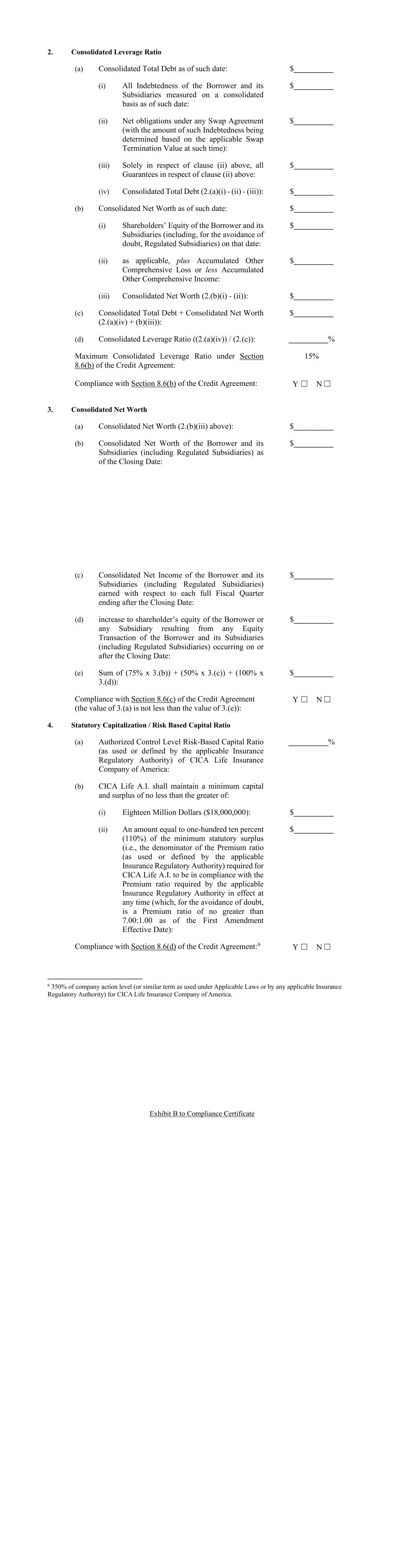 2. Consolidated Leverage Ratio (a) Consolidated Total Debt as of such date: $__________ (i) All Indebtedness of the Borrower and its Subsidiaries measured on a consolidated basis as of such date: $__________ (ii) Net obligations under any Swap Agreement (with the amount of such Indebtedness being determined based on the applicable Swap Termination Value at such time): $__________ (iii) Solely in respect of clause (ii) above, all Guarantees in respect of clause (ii) above: $__________ (iv) Consolidated Total Debt (2.(a)(i) - (ii) - (iii)): $__________ (b) Consolidated Net Worth as of such date: $__________ (i) Shareholders’ Equity of the Borrower and its Subsidiaries (including, for the avoidance of doubt, Regulated Subsidiaries) on that date: $__________ (ii) as applicable, plus Accumulated Other Comprehensive Loss or less Accumulated Other Comprehensive Income: $__________ (iii) Consolidated Net Worth (2.(b)(i) - (ii)): $__________ (c) Consolidated Total Debt + Consolidated Net Worth (2.(a)(iv) + (b)(iii)): $__________ (d) Consolidated Leverage Ratio ((2.(a)(iv)) / (2.(c)): __________% Maximum Consolidated Leverage Ratio under Section 8.6(b) of the Credit Agreement: 15% Compliance with Section 8.6(b) of the Credit Agreement: Y ☐ N ☐ 3. Consolidated Net Worth (a) Consolidated Net Worth (2.(b)(iii) above): $__________ (b) Consolidated Net Worth of the Borrower and its Subsidiaries (including Regulated Subsidiaries) as of the Closing Date: $__________ (c) Consolidated Net Income of the Borrower and its Subsidiaries (including Regulated Subsidiaries) earned with respect to each full Fiscal Quarter ending after the Closing Date: $__________ (d) increase to shareholder’s equity of the Borrower or any Subsidiary resulting from any Equity Transaction of the Borrower and its Subsidiaries (including Regulated Subsidiaries) occurring on or after the Closing Date: $__________ (e) Sum of (75% x 3.(b)) + (50% x 3.(c)) + (100% x 3.(d)): $__________ Compliance with Section 8.6(c) of the Credit Agreement (the value of 3.(a) is not less than the value of 3.(e)): Y ☐ N ☐ 4. Statutory Capitalization / Risk Based Capital Ratio (a) Authorized Control Level Risk-Based Capital Ratio (as used or defined by the applicable Insurance Regulatory Authority) of CICA Life Insurance Company of America: __________% (b) CICA Life A.I. shall maintain a minimum capital and surplus of no less than the greater of: (i) Eighteen Million Dollars ($18,000,000): $__________ (ii) An amount equal to one-hundred ten percent (110%) of the minimum statutory surplus (i.e., the denominator of the Premium ratio (as used or defined by the applicable Insurance Regulatory Authority) required for CICA Life A.I. to be in compliance with the Premium ratio required by the applicable Insurance Regulatory Authority in effect at any time (which, for the avoidance of doubt, is a Premium ratio of no greater than 7.00:1.00 as of the First Amendment Effective Date): $__________ Compliance with Section 8.6(d) of the Credit Agreement:6 Y ☐ N ☐ 6 350% of company action level (or similar term as used under Applicable Laws or by any applicable Insurance Regulatory Authority) for CICA Life Insurance Company of America. Exhibit B to Compliance Certificate