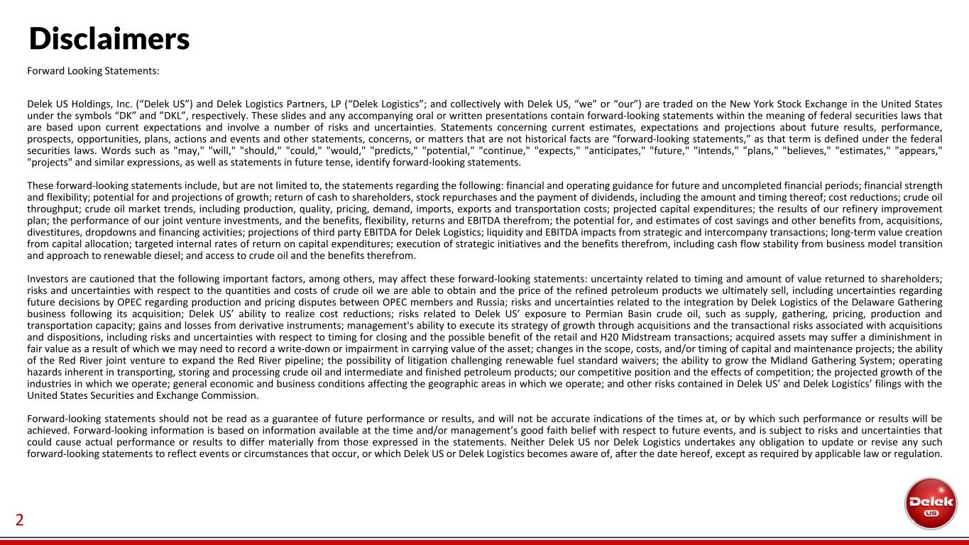 2 Disclaimers Forward Looking Statements: Delek US Holdings, Inc. (“Delek US”) and Delek Logistics Partners, LP (“Delek Logistics”; and collectively with Delek US, “we” or “our”) are traded on the New York Stock Exchange in the United States under the symbols “DK” and ”DKL”, respectively. These slides and any accompanying oral or written presentations contain forward-looking statements within the meaning of federal securities laws that are based upon current expectations and involve a number of risks and uncertainties. Statements concerning current estimates, expectations and projections about future results, performance, prospects, opportunities, plans, actions and events and other statements, concerns, or matters that are not historical facts are “forward-looking statements,” as that term is defined under the federal securities laws. Words such as "may," "will," "should," "could," "would," "predicts," "potential," "continue," "expects," "anticipates," "future," "intends," "plans," "believes," "estimates," "appears," "projects" and similar expressions, as well as statements in future tense, identify forward-looking statements. These forward-looking statements include, but are not limited to, the statements regarding the following: financial and operating guidance for future and uncompleted financial periods; financial strength and flexibility; potential for and projections of growth; return of cash to shareholders, stock repurchases and the payment of dividends, including the amount and timing thereof; cost reductions; crude oil throughput; crude oil market trends, including production, quality, pricing, demand, imports, exports and transportation costs; projected capital expenditures; the results of our refinery improvement plan; the performance of our joint venture investments, and the benefits, flexibility, returns and EBITDA therefrom; the potential for, and estimates of cost savings and other benefits from, acquisitions, divestitures, dropdowns and financing activities; projections of third party EBITDA for Delek Logistics; liquidity and EBITDA impacts from strategic and intercompany transactions; long-term value creation from capital allocation; targeted internal rates of return on capital expenditures; execution of strategic initiatives and the benefits therefrom, including cash flow stability from business model transition and approach to renewable diesel; and access to crude oil and the benefits therefrom. Investors are cautioned that the following important factors, among others, may affect these forward-looking statements: uncertainty related to timing and amount of value returned to shareholders; risks and uncertainties with respect to the quantities and costs of crude oil we are able to obtain and the price of the refined petroleum products we ultimately sell, including uncertainties regarding future decisions by OPEC regarding production and pricing disputes between OPEC members and Russia; risks and uncertainties related to the integration by Delek Logistics of the Delaware Gathering business following its acquisition; Delek US’ ability to realize cost reductions; risks related to Delek US’ exposure to Permian Basin crude oil, such as supply, gathering, pricing, production and transportation capacity; gains and losses from derivative instruments; management's ability to execute its strategy of growth through acquisitions and the transactional risks associated with acquisitions and dispositions, including risks and uncertainties with respect to timing for closing and the possible benefit of the retail and H20 Midstream transactions; acquired assets may suffer a diminishment in fair value as a result of which we may need to record a write-down or impairment in carrying value of the asset; changes in the scope, costs, and/or timing of capital and maintenance projects; the ability of the Red River joint venture to expand the Red River pipeline; the possibility of litigation challenging renewable fuel standard waivers; the ability to grow the Midland Gathering System; operating hazards inherent in transporting, storing and processing crude oil and intermediate and finished petroleum products; our competitive position and the effects of competition; the projected growth of the industries in which we operate; general economic and business conditions affecting the geographic areas in which we operate; and other risks contained in Delek US’ and Delek Logistics’ filings with the United States Securities and Exchange Commission. Forward-looking statements should not be read as a guarantee of future performance or results, and will not be accurate indications of the times at, or by which such performance or results will be achieved. Forward-looking information is based on information available at the time and/or management’s good faith belief with respect to future events, and is subject to risks and uncertainties that could cause actual performance or results to differ materially from those expressed in the statements. Neither Delek US nor Delek Logistics undertakes any obligation to update or revise any such forward-looking statements to reflect events or circumstances that occur, or which Delek US or Delek Logistics becomes aware of, after the date hereof, except as required by applicable law or regulation.