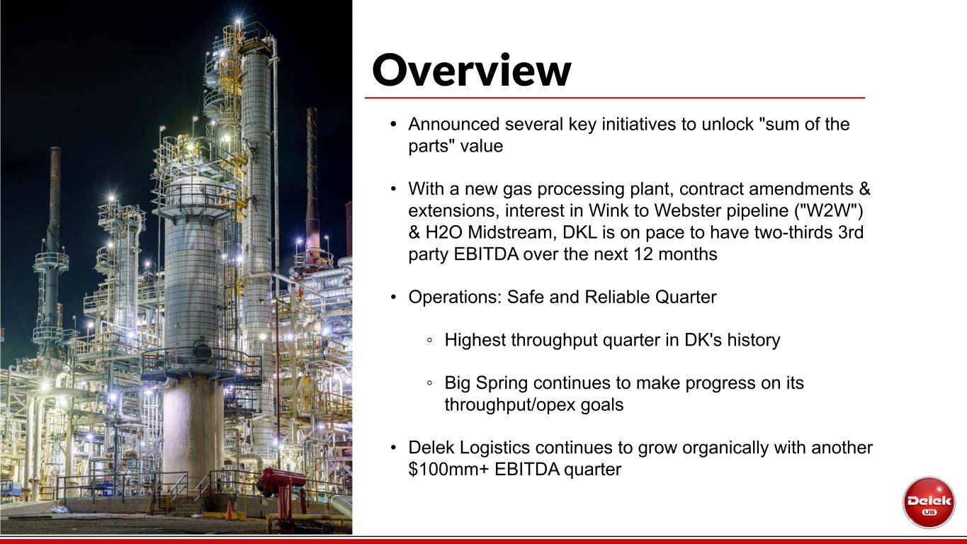 “We are excited about the significant progress we have made on our 'Sum of the Parts' efforts,” said Avigal Soreq, President and Chief Executive Officer of Delek US. “We concluded the strategic review of our retail assets. Following the review, we have announced the sale of our retail business to FEMSA. Delek US & Delek Logistics executed on 'win-win' contract amendments and extensions as well as drop-down of our interest in the Wink to Webster pipeline. A combination of our retail sale, drop-down of our interest in the Wink to Webster pipeline, and amendments & extensions of contracts between DK & DKL will allow for a cash infusion of over $500mm in DK with little to no loss in standalone DK EBITDA. At the same time, a combination of contract extensions, acquisition of Wink to Webster interest, new processing plant and acquisition of H2O Midstream will enable DKL to continue to have among the best combination of cash flow growth and distributions amongst its peers.”