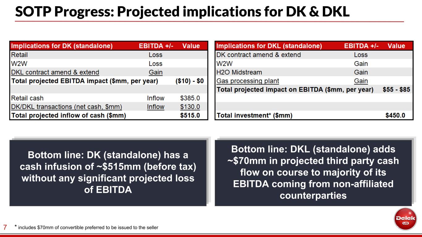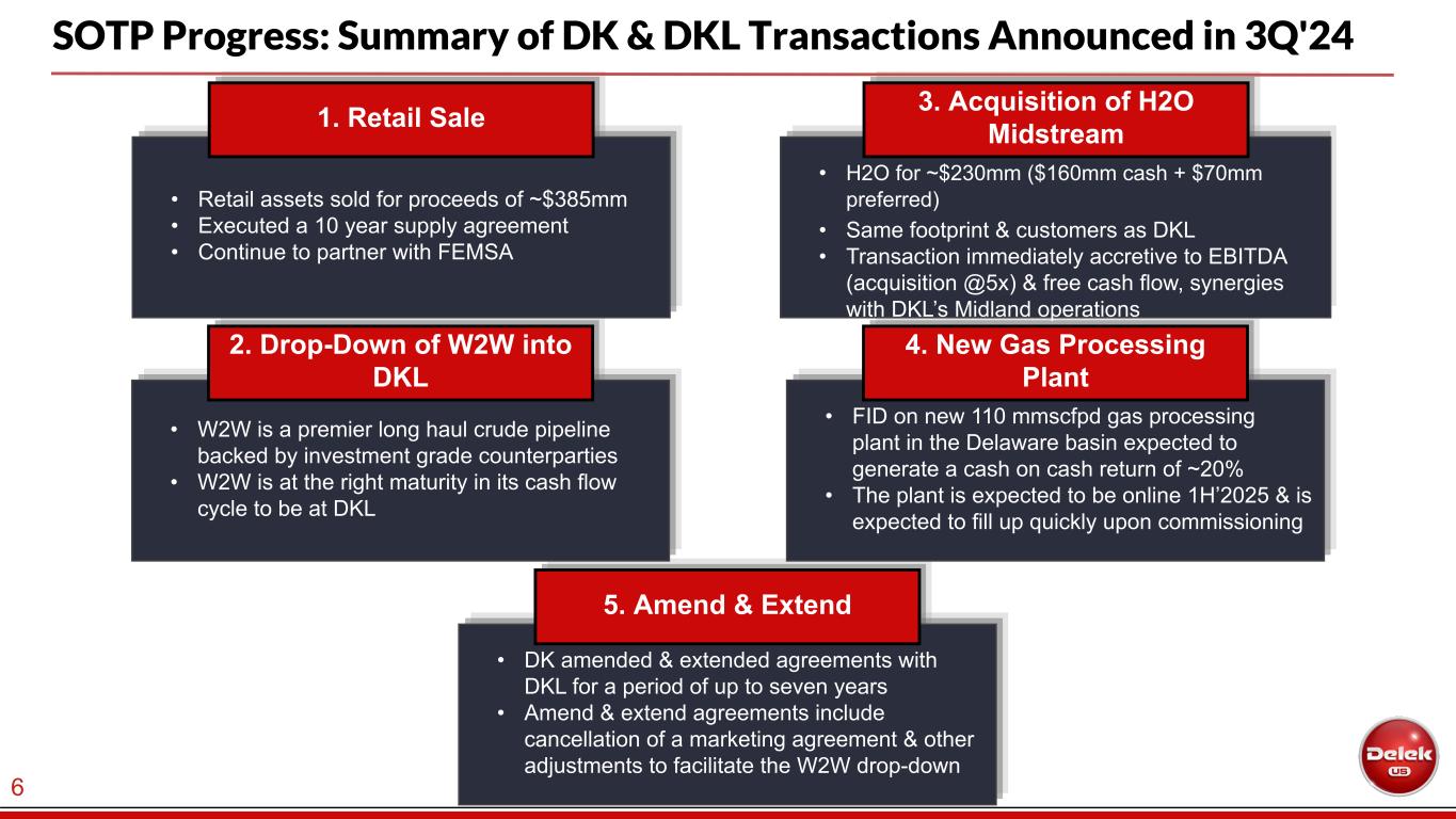 • Retail assets sold for proceeds of ~$385mm • Executed a 10 year supply agreement • Continue to partner with FEMSA SOTP Progress: Summary of DK & DKL Transactions Announced in 3Q'24 1. Retail Sale • H2O for ~$230mm ($160mm cash + $70mm preferred) • Same footprint & customers as DKL • Transaction immediately accretive to EBITDA (acquisition @5x) & free cash flow, synergies with DKL’s Midland operations 3. Acquisition of H2O Midstream • W2W is a premier long haul crude pipeline backed by investment grade counterparties • W2W is at the right maturity in its cash flow cycle to be at DKL 2. Drop-Down of W2W into DKL • FID on new 110 mmscfpd gas processing plant in the Delaware basin expected to generate a cash on cash return of ~20% • The plant is expected to be online 1H’2025 & is expected to fill up quickly upon commissioning 4. New Gas Processing Plant • DK amended & extended agreements with DKL for a period of up to seven years • Amend & extend agreements include cancellation of a marketing agreement & other adjustments to facilitate the W2W drop-down 5. Amend & Extend 6