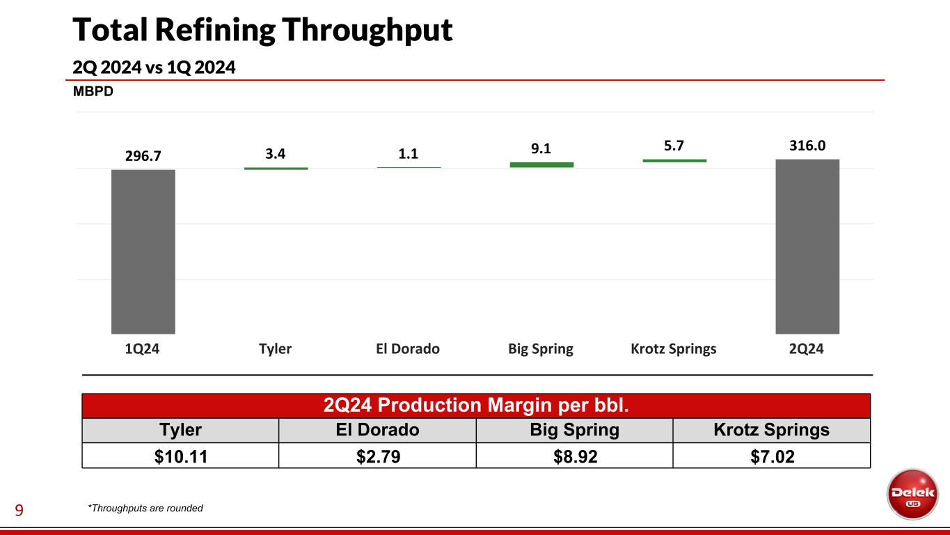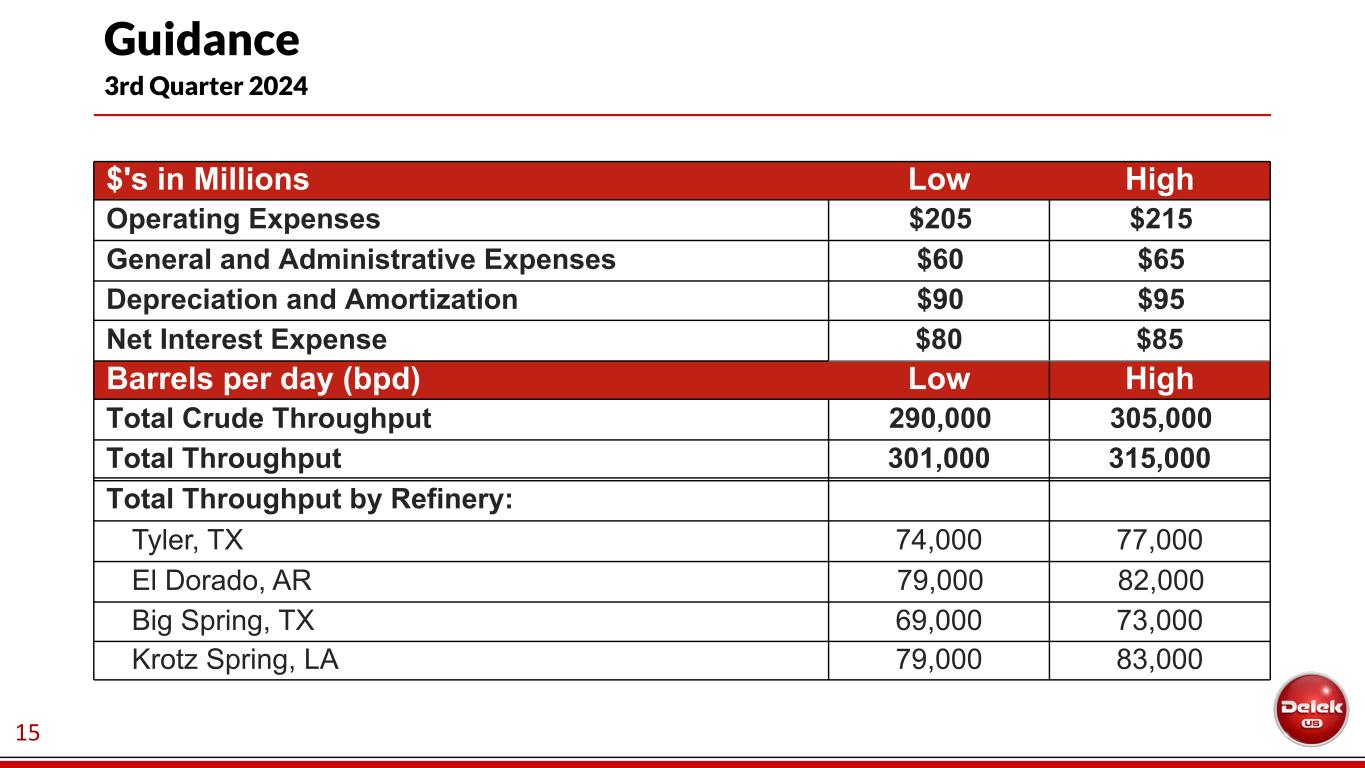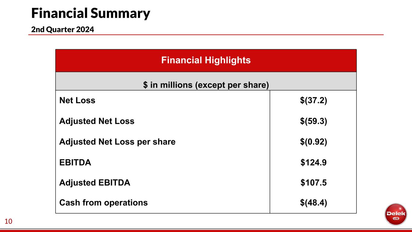 BRENTWOOD, Tenn.-- August 6, 2024 -- Delek US Holdings, Inc. (NYSE: DK) (“Delek US”, "Company") today announced financial results for its second quarter ended June 30, 2024.