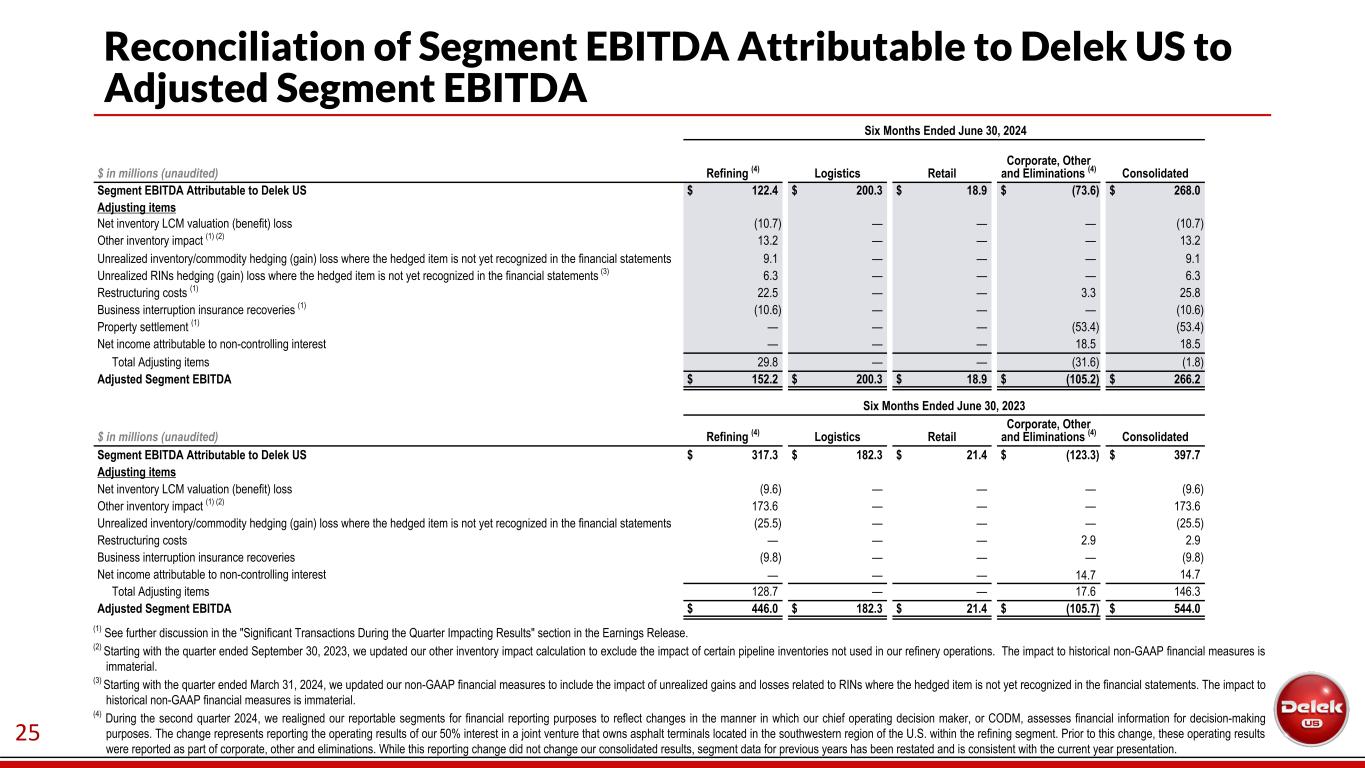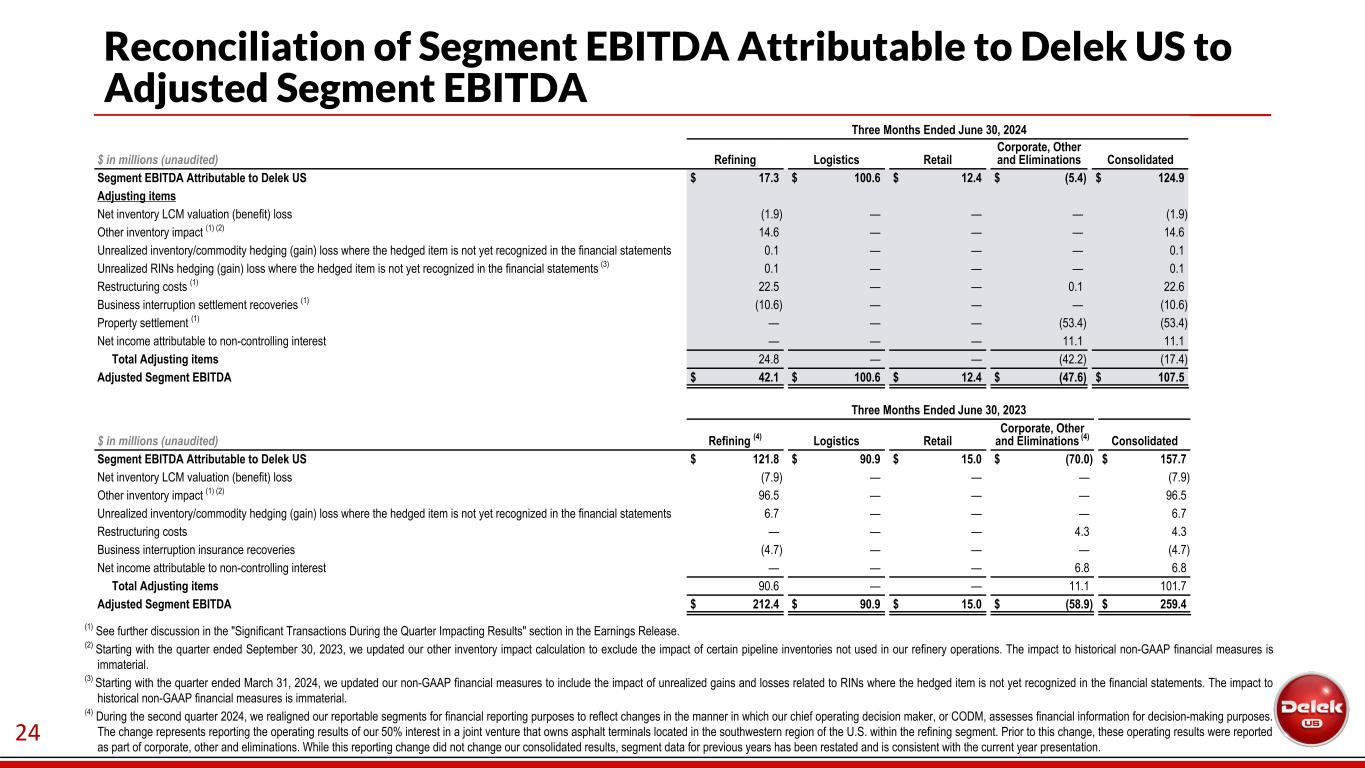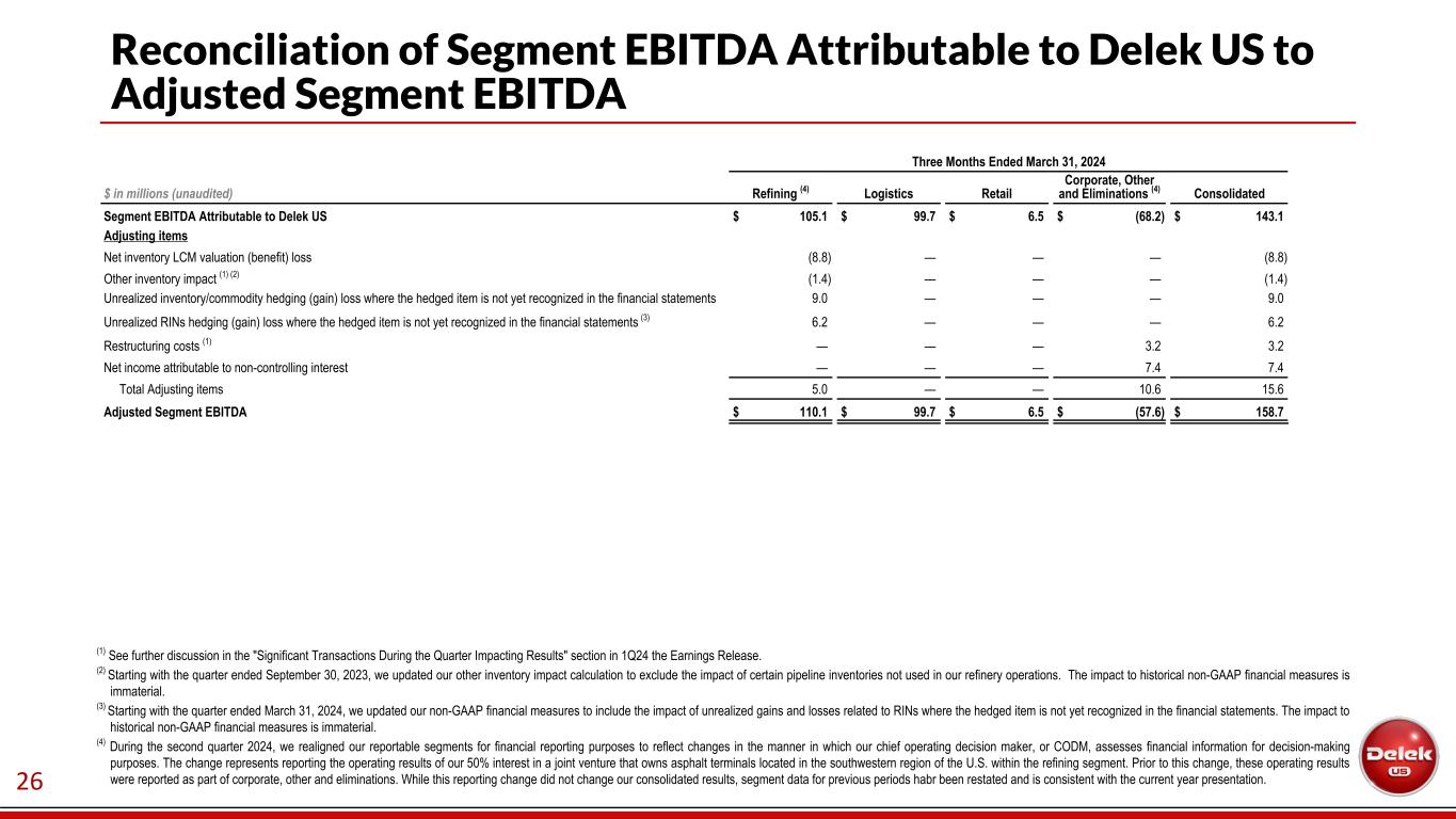 25 Reconciliation of Segment EBITDA Attributable to Delek US to Adjusted Segment EBITDA (1) See further discussion in the "Significant Transactions During the Quarter Impacting Results" section in the Earnings Release. (2) Starting with the quarter ended September 30, 2023, we updated our other inventory impact calculation to exclude the impact of certain pipeline inventories not used in our refinery operations. The impact to historical non-GAAP financial measures is immaterial. (3) Starting with the quarter ended March 31, 2024, we updated our non-GAAP financial measures to include the impact of unrealized gains and losses related to RINs where the hedged item is not yet recognized in the financial statements. The impact to historical non-GAAP financial measures is immaterial. (4) During the second quarter 2024, we realigned our reportable segments for financial reporting purposes to reflect changes in the manner in which our chief operating decision maker, or CODM, assesses financial information for decision-making purposes. The change represents reporting the operating results of our 50% interest in a joint venture that owns asphalt terminals located in the southwestern region of the U.S. within the refining segment. Prior to this change, these operating results were reported as part of corporate, other and eliminations. While this reporting change did not change our consolidated results, segment data for previous years has been restated and is consistent with the current year presentation. Six Months Ended June 30, 2024 $ in millions (unaudited) Refining (4) Logistics Retail Corporate, Other and Eliminations (4) Consolidated Segment EBITDA Attributable to Delek US $ 122.4 $ 200.3 $ 18.9 $ (73.6) $ 268.0 Adjusting items Net inventory LCM valuation (benefit) loss (10.7) — — — (10.7) Other inventory impact (1) (2) 13.2 — — — 13.2 Unrealized inventory/commodity hedging (gain) loss where the hedged item is not yet recognized in the financial statements 9.1 — — — 9.1 Unrealized RINs hedging (gain) loss where the hedged item is not yet recognized in the financial statements (3) 6.3 — — — 6.3 Restructuring costs (1) 22.5 — — 3.3 25.8 Business interruption insurance recoveries (1) (10.6) — — — (10.6) Property settlement (1) — — — (53.4) (53.4) Net income attributable to non-controlling interest — — — 18.5 18.5 Total Adjusting items 29.8 — — (31.6) (1.8) Adjusted Segment EBITDA $ 152.2 $ 200.3 $ 18.9 $ (105.2) $ 266.2 Six Months Ended June 30, 2023 $ in millions (unaudited) Refining (4) Logistics Retail Corporate, Other and Eliminations (4) Consolidated Segment EBITDA Attributable to Delek US $ 317.3 $ 182.3 $ 21.4 $ (123.3) $ 397.7 Adjusting items Net inventory LCM valuation (benefit) loss (9.6) — — — (9.6) Other inventory impact (1) (2) 173.6 — — — 173.6 Unrealized inventory/commodity hedging (gain) loss where the hedged item is not yet recognized in the financial statements (25.5) — — — (25.5) Restructuring costs — — — 2.9 2.9 Business interruption insurance recoveries (9.8) — — — (9.8) Net income attributable to non-controlling interest — — — 14.7 14.7 Total Adjusting items 128.7 — — 17.6 146.3 Adjusted Segment EBITDA $ 446.0 $ 182.3 $ 21.4 $ (105.7) $ 544.0