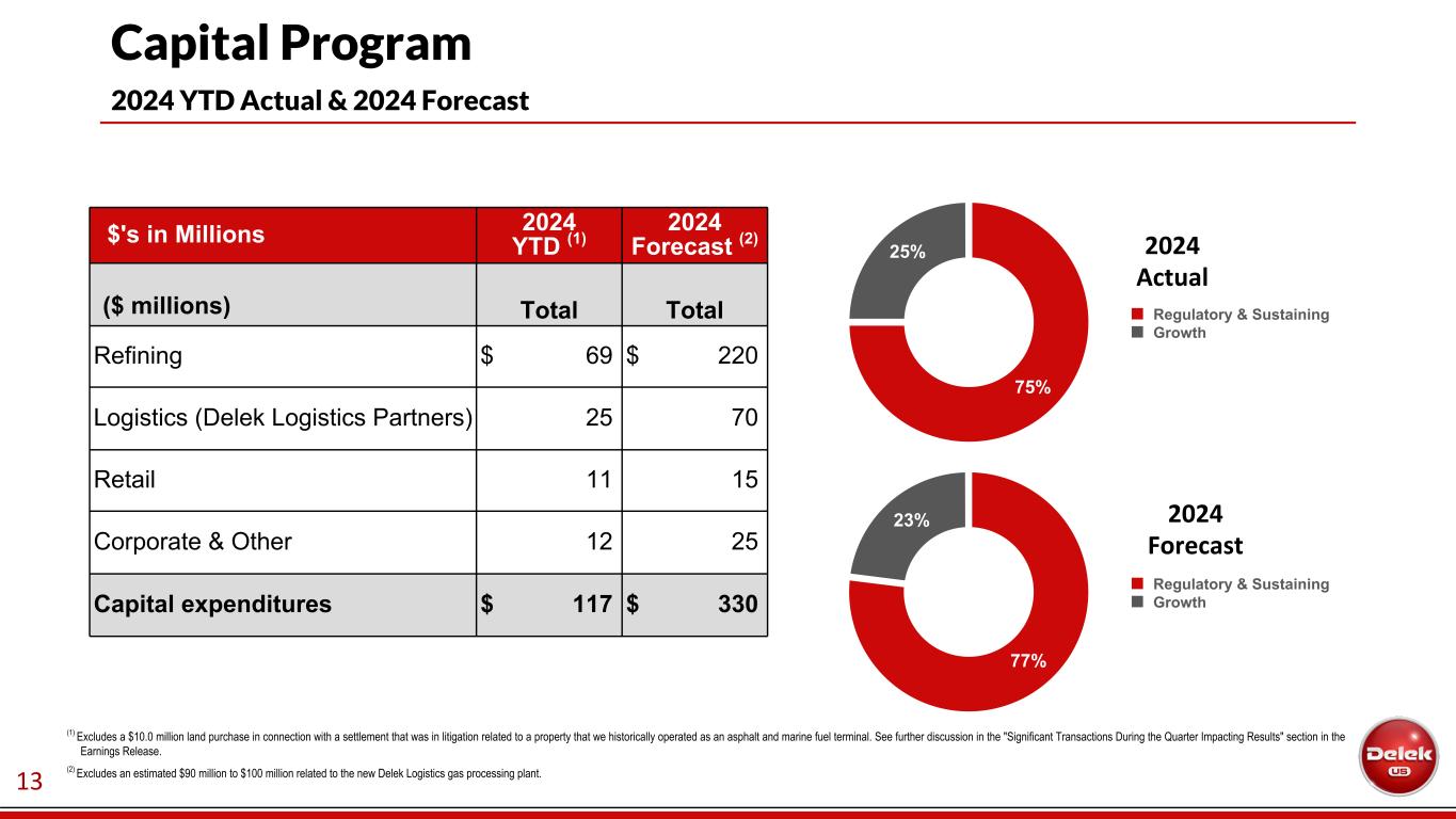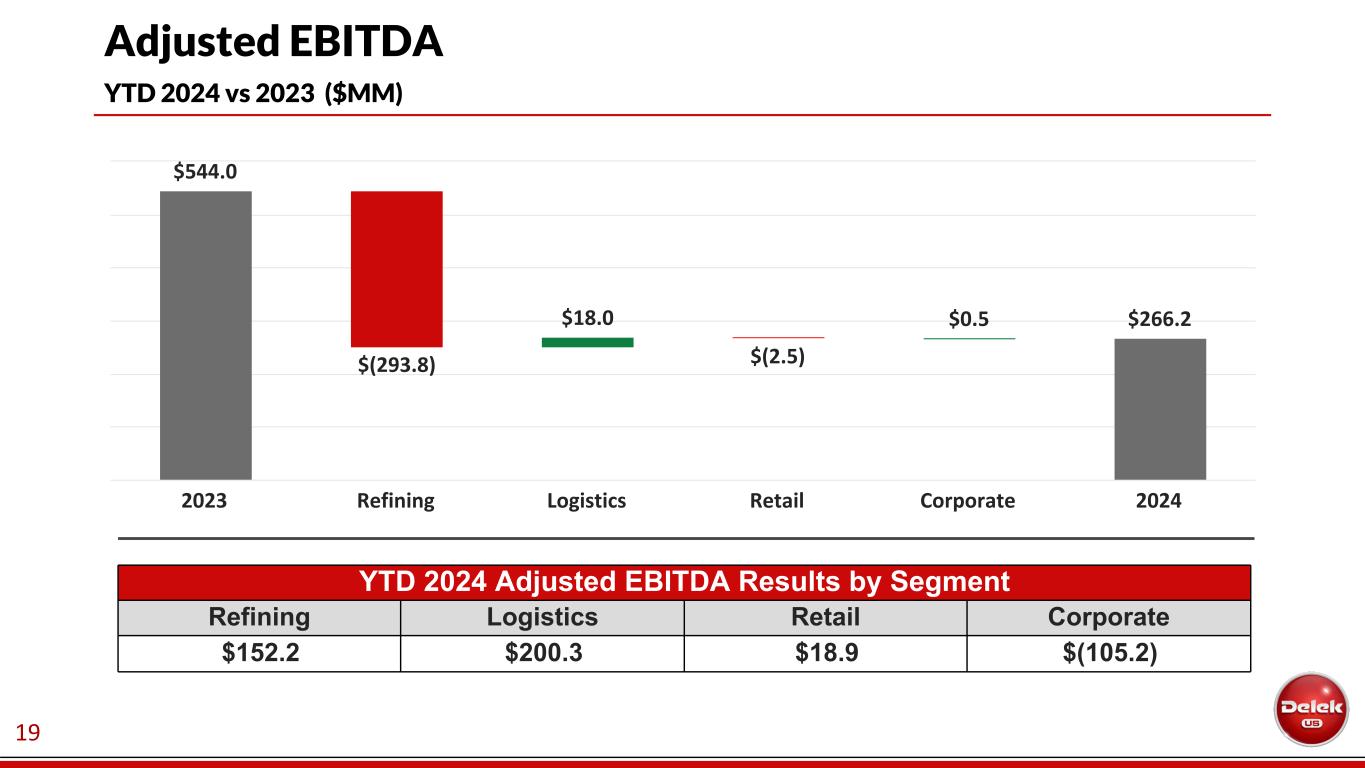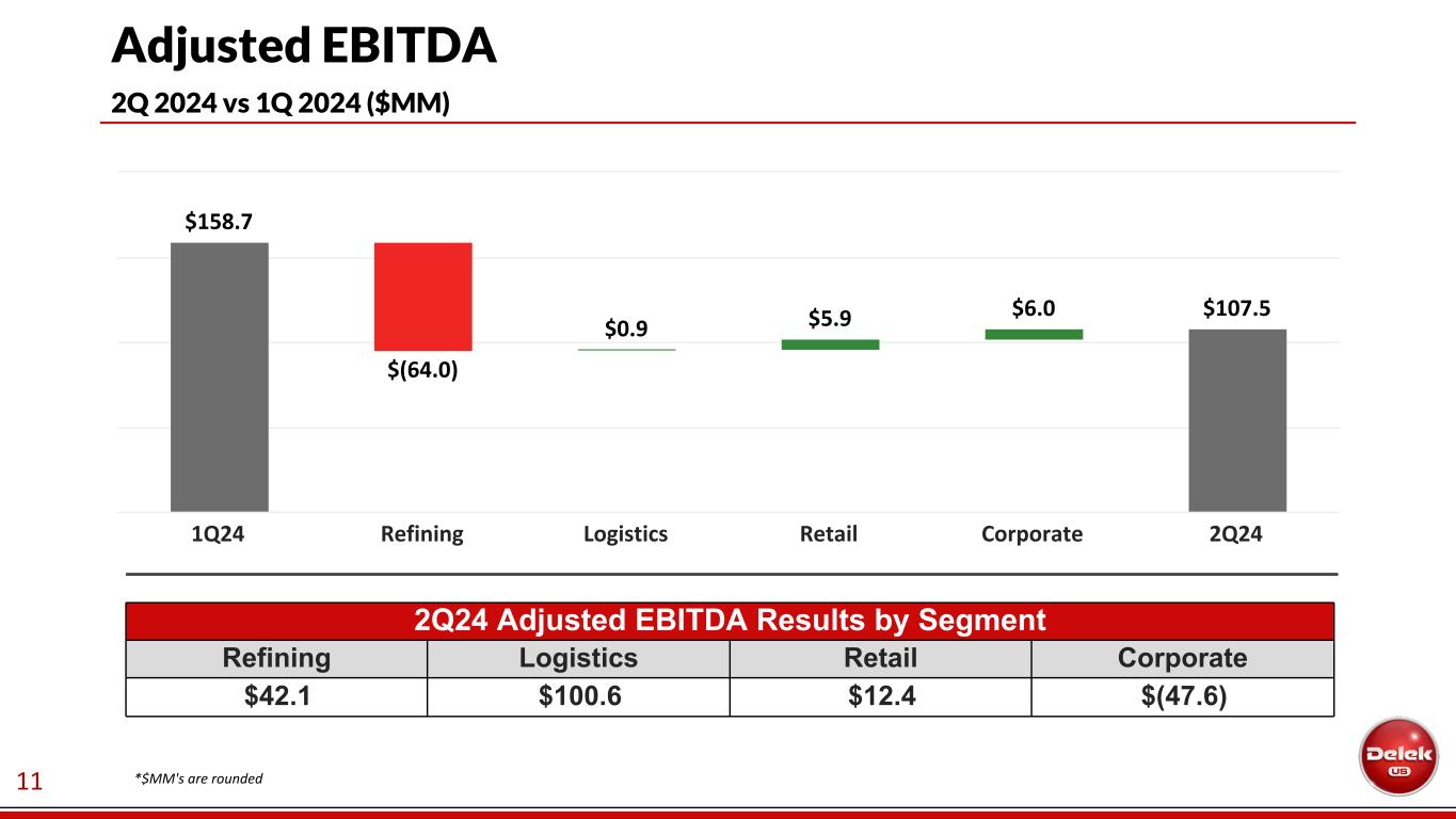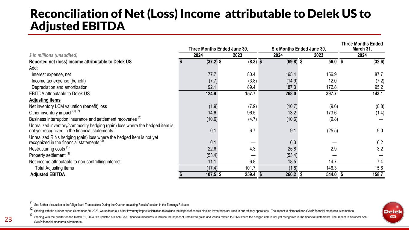 25 Reconciliation of Segment EBITDA Attributable to Delek US to Adjusted Segment EBITDA (1) See further discussion in the "Significant Transactions During the Quarter Impacting Results" section in the Earnings Release. (2) Starting with the quarter ended September 30, 2023, we updated our other inventory impact calculation to exclude the impact of certain pipeline inventories not used in our refinery operations. The impact to historical non-GAAP financial measures is immaterial. (3) Starting with the quarter ended March 31, 2024, we updated our non-GAAP financial measures to include the impact of unrealized gains and losses related to RINs where the hedged item is not yet recognized in the financial statements. The impact to historical non-GAAP financial measures is immaterial. (4) During the second quarter 2024, we realigned our reportable segments for financial reporting purposes to reflect changes in the manner in which our chief operating decision maker, or CODM, assesses financial information for decision-making purposes. The change represents reporting the operating results of our 50% interest in a joint venture that owns asphalt terminals located in the southwestern region of the U.S. within the refining segment. Prior to this change, these operating results were reported as part of corporate, other and eliminations. While this reporting change did not change our consolidated results, segment data for previous years has been restated and is consistent with the current year presentation. Six Months Ended June 30, 2024 $ in millions (unaudited) Refining (4) Logistics Retail Corporate, Other and Eliminations (4) Consolidated Segment EBITDA Attributable to Delek US $ 122.4 $ 200.3 $ 18.9 $ (73.6) $ 268.0 Adjusting items Net inventory LCM valuation (benefit) loss (10.7) — — — (10.7) Other inventory impact (1) (2) 13.2 — — — 13.2 Unrealized inventory/commodity hedging (gain) loss where the hedged item is not yet recognized in the financial statements 9.1 — — — 9.1 Unrealized RINs hedging (gain) loss where the hedged item is not yet recognized in the financial statements (3) 6.3 — — — 6.3 Restructuring costs (1) 22.5 — — 3.3 25.8 Business interruption insurance recoveries (1) (10.6) — — — (10.6) Property settlement (1) — — — (53.4) (53.4) Net income attributable to non-controlling interest — — — 18.5 18.5 Total Adjusting items 29.8 — — (31.6) (1.8) Adjusted Segment EBITDA $ 152.2 $ 200.3 $ 18.9 $ (105.2) $ 266.2 Six Months Ended June 30, 2023 $ in millions (unaudited) Refining (4) Logistics Retail Corporate, Other and Eliminations (4) Consolidated Segment EBITDA Attributable to Delek US $ 317.3 $ 182.3 $ 21.4 $ (123.3) $ 397.7 Adjusting items Net inventory LCM valuation (benefit) loss (9.6) — — — (9.6) Other inventory impact (1) (2) 173.6 — — — 173.6 Unrealized inventory/commodity hedging (gain) loss where the hedged item is not yet recognized in the financial statements (25.5) — — — (25.5) Restructuring costs — — — 2.9 2.9 Business interruption insurance recoveries (9.8) — — — (9.8) Net income attributable to non-controlling interest — — — 14.7 14.7 Total Adjusting items 128.7 — — 17.6 146.3 Adjusted Segment EBITDA $ 446.0 $ 182.3 $ 21.4 $ (105.7) $ 544.0