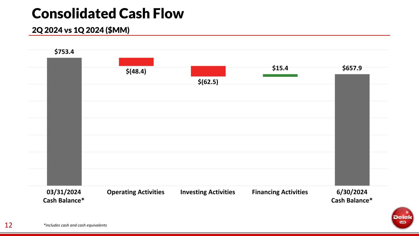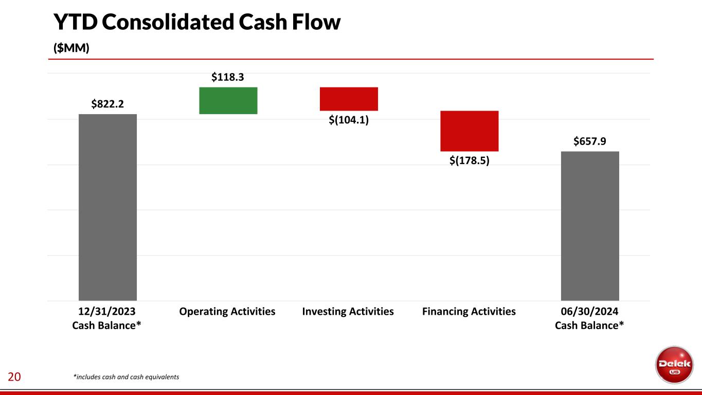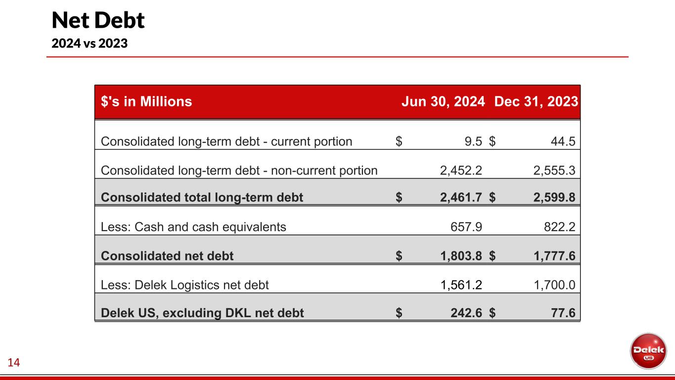 As of June 30, 2024, Delek US had a cash balance of $657.9 million and total consolidated long-term debt of $2,461.7 million, resulting in net debt of $1,803.8 million. As of June 30, 2024, Delek Logistics Partners, LP (NYSE: DKL) ("Delek Logistics") had $5.1 million of cash and $1,566.3 million of total long-term debt, which are included in the consolidated amounts on Delek US' balance sheet. Excluding Delek Logistics, Delek US had $652.8 million in cash and $895.4 million of long-term debt, or a $242.6 million net debt position.