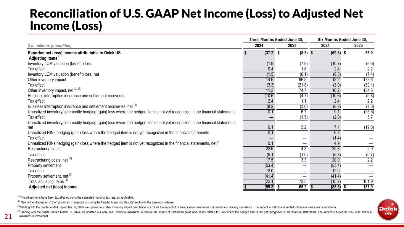 23 Reconciliation of Net (Loss) Income attributable to Delek US to Adjusted EBITDA Three Months Ended June 30, Six Months Ended June 30, Three Months Ended March 31, $ in millions (unaudited) 2024 2023 2024 2023 2024 Reported net (loss) income attributable to Delek US $ (37.2) $ (8.3) $ (69.8) $ 56.0 $ (32.6) Add: Interest expense, net 77.7 80.4 165.4 156.9 87.7 Income tax expense (benefit) (7.7) (3.8) (14.9) 12.0 (7.2) Depreciation and amortization 92.1 89.4 187.3 172.8 95.2 EBITDA attributable to Delek US 124.9 157.7 268.0 397.7 143.1 Adjusting items Net inventory LCM valuation (benefit) loss (1.9) (7.9) (10.7) (9.6) (8.8) Other inventory impact (1) (2) 14.6 96.5 13.2 173.6 (1.4) Business interruption insurance and settlement recoveries (1) (10.6) (4.7) (10.6) (9.8) — Unrealized inventory/commodity hedging (gain) loss where the hedged item is not yet recognized in the financial statements 0.1 6.7 9.1 (25.5) 9.0 Unrealized RINs hedging (gain) loss where the hedged item is not yet recognized in the financial statements (3) 0.1 — 6.3 — 6.2 Restructuring costs (1) 22.6 4.3 25.8 2.9 3.2 Property settlement (1) (53.4) — (53.4) — — Net income attributable to non-controlling interest 11.1 6.8 18.5 14.7 7.4 Total Adjusting items (17.4) 101.7 (1.8) 146.3 15.6 Adjusted EBITDA $ 107.5 $ 259.4 $ 266.2 $ 544.0 $ 158.7 (1) See further discussion in the "Significant Transactions During the Quarter Impacting Results" section in the Earnings Release. (2) Starting with the quarter ended September 30, 2023, we updated our other inventory impact calculation to exclude the impact of certain pipeline inventories not used in our refinery operations. The impact to historical non-GAAP financial measures is immaterial. (3) Starting with the quarter ended March 31, 2024, we updated our non-GAAP financial measures to include the impact of unrealized gains and losses related to RINs where the hedged item is not yet recognized in the financial statements. The impact to historical non- GAAP financial measures is immaterial.
