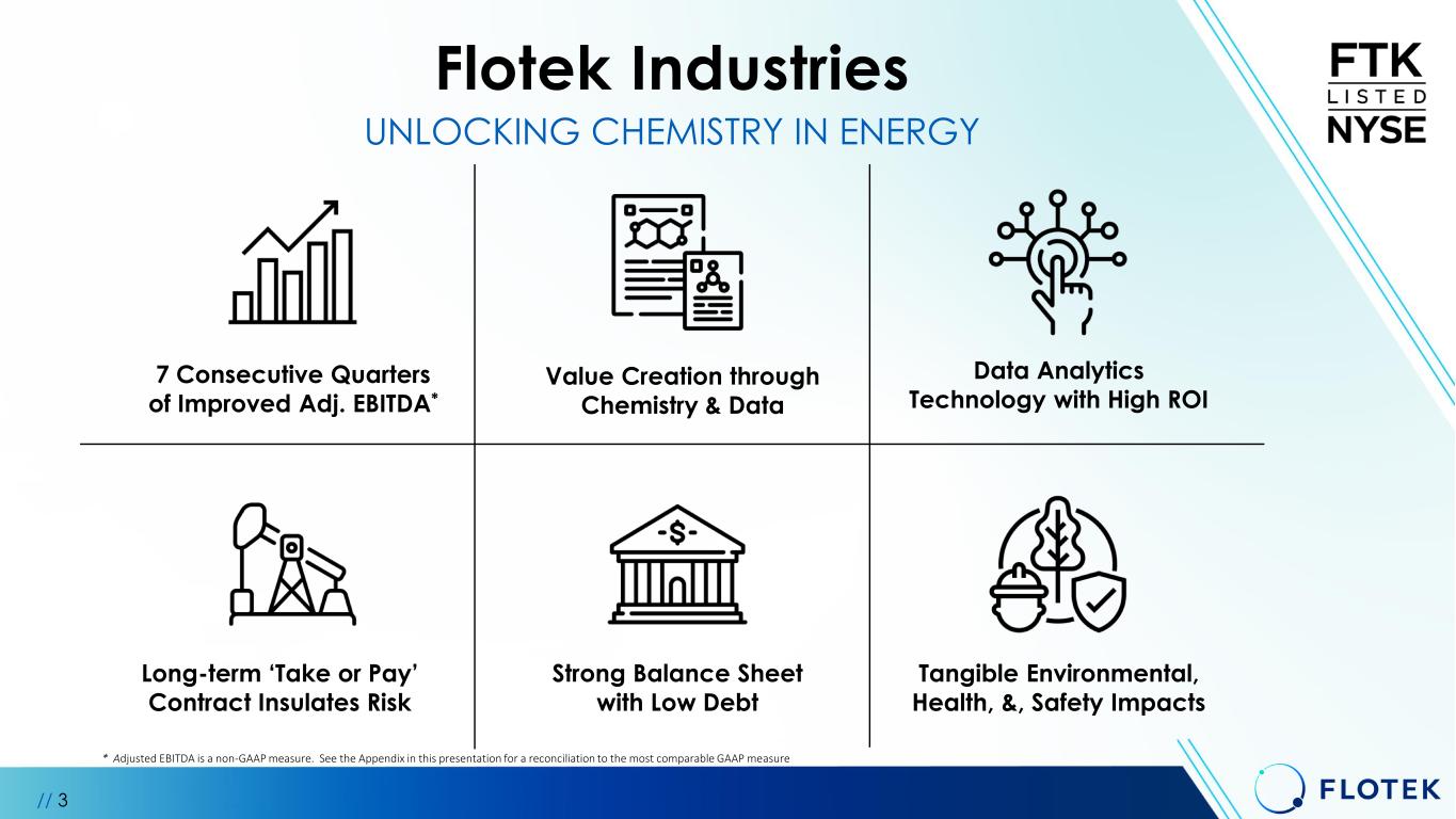 Forward-Looking Statements Certain statements set forth in this presentation constitute forward-looking statements (within the meaning of Section 27A of the Securities Act of 1933 and Section 21E of the Securities Exchange Act of 1934) regarding Flotek Industries, Inc.’s business, financial condition, results of operations and prospects. Words such as will, continue, expects, anticipates, intends, plans, believes, seeks, estimates and similar expressions or variations of such words are intended to identify forward-looking statements, but are not the exclusive means of identifying forward-looking statements in this presentation. Although forward-looking statements in this presentation reflect the good faith judgment of management, such statements can only be based on facts and factors currently known to management. Consequently, forward-looking statements are inherently subject to risks and uncertainties, and actual results and outcomes may differ materially from the results and outcomes discussed in the forward-looking statements. Further information about the risks and uncertainties that may impact the Company are set forth in the Company’s most recent filing with the Securities and Exchange Commission on Form 10-K (including, without limitation, in the "Risk Factors" section thereof), and in the Company’s other SEC filings and publicly available documents. Readers are urged not to place undue reliance on these forward-looking statements, which speak only as of the date of this presentation. The Company undertakes no obligation to revise or update any forward-looking statements in order to reflect any event or circumstance that may arise after the date of this presentation. This presentation includes certain non-GAAP measures. Please refer to the reconciliations provided in the earnings press release and the appendix in this presentation for the most comparable GAAP measure. // 2