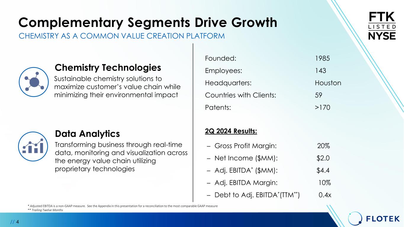 // 3 7 Consecutive Quarters of Improved Adj. EBITDA* Strong Balance Sheet with Low Debt Data Analytics Technology with High ROI Long-term ‘Take or Pay’ Contract Insulates Risk Tangible Environmental, Health, &, Safety Impacts Flotek Industries UNLOCKING CHEMISTRY IN ENERGY Value Creation through Chemistry & Data * Adjusted EBITDA is a non-GAAP measure. See the Appendix in this presentation for a reconciliation to the most comparable GAAP measure