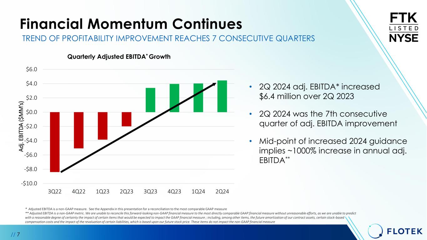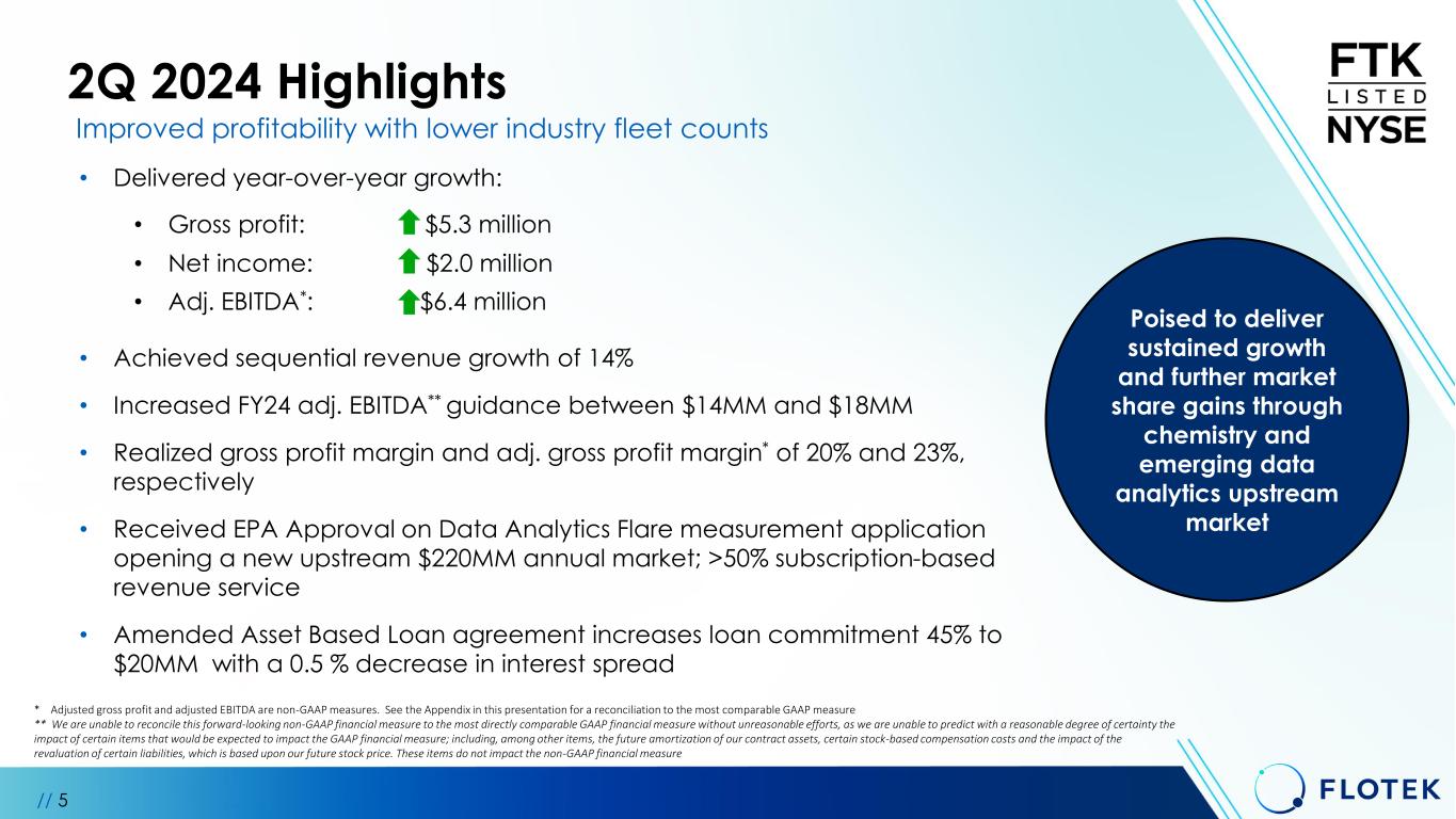•Adjusted Gross Profit (Non-GAAP)(1): Flotek generated adjusted gross profit of $10.7 million during the second quarter 2024 compared to adjusted gross profit of $5.1 million for the second quarter 2023. Adjusted gross profit excludes non-cash items, primarily amortization of contract assets.