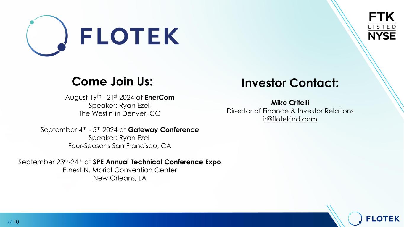 Investor Contact: Mike Critelli Director of Finance & Investor Relations ir@flotekind.com Come Join Us: August 19th - 21st 2024 at EnerCom Speaker: Ryan Ezell The Westin in Denver, CO September 4th - 5th 2024 at Gateway Conference Speaker: Ryan Ezell Four-Seasons San Francisco, CA September 23rd-24th at SPE Annual Technical Conference Expo Ernest N. Morial Convention Center New Orleans, LA // 10