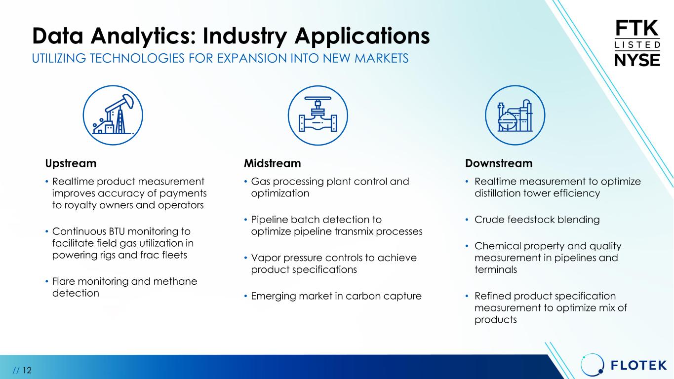 Data Analytics: Industry Applications Upstream • Realtime product measurement improves accuracy of payments to royalty owners and operators • Continuous BTU monitoring to facilitate field gas utilization in powering rigs and frac fleets • Flare monitoring and methane detection Midstream • Gas processing plant control and optimization • Pipeline batch detection to optimize pipeline transmix processes • Vapor pressure controls to achieve product specifications • Emerging market in carbon capture Downstream • Realtime measurement to optimize distillation tower efficiency • Crude feedstock blending • Chemical property and quality measurement in pipelines and terminals • Refined product specification measurement to optimize mix of products UTILIZING TECHNOLOGIES FOR EXPANSION INTO NEW MARKETS // 12