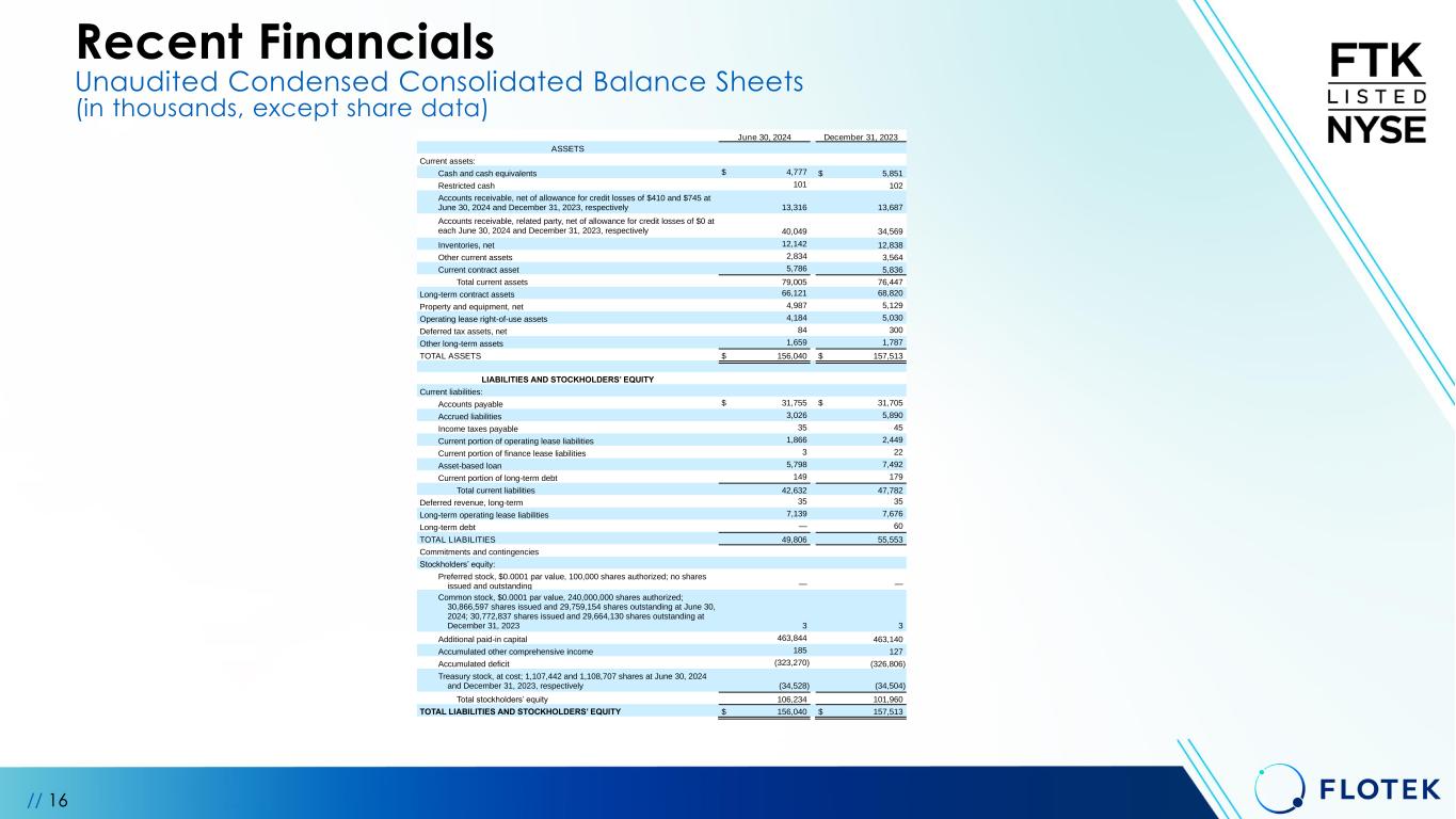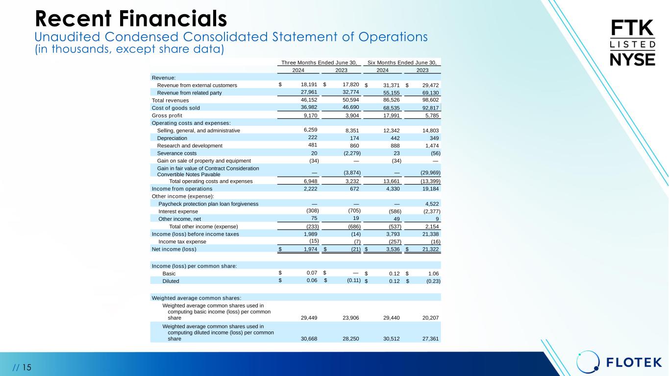 •Net Income and EPS: Flotek reported net income of $2.0 million, or $0.06 per diluted share, for the second quarter 2024. This compares to a net loss of $21 thousand, or $(0.11) per diluted share, for the second quarter 2023.