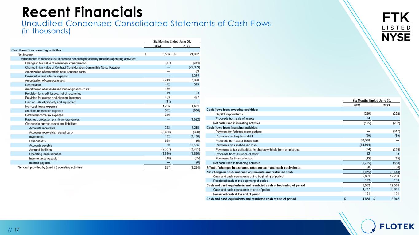 // 16 Recent Financials Unaudited Condensed Consolidated Balance Sheets (in thousands, except share data) June 30, 2024 December 31, 2023 ASSETS Current assets: Cash and cash equivalents $ 4,777 $ 5,851 Restricted cash 101 102 Accounts receivable, net of allowance for credit losses of $410 and $745 at June 30, 2024 and December 31, 2023, respectively 13,316 13,687 Accounts receivable, related party, net of allowance for credit losses of $0 at each June 30, 2024 and December 31, 2023, respectively 40,049 34,569 Inventories, net 12,142 12,838 Other current assets 2,834 3,564 Current contract asset 5,786 5,836 Total current assets 79,005 76,447 Long-term contract assets 66,121 68,820 Property and equipment, net 4,987 5,129 Operating lease right-of-use assets 4,184 5,030 Deferred tax assets, net 84 300 Other long-term assets 1,659 1,787 TOTAL ASSETS $ 156,040 $ 157,513 LIABILITIES AND STOCKHOLDERS’ EQUITY Current liabilities: Accounts payable $ 31,755 $ 31,705 Accrued liabilities 3,026 5,890 Income taxes payable 35 45 Current portion of operating lease liabilities 1,866 2,449 Current portion of finance lease liabilities 3 22 Asset-based loan 5,798 7,492 Current portion of long-term debt 149 179 Total current liabilities 42,632 47,782 Deferred revenue, long-term 35 35 Long-term operating lease liabilities 7,139 7,676 Long-term debt — 60 TOTAL LIABILITIES 49,806 55,553 Commitments and contingencies Stockholders’ equity: Preferred stock, $0.0001 par value, 100,000 shares authorized; no shares issued and outstanding — — Common stock, $0.0001 par value, 240,000,000 shares authorized; 30,866,597 shares issued and 29,759,154 shares outstanding at June 30, 2024; 30,772,837 shares issued and 29,664,130 shares outstanding at December 31, 2023 3 3 Additional paid-in capital 463,844 463,140 Accumulated other comprehensive income 185 127 Accumulated deficit (323,270) (326,806) Treasury stock, at cost; 1,107,442 and 1,108,707 shares at June 30, 2024 and December 31, 2023, respectively (34,528) (34,504) Total stockholders’ equity 106,234 101,960 TOTAL LIABILITIES AND STOCKHOLDERS’ EQUITY $ 156,040 $ 157,513