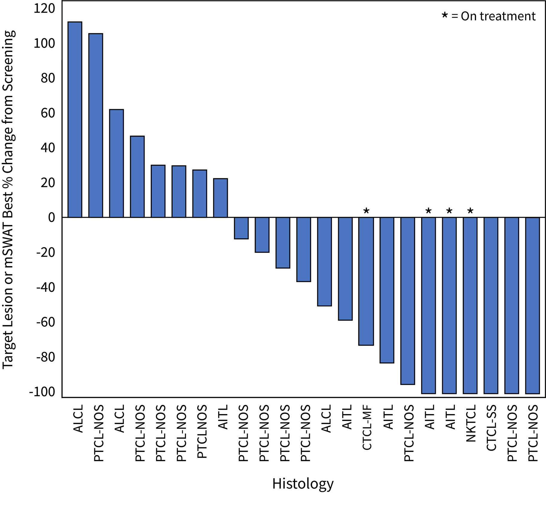 Waterfall Plot for Patients in the 200 mg Dose Cohort of the Soquelitinib Phase 1/1b Clinical Trial for Peripheral T Cell Lymphoma. The plot shows the best percent change in tumor volume in the 23 evaluable patients (eligible patient population), as of July 16, 2024, that were measurable by CT scan or by Modified Severity-Weighted Assessment Tool (mSWAT) for patients with cutaneous involvement. PTCL-NOS, peripheral T cell lymphoma not otherwise specified; CTCL, cutaneous T cell lymphoma of either Sezary or mycosis fungoides type; NKTCL, natural killer cell T cell lymphoma; ALCL, anaplastic large cell lymphoma; AITL, angioimmunoblastic T cell lymphoma.
