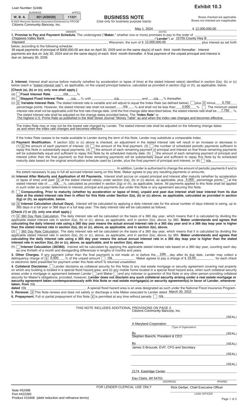 GENERAL RIDER TO BUSINESS NOTE This General Rider to Loan Documents ("Rider") is made and entered into as of May 1, 2024 (the "Effective Date") by and between Citizens Community Bancorp, Inc., a Maryland corporation ("Maker"), and Chippewa Valley Bank ("Lender"). WHEREAS, on the Effective Date, Maker is executing in favor of Lender a Business Note (the "Note") evidencing a loan in the original principal amount of $12,000,000.00 (the "Loan"); which constitutes a refinance of existing debt with Lender of March 30, 2022 and further modified February 27, 2023. WHEREAS, the obligations, liabilities and indebtedness of Maker with respect to the Loan will be secured by a security interest in certain investment property of Maker pursuant to the terms of a Collateral Pledge Agreement; and WHEREAS, Maker and Lender wish to amend the terms and provisions of the Note as set forth herein. NOW, THEREFORE, in consideration of the mutual covenants, agreements and promises herein contained, and for other good and valuable consideration, the receipt and sufficiency of which is acknowledged by all parties, the parties do hereby agree as follows, notwithstanding any other provisions to the contrary set forth in the Note: 1. Definitions. All capitalized terms used herein shall have the same meaning as defined in the Note, unless otherwise defined in this Rider. 2. Amendments to Note. The Note is hereby amended as follows: (a) The first sentence of Section 7 of the Note is deleted in its entirety and replaced with the following language: Upon the occurrence of any one or more of the following events of default: (a) Maker fails to pay any amount within 10 days after such amount is due under this Note or under any other instrument evidencing any indebtedness of Maker to Lender, (b) any representation or warranty made under this Note or information provided by Maker or any guarantor of this Note to Lender in connection with this Note is or was false or fraudulent in any material respect, (c) a material adverse change occurs in Maker's financial condition, (d) Maker fails to timely observe or perform any of the covenants or duties contained in this Note, (e) any guarantee of Maker's obligations under this Note is revoked or becomes unenforceable for any reason, (f) Maker, Maker's spouse or a surety or guarantor of this Note dies or ceases to exist, or (g) an event of default occurs under any agreement securing this Note, then the unpaid balance shall, at the option of Lender, without notice, mature and become immediately payable. Notwithstanding the foregoing, if an event of default occurs under Section 7(d), Customer shall have 10 days after notice thereof to cure such event of default, provided that Lender, in its reasonable discretion, believes that such event of default is able to be cured. (b) The fourth sentence of Section 9 of the Note is amended in its entirety to read as follows: After an event of default as described in Section 7 above, Lender may, without notice to Maker, apply payments made by or for Maker to any obligations of Maker to Lender under this Note. (c) The Note is amended by inserting the following sentence at the end of Section 10: Notwithstanding the foregoing, Maker shall have no obligation to indemnify or hold harmless Lender, its directors, officers, employees or agents for events caused by any of their fraud or willful misconduct.