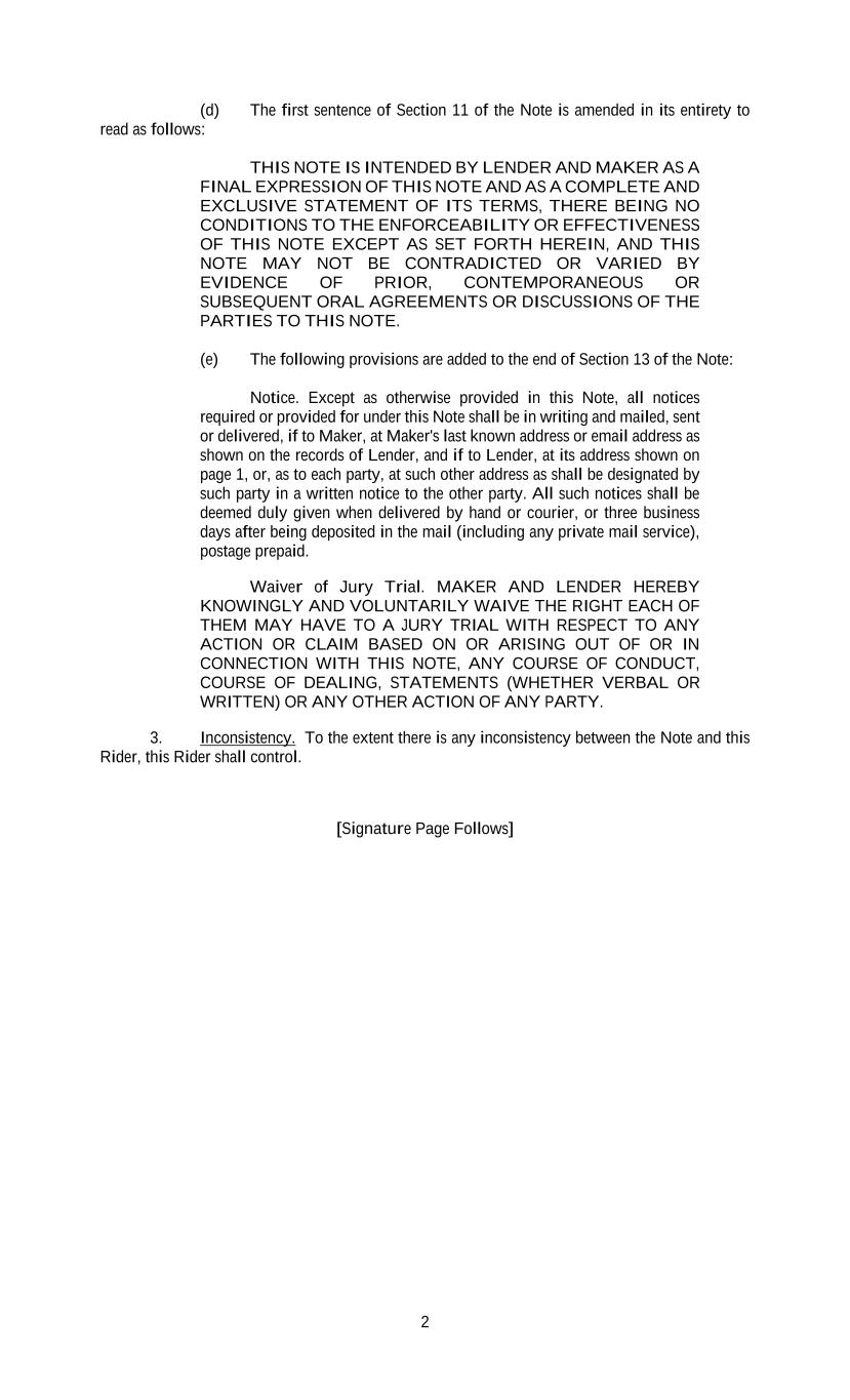 2 (d) The first sentence of Section 11 of the Note is amended in its entirety to read as follows: THIS NOTE IS INTENDED BY LENDER AND MAKER AS A FINAL EXPRESSION OF THIS NOTE AND AS A COMPLETE AND EXCLUSIVE STATEMENT OF ITS TERMS, THERE BEING NO CONDITIONS TO THE ENFORCEABILITY OR EFFECTIVENESS OF THIS NOTE EXCEPT AS SET FORTH HEREIN, AND THIS NOTE MAY NOT BE CONTRADICTED OR VARIED BY EVIDENCE OF PRIOR, CONTEMPORANEOUS OR SUBSEQUENT ORAL AGREEMENTS OR DISCUSSIONS OF THE PARTIES TO THIS NOTE. (e) The following provisions are added to the end of Section 13 of the Note: Notice. Except as otherwise provided in this Note, all notices required or provided for under this Note shall be in writing and mailed, sent or delivered, if to Maker, at Maker's last known address or email address as shown on the records of Lender, and if to Lender, at its address shown on page 1, or, as to each party, at such other address as shall be designated by such party in a written notice to the other party. All such notices shall be deemed duly given when delivered by hand or courier, or three business days after being deposited in the mail (including any private mail service), postage prepaid. Waiver of Jury Trial. MAKER AND LENDER HEREBY KNOWINGLY AND VOLUNTARILY WAIVE THE RIGHT EACH OF THEM MAY HAVE TO A JURY TRIAL WITH RESPECT TO ANY ACTION OR CLAIM BASED ON OR ARISING OUT OF OR IN CONNECTION WITH THIS NOTE, ANY COURSE OF CONDUCT, COURSE OF DEALING, STATEMENTS (WHETHER VERBAL OR WRITTEN) OR ANY OTHER ACTION OF ANY PARTY. 3. Inconsistency. To the extent there is any inconsistency between the Note and this Rider, this Rider shall control. [Signature Page Follows]