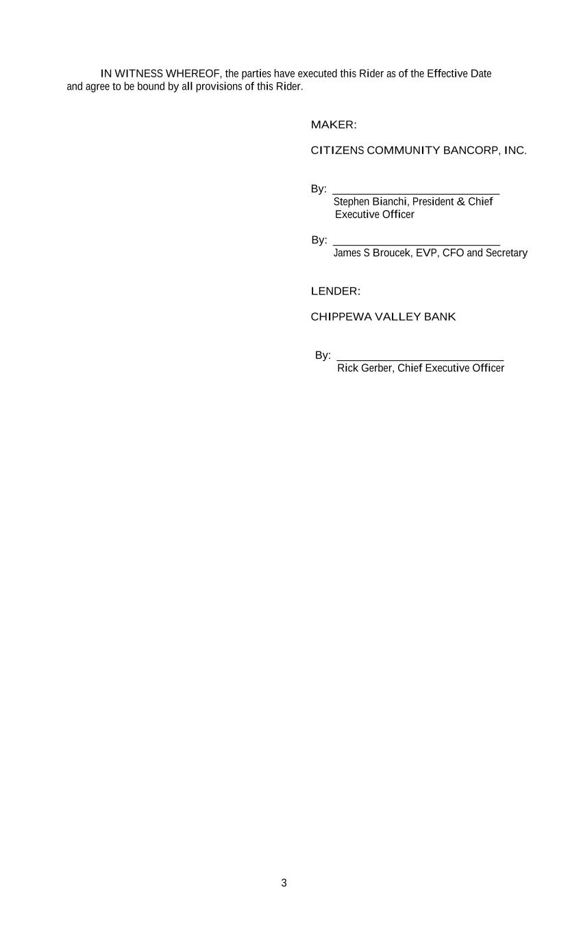 3 IN WITNESS WHEREOF, the parties have executed this Rider as of the Effective Date and agree to be bound by all provisions of this Rider. MAKER: CITIZENS COMMUNITY BANCORP, INC. By: ______________________________ Stephen Bianchi, President & Chief Executive Officer By: ______________________________ James S Broucek, EVP, CFO and Secretary LENDER: CHIPPEWA VALLEY BANK By: ______________________________ Rick Gerber, Chief Executive Officer