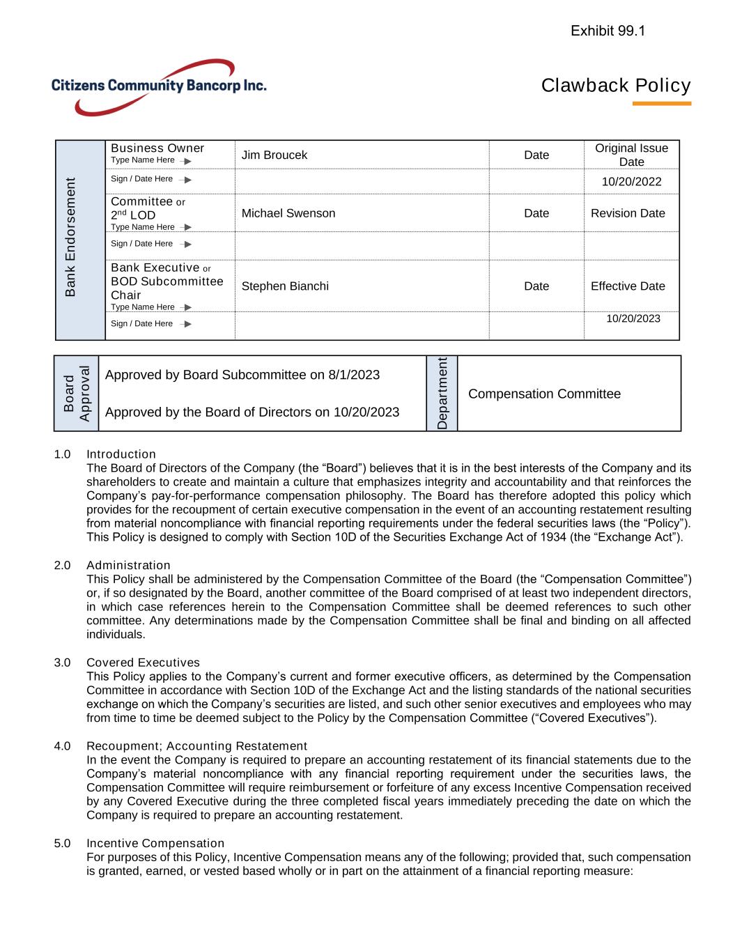 Clawback Policy 1.0 Introduction The Board of Directors of the Company (the “Board”) believes that it is in the best interests of the Company and its shareholders to create and maintain a culture that emphasizes integrity and accountability and that reinforces the Company’s pay-for-performance compensation philosophy. The Board has therefore adopted this policy which provides for the recoupment of certain executive compensation in the event of an accounting restatement resulting from material noncompliance with financial reporting requirements under the federal securities laws (the “Policy”). This Policy is designed to comply with Section 10D of the Securities Exchange Act of 1934 (the “Exchange Act”). 2.0 Administration This Policy shall be administered by the Compensation Committee of the Board (the “Compensation Committee”) or, if so designated by the Board, another committee of the Board comprised of at least two independent directors, in which case references herein to the Compensation Committee shall be deemed references to such other committee. Any determinations made by the Compensation Committee shall be final and binding on all affected individuals. 3.0 Covered Executives This Policy applies to the Company’s current and former executive officers, as determined by the Compensation Committee in accordance with Section 10D of the Exchange Act and the listing standards of the national securities exchange on which the Company’s securities are listed, and such other senior executives and employees who may from time to time be deemed subject to the Policy by the Compensation Committee (“Covered Executives”). 4.0 Recoupment; Accounting Restatement In the event the Company is required to prepare an accounting restatement of its financial statements due to the Company’s material noncompliance with any financial reporting requirement under the securities laws, the Compensation Committee will require reimbursement or forfeiture of any excess Incentive Compensation received by any Covered Executive during the three completed fiscal years immediately preceding the date on which the Company is required to prepare an accounting restatement. 5.0 Incentive Compensation For purposes of this Policy, Incentive Compensation means any of the following; provided that, such compensation is granted, earned, or vested based wholly or in part on the attainment of a financial reporting measure: B a n k E n d o rs e m e n t Business Owner Type Name Here Jim Broucek Date Original Issue Date Sign / Date Here 10/20/2022 Committee or 2nd LOD Type Name Here Michael Swenson Date Revision Date Sign / Date Here Bank Executive or BOD Subcommittee Chair Type Name Here Stephen Bianchi Date Effective Date Sign / Date Here 10/20/2023 B o a rd A p p ro v a l Approved by Board Subcommittee on 8/1/2023 D e p a rt m e n t Compensation Committee Approved by the Board of Directors on 10/20/2023 Exhibit 99.1