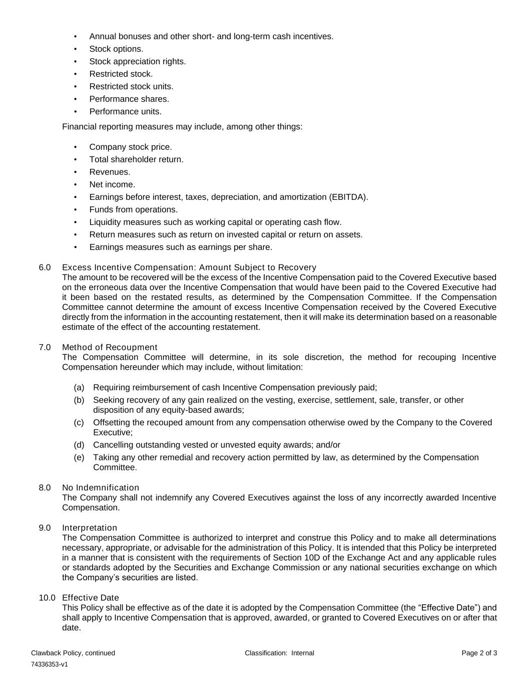 74336353-v1 Clawback Policy, continued Classification: Internal Page 2 of 3 • Annual bonuses and other short- and long-term cash incentives. • Stock options. • Stock appreciation rights. • Restricted stock. • Restricted stock units. • Performance shares. • Performance units. Financial reporting measures may include, among other things: • Company stock price. • Total shareholder return. • Revenues. • Net income. • Earnings before interest, taxes, depreciation, and amortization (EBITDA). • Funds from operations. • Liquidity measures such as working capital or operating cash flow. • Return measures such as return on invested capital or return on assets. • Earnings measures such as earnings per share. 6.0 Excess Incentive Compensation: Amount Subject to Recovery The amount to be recovered will be the excess of the Incentive Compensation paid to the Covered Executive based on the erroneous data over the Incentive Compensation that would have been paid to the Covered Executive had it been based on the restated results, as determined by the Compensation Committee. If the Compensation Committee cannot determine the amount of excess Incentive Compensation received by the Covered Executive directly from the information in the accounting restatement, then it will make its determination based on a reasonable estimate of the effect of the accounting restatement. 7.0 Method of Recoupment The Compensation Committee will determine, in its sole discretion, the method for recouping Incentive Compensation hereunder which may include, without limitation: (a) Requiring reimbursement of cash Incentive Compensation previously paid; (b) Seeking recovery of any gain realized on the vesting, exercise, settlement, sale, transfer, or other disposition of any equity-based awards; (c) Offsetting the recouped amount from any compensation otherwise owed by the Company to the Covered Executive; (d) Cancelling outstanding vested or unvested equity awards; and/or (e) Taking any other remedial and recovery action permitted by law, as determined by the Compensation Committee. 8.0 No Indemnification The Company shall not indemnify any Covered Executives against the loss of any incorrectly awarded Incentive Compensation. 9.0 Interpretation The Compensation Committee is authorized to interpret and construe this Policy and to make all determinations necessary, appropriate, or advisable for the administration of this Policy. It is intended that this Policy be interpreted in a manner that is consistent with the requirements of Section 10D of the Exchange Act and any applicable rules or standards adopted by the Securities and Exchange Commission or any national securities exchange on which the Company’s securities are listed. 10.0 Effective Date This Policy shall be effective as of the date it is adopted by the Compensation Committee (the “Effective Date”) and shall apply to Incentive Compensation that is approved, awarded, or granted to Covered Executives on or after that date.