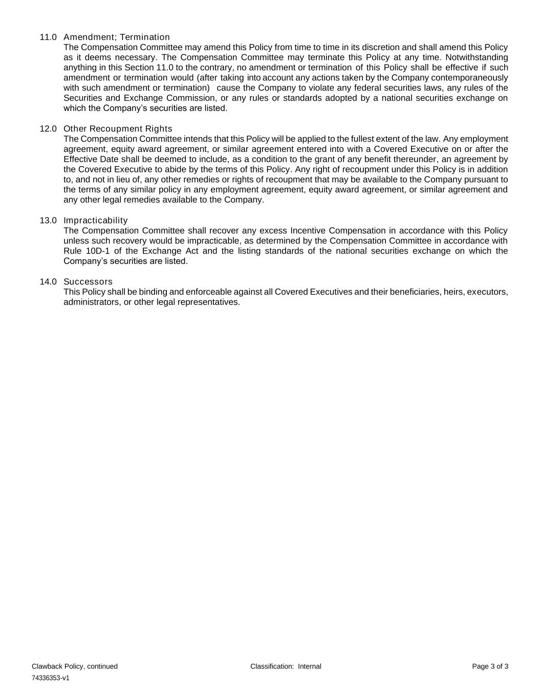 74336353-v1 Clawback Policy, continued Classification: Internal Page 3 of 3 11.0 Amendment; Termination The Compensation Committee may amend this Policy from time to time in its discretion and shall amend this Policy as it deems necessary. The Compensation Committee may terminate this Policy at any time. Notwithstanding anything in this Section 11.0 to the contrary, no amendment or termination of this Policy shall be effective if such amendment or termination would (after taking into account any actions taken by the Company contemporaneously with such amendment or termination) cause the Company to violate any federal securities laws, any rules of the Securities and Exchange Commission, or any rules or standards adopted by a national securities exchange on which the Company’s securities are listed. 12.0 Other Recoupment Rights The Compensation Committee intends that this Policy will be applied to the fullest extent of the law. Any employment agreement, equity award agreement, or similar agreement entered into with a Covered Executive on or after the Effective Date shall be deemed to include, as a condition to the grant of any benefit thereunder, an agreement by the Covered Executive to abide by the terms of this Policy. Any right of recoupment under this Policy is in addition to, and not in lieu of, any other remedies or rights of recoupment that may be available to the Company pursuant to the terms of any similar policy in any employment agreement, equity award agreement, or similar agreement and any other legal remedies available to the Company. 13.0 Impracticability The Compensation Committee shall recover any excess Incentive Compensation in accordance with this Policy unless such recovery would be impracticable, as determined by the Compensation Committee in accordance with Rule 10D-1 of the Exchange Act and the listing standards of the national securities exchange on which the Company’s securities are listed. 14.0 Successors This Policy shall be binding and enforceable against all Covered Executives and their beneficiaries, heirs, executors, administrators, or other legal representatives.