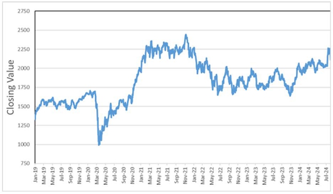 The following graph sets forth the historical performance of the RTY based on the daily historical closing values from January 1, 2019 through August 2, 2024. We obtained the closing values below from Bloomberg. We have not undertaken any independent review of, or made any due diligence inquiry with respect to, the information obtained from Bloomberg.