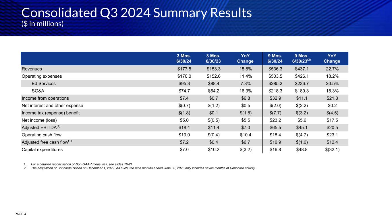 Consolidated Q3 2024 Highlights Q3 2024 Revenue $177.5 million Net Income $5.0 million Adjusted EBITDA $18.4 million Diluted Earnings Per Share $0.09 PAGE 3 ■ Delivered Q3 results that met or exceeded expectations for all key metrics. ■ New student starts of 5,567 representing 5.0% growth versus the prior year period, with UTI seeing the impact of timing shifts between June and July which resulted in a 12.5% decline year over year, and Concorde benefiting from timing shifts of clinical start opportunities between the third and fourth quarters, resulting in an increase of 34.8% year over year. ■ Revenue of $177.5 million representing 15.8% growth versus the prior year period, with UTI and Concorde achieving 16.1% and 15.0% growth, respectively. ■ Significant increases in key profitability measures year over year, with a net loss in the prior year period and Adjusted EBITDA increasing by 61%. ■ $149 million of total liquidity (including $33 million of revolver capacity) provides ample available funds for any potential business needs or new opportunities that may arise. ■ Reiterated confidence in previously increased FY2024 guidance ranges, noting Revenue and New Student Starts are trending towards the higher end. ■ The Company also announced 5-year strategic targets with a Revenue CAGR of ~10% and Adjusted EBITDA margin approaching 20% by FY2029. See Company press release dated 8/5/2024