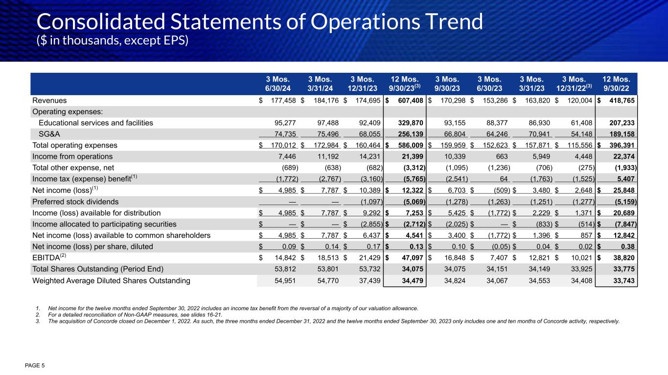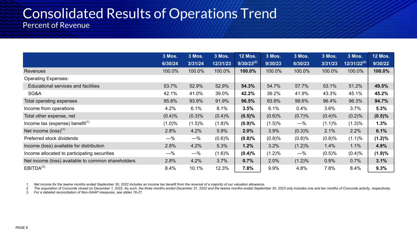 Consolidated Statements of Operations Trend ($ in thousands, except EPS) 3 Mos. 6/30/24 3 Mos. 3/31/24 3 Mos. 12/31/23 12 Mos. 9/30/23(3) 3 Mos. 9/30/23 3 Mos. 6/30/23 3 Mos. 3/31/23 3 Mos. 12/31/22(3) 12 Mos. 9/30/22 Revenues $ 177,458 $ 184,176 $ 174,695 $ 607,408 $ 170,298 $ 153,286 $ 163,820 $ 120,004 $ 418,765 Operating expenses: Educational services and facilities 95,277 97,488 92,409 329,870 93,155 88,377 86,930 61,408 207,233 SG&A 74,735 75,496 68,055 256,139 66,804 64,246 70,941 54,148 189,158 Total operating expenses $ 170,012 $ 172,984 $ 160,464 $ 586,009 $ 159,959 $ 152,623 $ 157,871 $ 115,556 $ 396,391 Income from operations 7,446 11,192 14,231 21,399 10,339 663 5,949 4,448 22,374 Total other expense, net (689) (638) (682) (3,312) (1,095) (1,236) (706) (275) (1,933) Income tax (expense) benefit(1) (1,772) (2,767) (3,160) (5,765) (2,541) 64 (1,763) (1,525) 5,407 Net income (loss)(1) $ 4,985 $ 7,787 $ 10,389 $ 12,322 $ 6,703 $ (509) $ 3,480 $ 2,648 $ 25,848 Preferred stock dividends — — (1,097) (5,069) (1,278) (1,263) (1,251) (1,277) (5,159) Income (loss) available for distribution $ 4,985 $ 7,787 $ 9,292 $ 7,253 $ 5,425 $ (1,772) $ 2,229 $ 1,371 $ 20,689 Income allocated to participating securities $ — $ — $ (2,855) $ (2,712) $ (2,025) $ — $ (833) $ (514) $ (7,847) Net income (loss) available to common shareholders $ 4,985 $ 7,787 $ 6,437 $ 4,541 $ 3,400 $ (1,772) $ 1,396 $ 857 $ 12,842 Net income (loss) per share, diluted $ 0.09 $ 0.14 $ 0.17 $ 0.13 $ 0.10 $ (0.05) $ 0.04 $ 0.02 $ 0.38 EBITDA(2) $ 14,842 $ 18,513 $ 21,429 $ 47,097 $ 16,848 $ 7,407 $ 12,821 $ 10,021 $ 38,820 Total Shares Outstanding (Period End) 53,812 53,801 53,732 34,075 34,075 34,151 34,149 33,925 33,775 Weighted Average Diluted Shares Outstanding 54,951 54,770 37,439 34,479 34,824 34,067 34,553 34,408 33,743 PAGE 5 1. Net income for the twelve months ended September 30, 2022 includes an income tax benefit from the reversal of a majority of our valuation allowance. 2. For a detailed reconciliation of Non-GAAP measures, see slides 16-21. 3. The acquisition of Concorde closed on December 1, 2022. As such, the three months ended December 31, 2022 and the twelve months ended September 30, 2023 only includes one and ten months of Concorde activity, respectively.