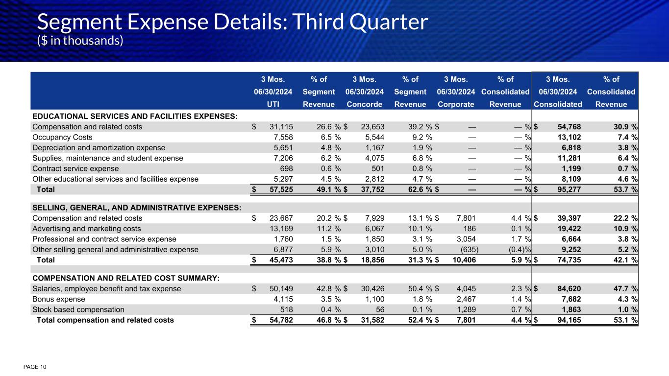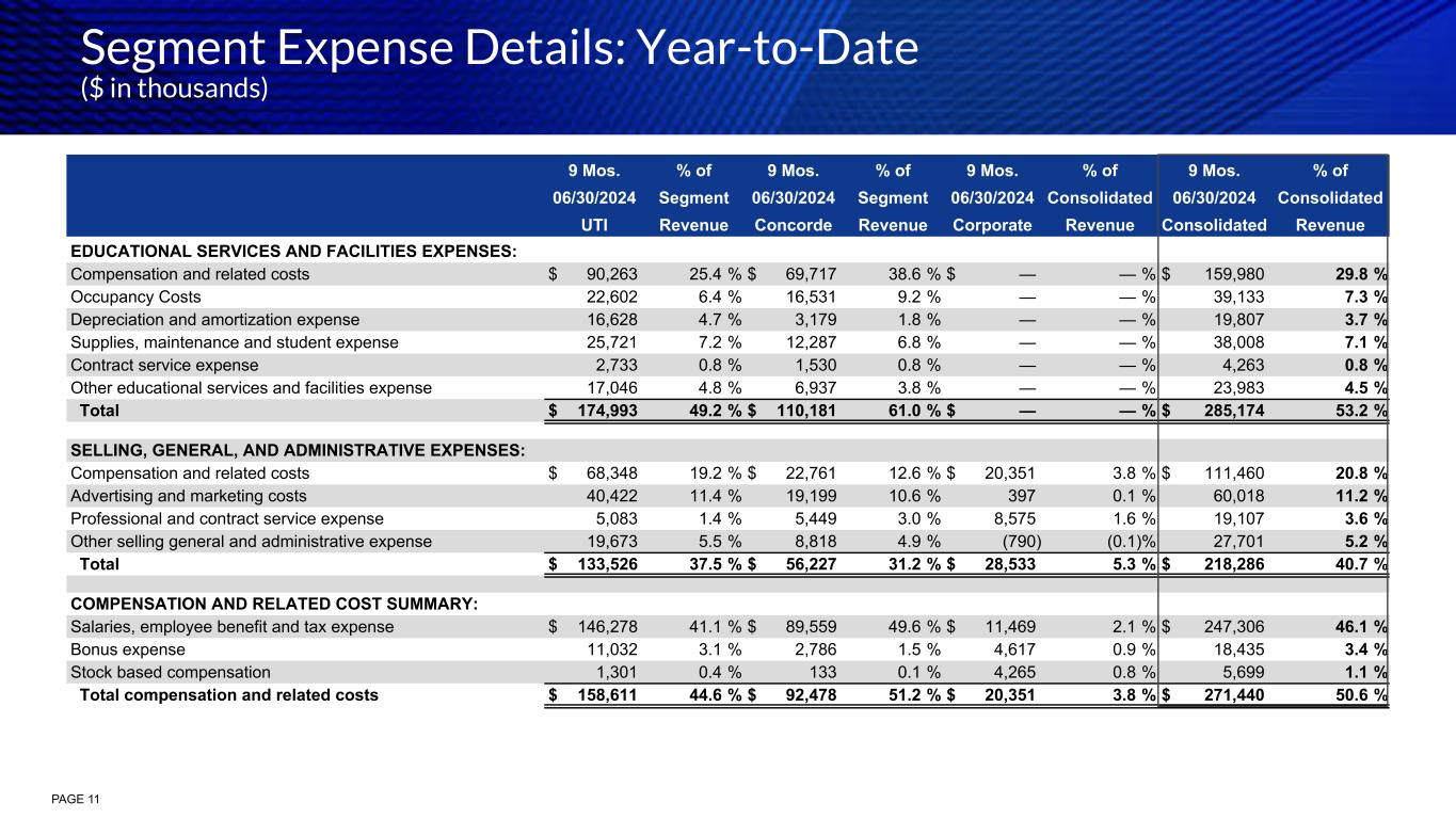 Segment Expense Details: Third Quarter ($ in thousands) 3 Mos. % of 3 Mos. % of 3 Mos. % of 3 Mos. % of 06/30/2024 Segment 06/30/2024 Segment 06/30/2024 Consolidated 06/30/2024 Consolidated UTI Revenue Concorde Revenue Corporate Revenue Consolidated Revenue EDUCATIONAL SERVICES AND FACILITIES EXPENSES: Compensation and related costs $ 31,115 26.6 % $ 23,653 39.2 % $ — — % $ 54,768 30.9 % Occupancy Costs 7,558 6.5 % 5,544 9.2 % — — % 13,102 7.4 % Depreciation and amortization expense 5,651 4.8 % 1,167 1.9 % — — % 6,818 3.8 % Supplies, maintenance and student expense 7,206 6.2 % 4,075 6.8 % — — % 11,281 6.4 % Contract service expense 698 0.6 % 501 0.8 % — — % 1,199 0.7 % Other educational services and facilities expense 5,297 4.5 % 2,812 4.7 % — — % 8,109 4.6 % Total $ 57,525 49.1 % $ 37,752 62.6 % $ — — % $ 95,277 53.7 % SELLING, GENERAL, AND ADMINISTRATIVE EXPENSES: Compensation and related costs $ 23,667 20.2 % $ 7,929 13.1 % $ 7,801 4.4 % $ 39,397 22.2 % Advertising and marketing costs 13,169 11.2 % 6,067 10.1 % 186 0.1 % 19,422 10.9 % Professional and contract service expense 1,760 1.5 % 1,850 3.1 % 3,054 1.7 % 6,664 3.8 % Other selling general and administrative expense 6,877 5.9 % 3,010 5.0 % (635) (0.4) % 9,252 5.2 % Total $ 45,473 38.8 % $ 18,856 31.3 % $ 10,406 5.9 % $ 74,735 42.1 % COMPENSATION AND RELATED COST SUMMARY: Salaries, employee benefit and tax expense $ 50,149 42.8 % $ 30,426 50.4 % $ 4,045 2.3 % $ 84,620 47.7 % Bonus expense 4,115 3.5 % 1,100 1.8 % 2,467 1.4 % 7,682 4.3 % Stock based compensation 518 0.4 % 56 0.1 % 1,289 0.7 % 1,863 1.0 % Total compensation and related costs $ 54,782 46.8 % $ 31,582 52.4 % $ 7,801 4.4 % $ 94,165 53.1 % PAGE 10