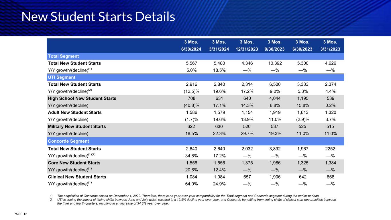 New Student Starts Details 3 Mos. 3 Mos. 3 Mos. 3 Mos. 3 Mos. 3 Mos. 6/30/2024 3/31/2024 12/31/2023 9/30/2023 6/30/2023 3/31/2023 Total Segment Total New Student Starts 5,567 5,480 4,346 10,392 5,300 4,626 Y/Y growth/(decline)(1) 5.0% 18.5% —% —% —% —% UTI Segment Total New Student Starts 2,916 2,840 2,314 6,500 3,333 2,374 Y/Y growth/(decline)(2) (12.5)% 19.6% 17.2% 9.0% 5.3% 4.4% High School New Student Starts 708 631 640 4,044 1,195 539 Y/Y growth/(decline) (40.8)% 17.1% 14.3% 6.8% 15.8% 0.2% Adult New Student Starts 1,586 1,579 1,154 1,919 1,613 1,320 Y/Y growth/(decline) (1.7)% 19.6% 13.9% 11.0% (2.9)% 3.7% Military New Student Starts 622 630 520 537 525 515 Y/Y growth/(decline) 18.5% 22.3% 29.7% 19.3% 11.0% 11.0% Concorde Segment Total New Student Starts 2,640 2,640 2,032 3,892 1,967 2252 Y/Y growth/(decline)(1)(2) 34.8% 17.2% —% —% —% —% Core New Student Starts 1,556 1,556 1,375 1,986 1,325 1,384 Y/Y growth/(decline)(1) 20.6% 12.4% —% —% —% —% Clinical New Student Starts 1,084 1,084 657 1,906 642 868 Y/Y growth/(decline)(1) 64.0% 24.9% —% —% —% —% PAGE 12 1. The acquisition of Concorde closed on December 1, 2022. Therefore, there is no year-over-year comparability for the Total segment and Concorde segment during the earlier periods. 2. UTI is seeing the impact of timing shifts between June and July which resulted in a 12.5% decline year over year, and Concorde benefiting from timing shifts of clinical start opportunities between the third and fourth quarters, resulting in an increase of 34.8% year over year.