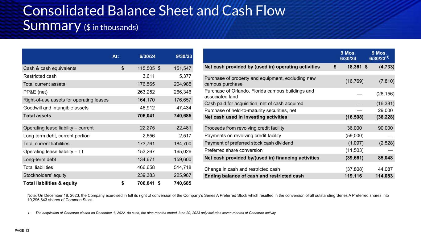 Consolidated Balance Sheet and Cash Flow Summary ($ in thousands) At: 6/30/24 9/30/23 Cash & cash equivalents $ 115,505 $ 151,547 Restricted cash 3,611 5,377 Total current assets 176,565 204,985 PP&E (net) 263,252 266,346 Right-of-use assets for operating leases 164,170 176,657 Goodwill and intangible assets 46,912 47,434 Total assets 706,041 740,685 Operating lease liability – current 22,275 22,481 Long term debt, current portion 2,656 2,517 Total current liabilities 173,761 184,700 Operating lease liability – LT 153,267 165,026 Long-term debt 134,671 159,600 Total liabilities 466,658 514,718 Stockholders’ equity 239,383 225,967 Total liabilities & equity $ 706,041 $ 740,685 9 Mos. 6/30/24 9 Mos. 6/30/23(1) Net cash provided by (used in) operating activities $ 18,361 $ (4,733) Purchase of property and equipment, excluding new campus purchase (16,769) (7,810) Purchase of Orlando, Florida campus buildings and associated land — (26,156) Cash paid for acquisition, net of cash acquired — (16,381) Purchase of held-to-maturity securities, net — 29,000 Net cash used in investing activities (16,508) (36,228) Proceeds from revolving credit facility 36,000 90,000 Payments on revolving credit facility (59,000) — Payment of preferred stock cash dividend (1,097) (2,528) Preferred share conversion (11,503) — Net cash provided by/(used in) financing activities (39,661) 85,048 Change in cash and restricted cash (37,808) 44,087 Ending balance of cash and restricted cash 119,116 114,083 PAGE 13 1. The acquisition of Concorde closed on December 1, 2022. As such, the nine months ended June 30, 2023 only includes seven months of Concorde activity. Note: On December 18, 2023, the Company exercised in full its right of conversion of the Company’s Series A Preferred Stock which resulted in the conversion of all outstanding Series A Preferred shares into 19,296,843 shares of Common Stock.