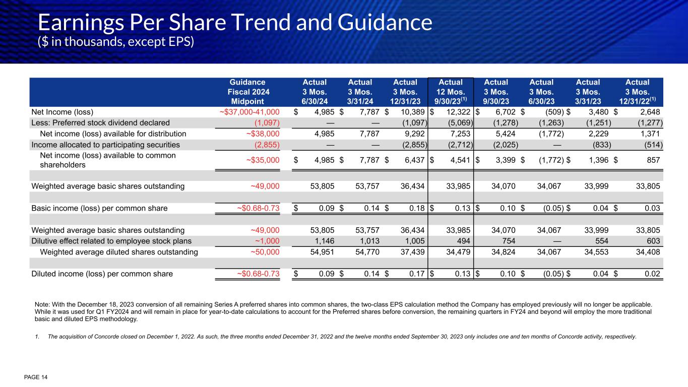 Earnings Per Share Trend and Guidance ($ in thousands, except EPS) Guidance Actual Actual Actual Actual Actual Actual Actual Actual Fiscal 2024 Midpoint 3 Mos. 6/30/24 3 Mos. 3/31/24 3 Mos. 12/31/23 12 Mos. 9/30/23(1) 3 Mos. 9/30/23 3 Mos. 6/30/23 3 Mos. 3/31/23 3 Mos. 12/31/22(1) Net Income (loss) ~$37,000-41,000 $ 4,985 $ 7,787 $ 10,389 $ 12,322 $ 6,702 $ (509) $ 3,480 $ 2,648 Less: Preferred stock dividend declared (1,097) — — (1,097) (5,069) (1,278) (1,263) (1,251) (1,277) Net income (loss) available for distribution ~$38,000 4,985 7,787 9,292 7,253 5,424 (1,772) 2,229 1,371 Income allocated to participating securities (2,855) — — (2,855) (2,712) (2,025) — (833) (514) Net income (loss) available to common shareholders ~$35,000 $ 4,985 $ 7,787 $ 6,437 $ 4,541 $ 3,399 $ (1,772) $ 1,396 $ 857 Weighted average basic shares outstanding ~49,000 53,805 53,757 36,434 33,985 34,070 34,067 33,999 33,805 Basic income (loss) per common share ~$0.68-0.73 $ 0.09 $ 0.14 $ 0.18 $ 0.13 $ 0.10 $ (0.05) $ 0.04 $ 0.03 Weighted average basic shares outstanding ~49,000 53,805 53,757 36,434 33,985 34,070 34,067 33,999 33,805 Dilutive effect related to employee stock plans ~1,000 1,146 1,013 1,005 494 754 — 554 603 Weighted average diluted shares outstanding ~50,000 54,951 54,770 37,439 34,479 34,824 34,067 34,553 34,408 Diluted income (loss) per common share ~$0.68-0.73 $ 0.09 $ 0.14 $ 0.17 $ 0.13 $ 0.10 $ (0.05) $ 0.04 $ 0.02 PAGE 14 1. The acquisition of Concorde closed on December 1, 2022. As such, the three months ended December 31, 2022 and the twelve months ended September 30, 2023 only includes one and ten months of Concorde activity, respectively. Note: With the December 18, 2023 conversion of all remaining Series A preferred shares into common shares, the two-class EPS calculation method the Company has employed previously will no longer be applicable. While it was used for Q1 FY2024 and will remain in place for year-to-date calculations to account for the Preferred shares before conversion, the remaining quarters in FY24 and beyond will employ the more traditional basic and diluted EPS methodology.