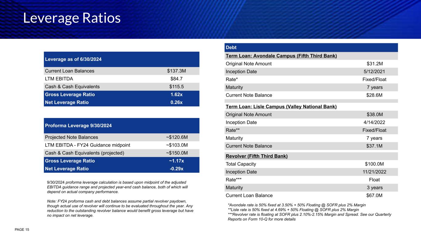Leverage as of 6/30/2024 Current Loan Balances $137.3M LTM EBITDA $84.7 Cash & Cash Equivalents $115.5 Gross Leverage Ratio 1.62x Net Leverage Ratio 0.26x Debt Term Loan: Avondale Campus (Fifth Third Bank) Original Note Amount $31.2M Inception Date 5/12/2021 Rate* Fixed/Float Maturity 7 years Current Note Balance $28.6M Term Loan: Lisle Campus (Valley National Bank) Original Note Amount $38.0M Inception Date 4/14/2022 Rate** Fixed/Float Maturity 7 years Current Note Balance $37.1M Revolver (Fifth Third Bank) Total Capacity $100.0M Inception Date 11/21/2022 Rate*** Float Maturity 3 years Current Loan Balance $67.0M 9/30/2024 proforma leverage calculation is based upon midpoint of the adjusted EBITDA guidance range and projected year-end cash balance, both of which will depend on actual company performance. Note: FY24 proforma cash and debt balances assume partial revolver paydown, though actual use of revolver will continue to be evaluated throughout the year. Any reduction to the outstanding revolver balance would benefit gross leverage but have no impact on net leverage. Leverage Ratios PAGE 15 *Avondale rate is 50% fixed at 3.50% + 50% Floating @ SOFR plus 2% Margin **Lisle rate is 50% fixed at 4.69% + 50% Floating @ SOFR plus 2% Margin ***Revolver rate is floating at SOFR plus 2.10%-2.15% Margin and Spread. See our Quarterly Reports on Form 10-Q for more details Proforma Leverage 9/30/2024 Projected Note Balances ~$120.6M LTM EBITDA - FY24 Guidance midpoint ~$103.0M Cash & Cash Equivalents (projected) ~$150.0M Gross Leverage Ratio ~1.17x Net Leverage Ratio -0.29x