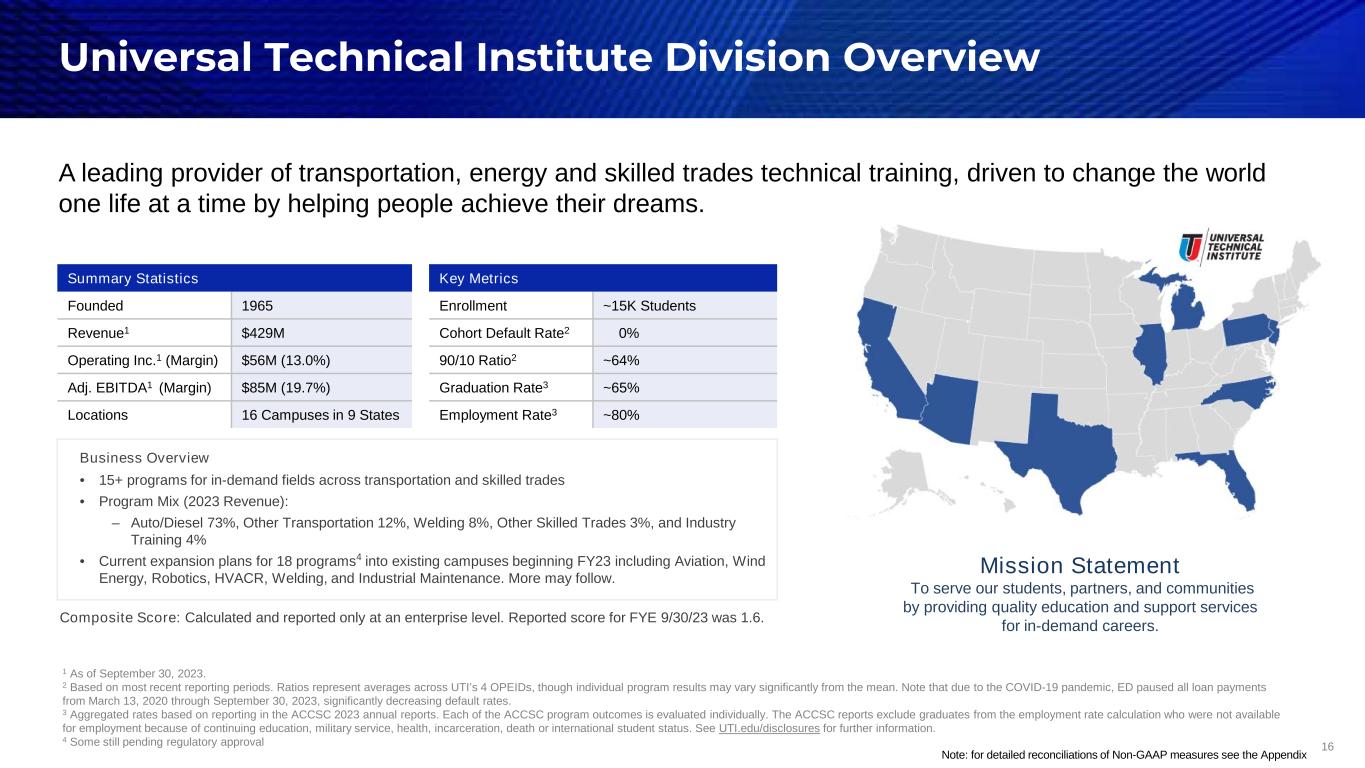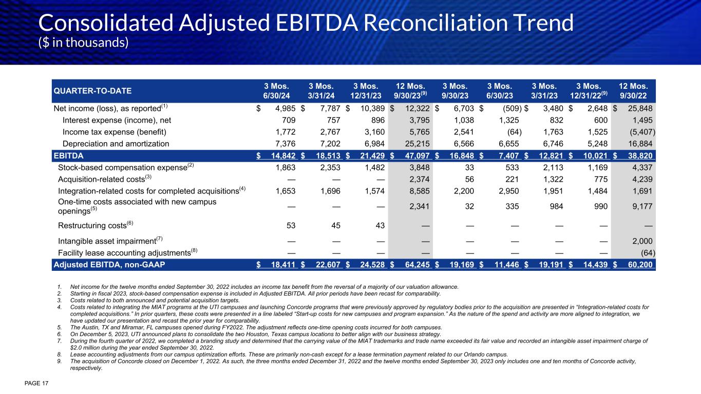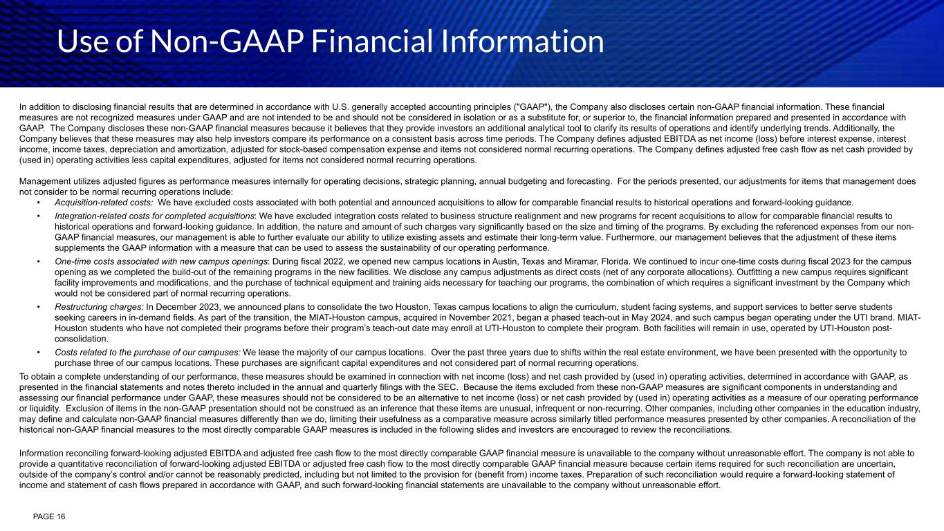 Use of Non-GAAP Financial Information PAGE 16 In addition to disclosing financial results that are determined in accordance with U.S. generally accepted accounting principles ("GAAP"), the Company also discloses certain non-GAAP financial information. These financial measures are not recognized measures under GAAP and are not intended to be and should not be considered in isolation or as a substitute for, or superior to, the financial information prepared and presented in accordance with GAAP. The Company discloses these non-GAAP financial measures because it believes that they provide investors an additional analytical tool to clarify its results of operations and identify underlying trends. Additionally, the Company believes that these measures may also help investors compare its performance on a consistent basis across time periods. The Company defines adjusted EBITDA as net income (loss) before interest expense, interest income, income taxes, depreciation and amortization, adjusted for stock-based compensation expense and items not considered normal recurring operations. The Company defines adjusted free cash flow as net cash provided by (used in) operating activities less capital expenditures, adjusted for items not considered normal recurring operations. Management utilizes adjusted figures as performance measures internally for operating decisions, strategic planning, annual budgeting and forecasting. For the periods presented, our adjustments for items that management does not consider to be normal recurring operations include: • Acquisition-related costs: We have excluded costs associated with both potential and announced acquisitions to allow for comparable financial results to historical operations and forward-looking guidance. • Integration-related costs for completed acquisitions: We have excluded integration costs related to business structure realignment and new programs for recent acquisitions to allow for comparable financial results to historical operations and forward-looking guidance. In addition, the nature and amount of such charges vary significantly based on the size and timing of the programs. By excluding the referenced expenses from our non- GAAP financial measures, our management is able to further evaluate our ability to utilize existing assets and estimate their long-term value. Furthermore, our management believes that the adjustment of these items supplements the GAAP information with a measure that can be used to assess the sustainability of our operating performance. • One-time costs associated with new campus openings: During fiscal 2022, we opened new campus locations in Austin, Texas and Miramar, Florida. We continued to incur one-time costs during fiscal 2023 for the campus opening as we completed the build-out of the remaining programs in the new facilities. We disclose any campus adjustments as direct costs (net of any corporate allocations). Outfitting a new campus requires significant facility improvements and modifications, and the purchase of technical equipment and training aids necessary for teaching our programs, the combination of which requires a significant investment by the Company which would not be considered part of normal recurring operations. • Restructuring charges: In December 2023, we announced plans to consolidate the two Houston, Texas campus locations to align the curriculum, student facing systems, and support services to better serve students seeking careers in in-demand fields. As part of the transition, the MIAT-Houston campus, acquired in November 2021, began a phased teach-out in May 2024, and such campus began operating under the UTI brand. MIAT- Houston students who have not completed their programs before their program’s teach-out date may enroll at UTI-Houston to complete their program. Both facilities will remain in use, operated by UTI-Houston post- consolidation. • Costs related to the purchase of our campuses: We lease the majority of our campus locations. Over the past three years due to shifts within the real estate environment, we have been presented with the opportunity to purchase three of our campus locations. These purchases are significant capital expenditures and not considered part of normal recurring operations. To obtain a complete understanding of our performance, these measures should be examined in connection with net income (loss) and net cash provided by (used in) operating activities, determined in accordance with GAAP, as presented in the financial statements and notes thereto included in the annual and quarterly filings with the SEC. Because the items excluded from these non-GAAP measures are significant components in understanding and assessing our financial performance under GAAP, these measures should not be considered to be an alternative to net income (loss) or net cash provided by (used in) operating activities as a measure of our operating performance or liquidity. Exclusion of items in the non-GAAP presentation should not be construed as an inference that these items are unusual, infrequent or non-recurring. Other companies, including other companies in the education industry, may define and calculate non-GAAP financial measures differently than we do, limiting their usefulness as a comparative measure across similarly titled performance measures presented by other companies. A reconciliation of the historical non-GAAP financial measures to the most directly comparable GAAP measures is included in the following slides and investors are encouraged to review the reconciliations. Information reconciling forward-looking adjusted EBITDA and adjusted free cash flow to the most directly comparable GAAP financial measure is unavailable to the company without unreasonable effort. The company is not able to provide a quantitative reconciliation of forward-looking adjusted EBITDA or adjusted free cash flow to the most directly comparable GAAP financial measure because certain items re
